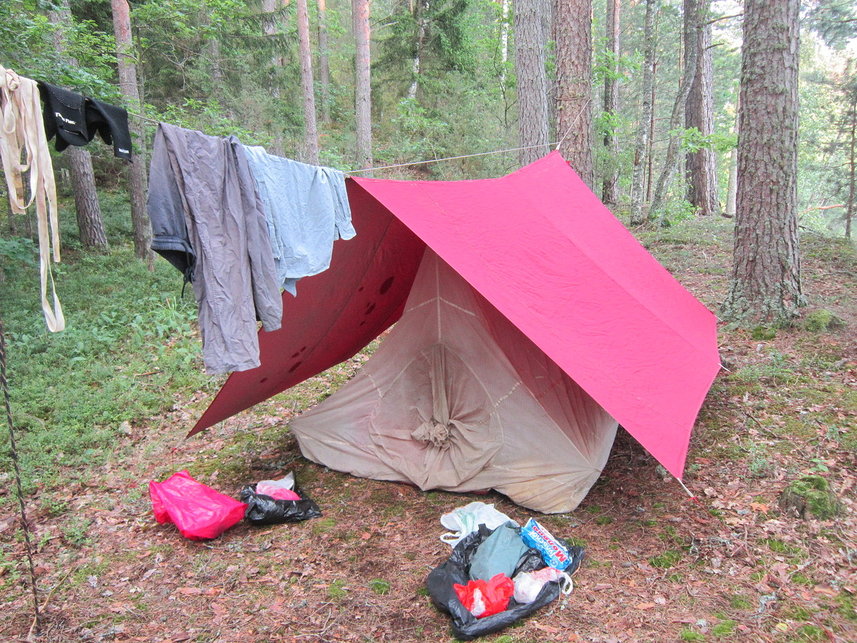 Правда есть один момент: из пончо дождевик получается не анатомичный, мешковатый, без застежки и без рукавов. Защита от ветра с косым дождем ~сомнительная. Для альпинизма и лазанья непригодно по понятным причинам. Мешковатость поначалу очень неудобна. Тент из пончо получается маленький, расценивать как основное убежище - только если ты ультра аскет среди ультра аскетов или это аварийный вариант.