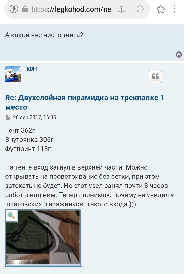 >>81101 > москитная сетка 82 грамма, футпринт 100гр и тент 300гр для пвд в хорошую погоду идеальный вариант Идеально это когда не нужно место для сна выбирать исходя из наличия и расположения деревьев. В хорошую погоду вообще тент не нужен, а в дождь мелкие тенты сосут, а большие неэффективно используют свою площадь и выходят больше палатки.