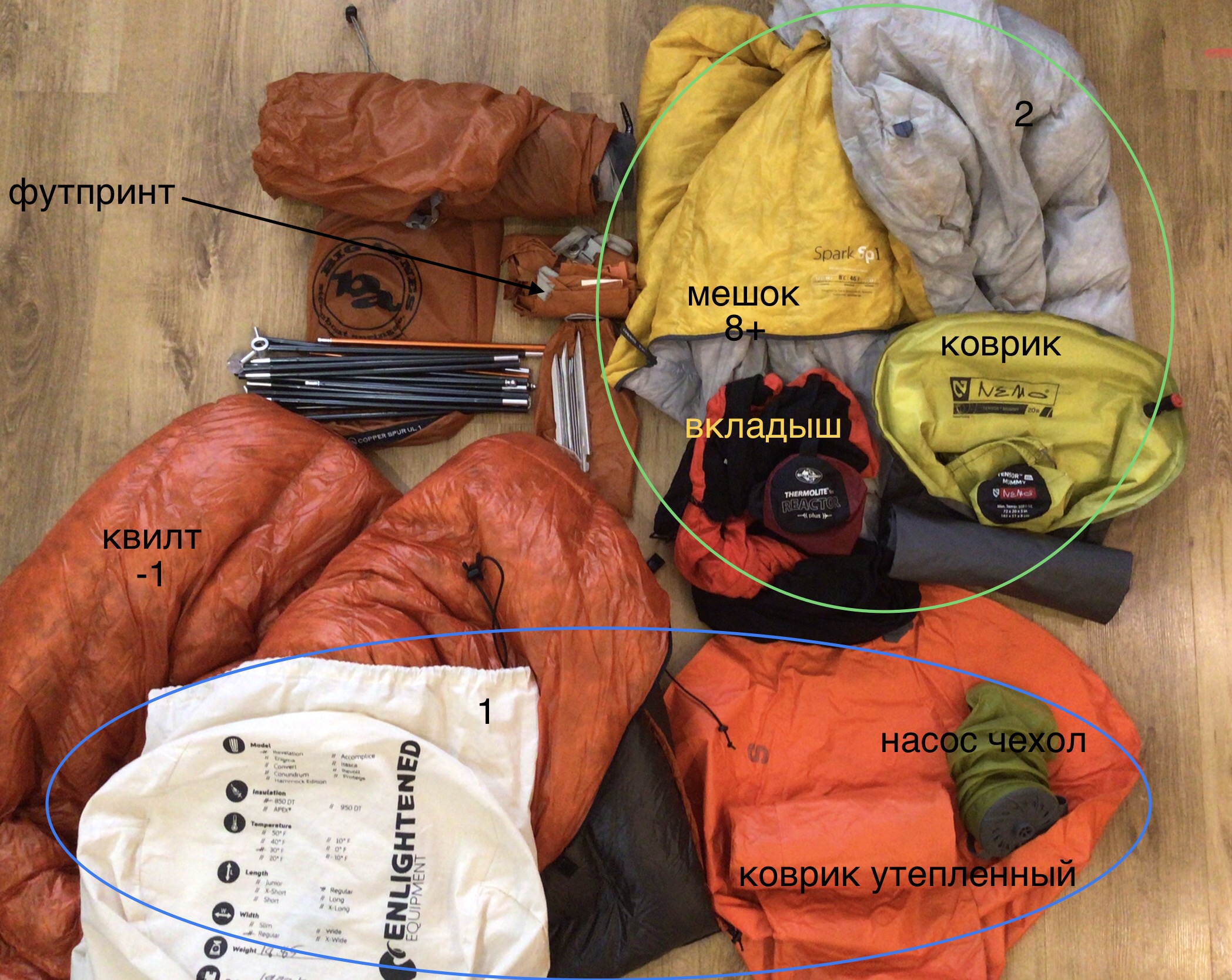 quilt - квилт - облегченный спальный мешок без спины, молнии и капюшона rain kilt - дождевой килт - непромокаемая юбка, защищающая ноги от сырой травы tarp-tent - смесь палатки и тарпа, палатка без стенок и дна, не плоский тент pot cozy - термос котелка - приспособа из пенки, утепляющая котелок для запаривания еды, сбережения топлива dyneema fiber composite , dcf , cuben - материал, композитный ламинат из пленки и uhmwp нитей: очень легкий, очень прочный, очень дорогой, очень похож на мусорный мешок