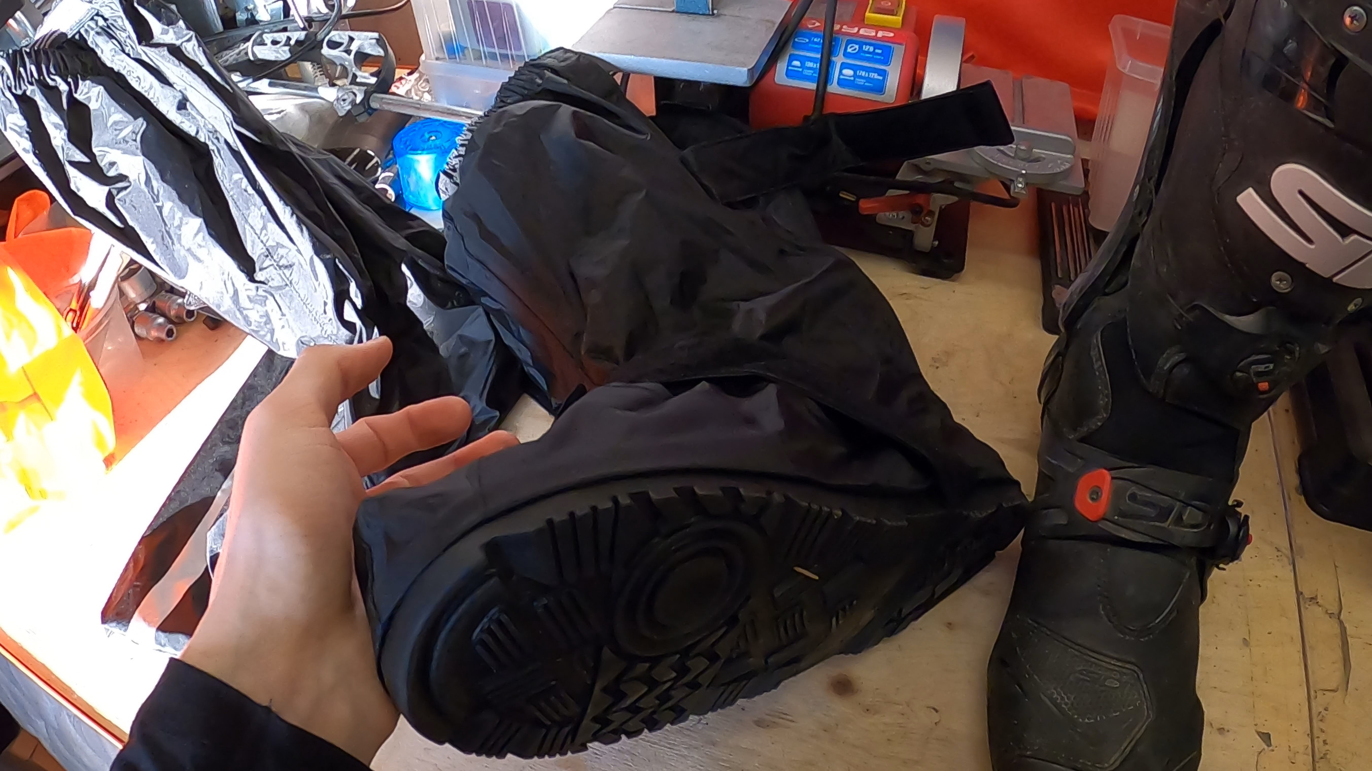 Обувь ногу 45 размера, кроксы для стоянки и бродов занимают 3 литра.