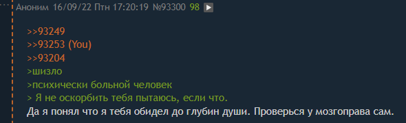 >>93249 >>93253 >>93204 >шизло >психически больной человек > Я не оскорбить тебя пытаюсь, если что. Да я понял что я тебя обидел до глубин души. Проверься у мозгоправа сам.