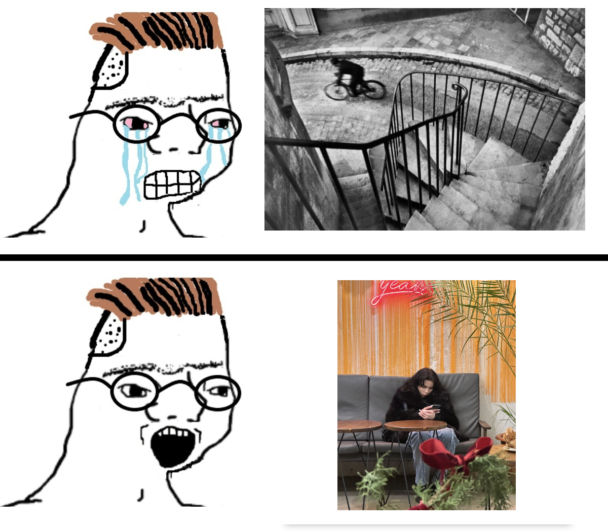 >>858094 > есть шанс задержать взгляд зрителя дольше, чем на мгновение; у банальной, безлюдной фотки угла дома такого шанса нет. Потому что быдлу интересно сравнивать себя с окружающими. Поэтому если их что-то и задевает, так это "что там у других" neuron activation.