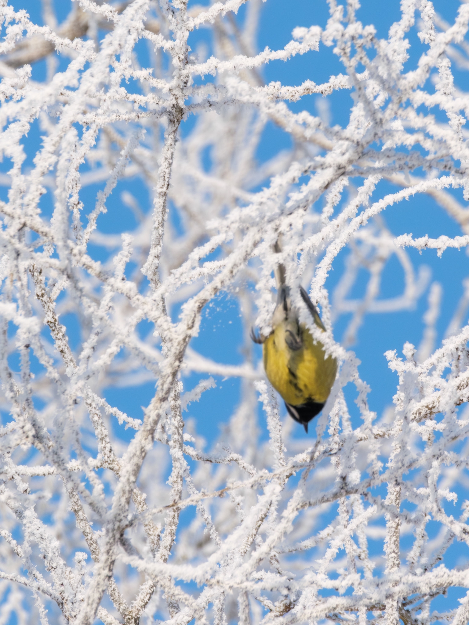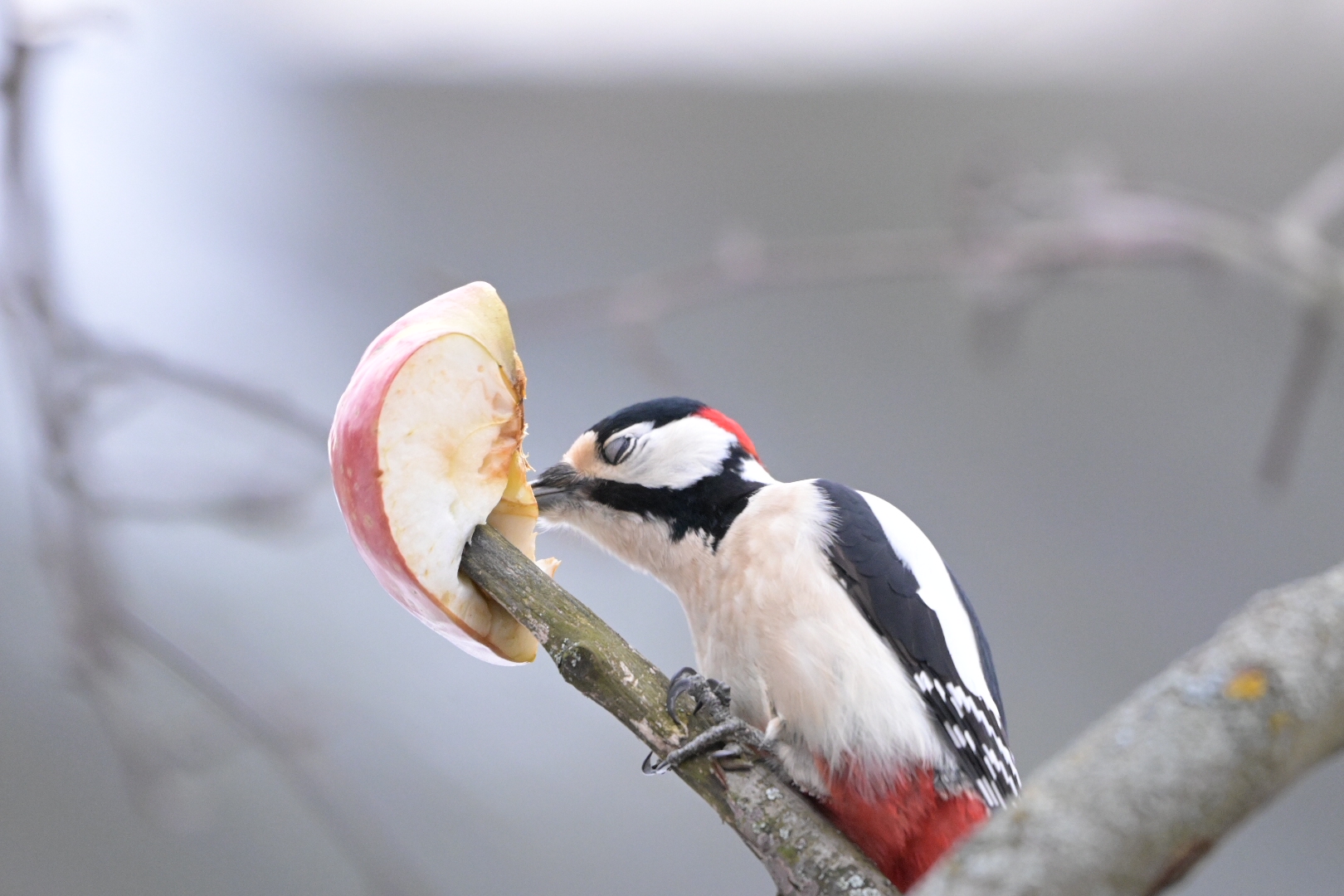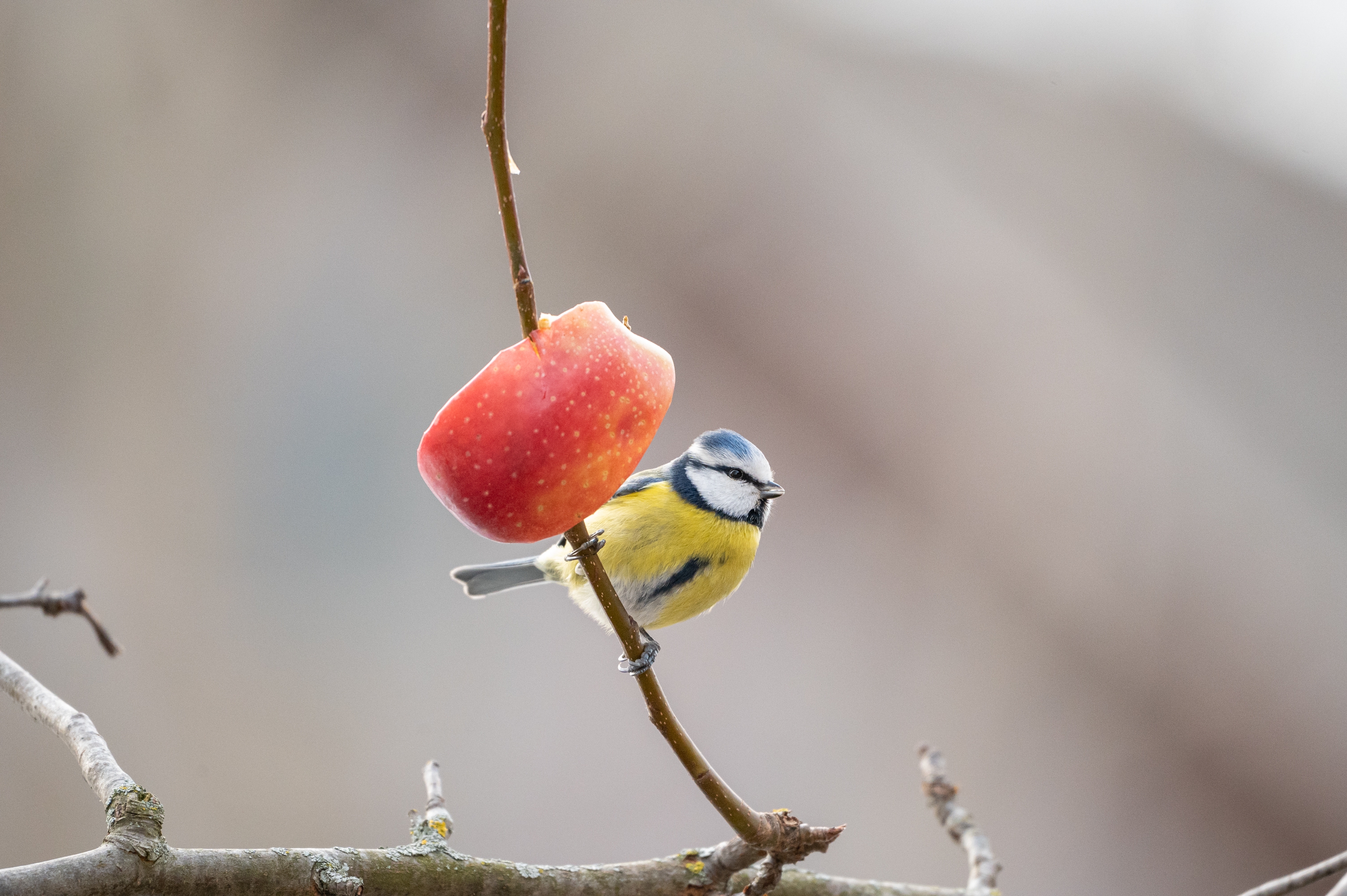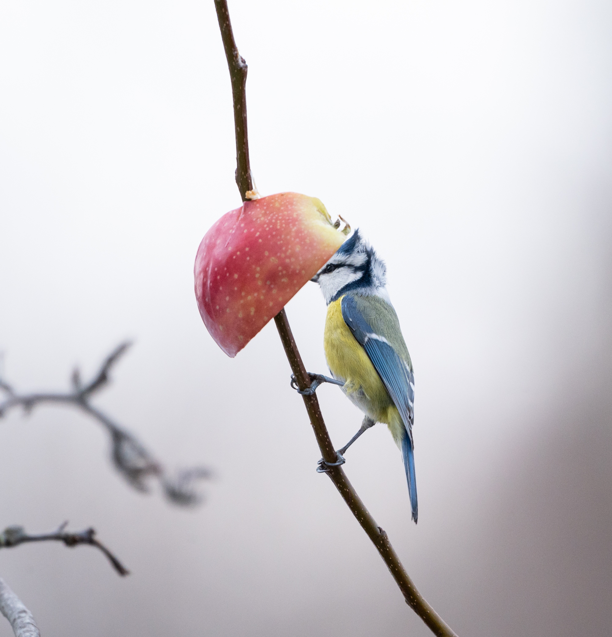 Синицы чота яблоки не уважают. Я так-то утром поссать выходил, слышал где-то свиристелей. Прям птица моей мечты. А предложить им в моем саду нечего, ягод нет никаких. Ну я яблок развесил. Яблоки пока не очень активно клюют только лазоревка и дятел. А у меня вот ещё мандарины и консервированные ананасы есть. Может тоже повесить?