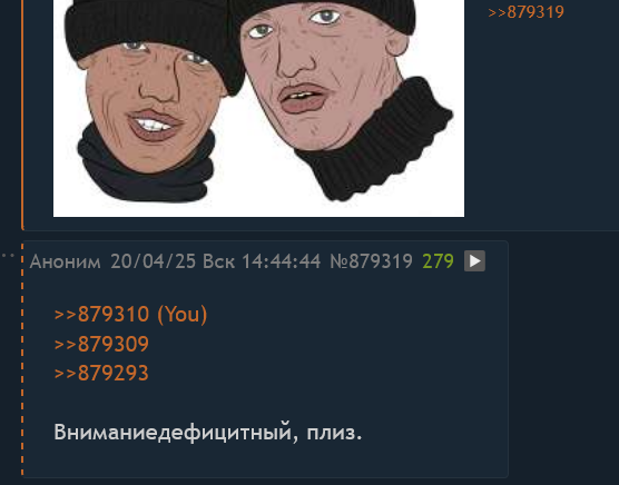 >>864413 >>864415 >два омежных ребенка, с едва пробивающимся пушком, сошлись на почве детской возрастной шизофрении и обсуждают в теории как могут привлечь к себе внимание если бы смогли совершить невозможное.