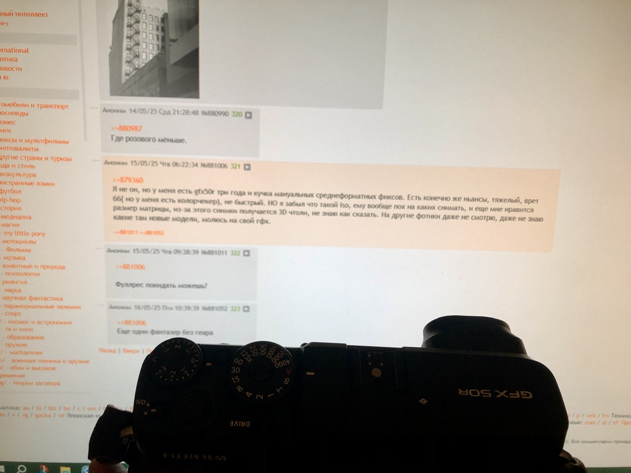 Если помните, был такой Angry Photographer, он же Theoria Apophasis, написал книжку про фуджифильм. Эталонный гиродрочер который в жизни ни одного коммерческого кадра не сделал. Так вот решил я посмотреть как-то его обзор на гфх100, а с него перейти на его же примеры тифок с него. И так и так он продавал что бля пацаны охуенный рисунок, охуенное разрешение, профессиональный инструмент для 10/10 профессионалов. И что я вижу на примерах? детский пересвет с клипанием всего белого и детский смаз по шевеленке, просто первый класс второе занятие фотошколы.