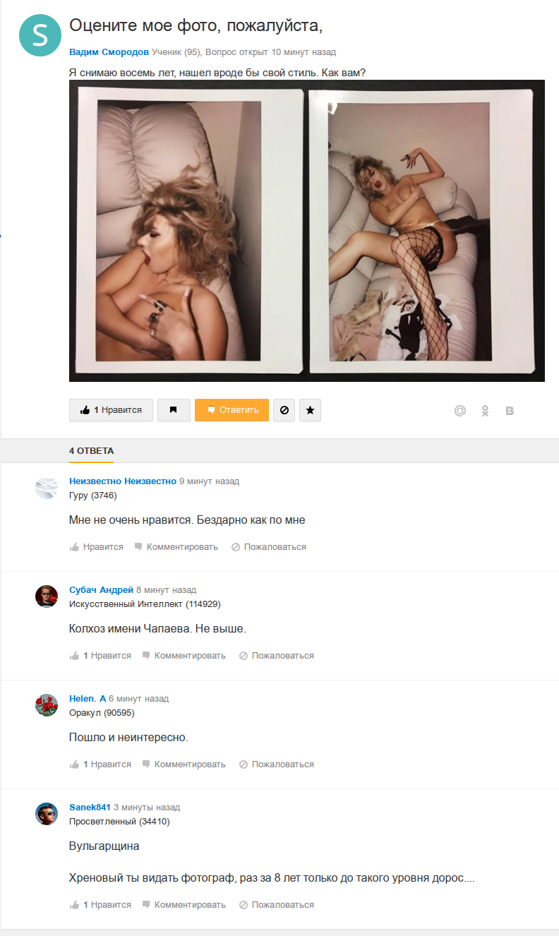 И вот нахуя, зачем, для чего? А эту фотку ты запомнил, ты обратил на неё внимание, ты активно горел, комментировал. Что еще нужно от арт объекта то? Искусство не обязано вызывать только положительные эмоции у зрителя. Вот тебе фотка не понравилась, но ты её запомнил, и даж активно обсуждал. Цель достигнута, произведение выделилось из охулиарда других картинок.