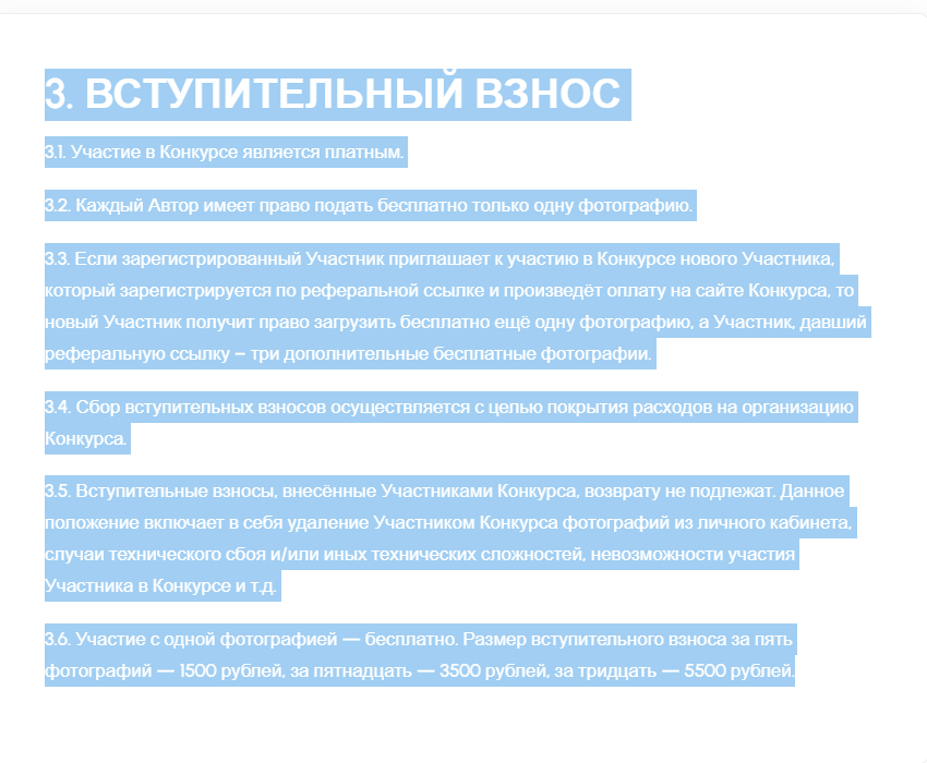 3.6. Участие с одной фотографией — бесплатно. Размер вступительного взноса за пять фотографий — 1500 рублей, за пятнадцать — 3500 рублей, за тридцать — 5500 рублей.