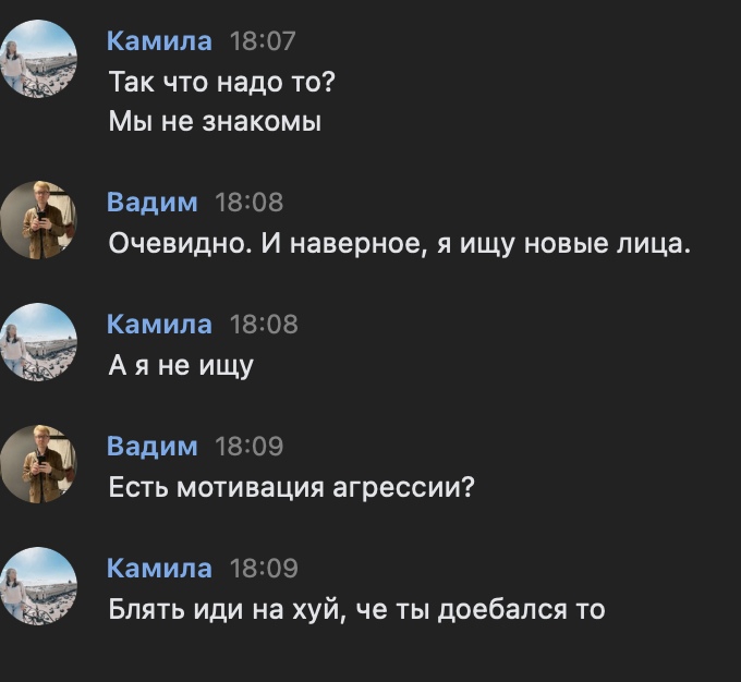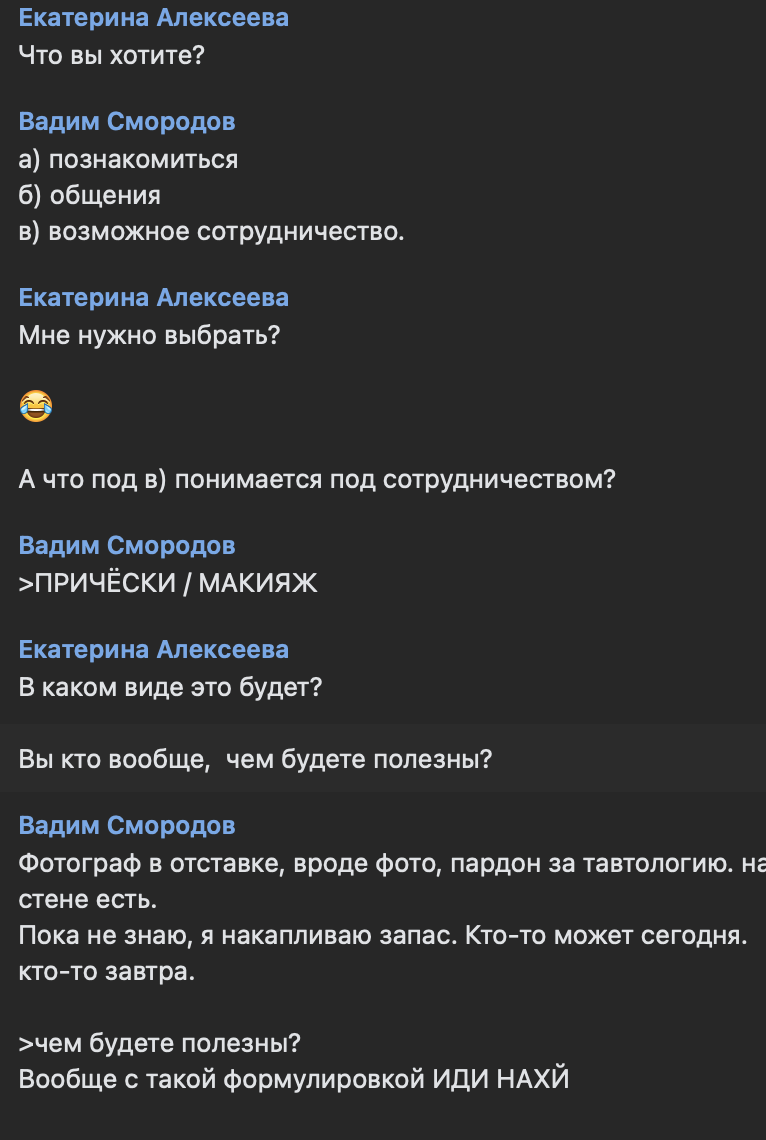 >>890272 >>890289 Сори с такими опенерами я бы тоже нахуй послал. Если хочешь на фото позвать то так и пиши, "привет, я ищу модель для фото, по твоему профилю мне показалось ты интересуешься темой, к тому же здорово выглядишь, не против посотрудничать? если мне лишь показалось, хорошего дня, не буду беспокоить :)" а не ребусы какие-то, абв сидели на трубе, "поиск новых лиц" что бы это не значило. Максимально вежливо, ненавязчиво, незнакомому человеку пофиг на то что у тебя там за идеи и кто ты, но если аппелировать к нему "не против ли ты / интересно ли тебе такое/ хотел(а) бы попробовать?" то и ответы могут быть другими, как минимум отказ будет не в грубой форме, а как максимум чего-нибудь получится. Ну и какой-нибудь искренний комплемент сказать тоже располагает, не на уровне "охуенные сиськи" но максимально нейтральное и вежливое, типа стильно одеваешься и тд. Но это если твоя цель фото, если яйца катить то я хуй знает, не советчик.