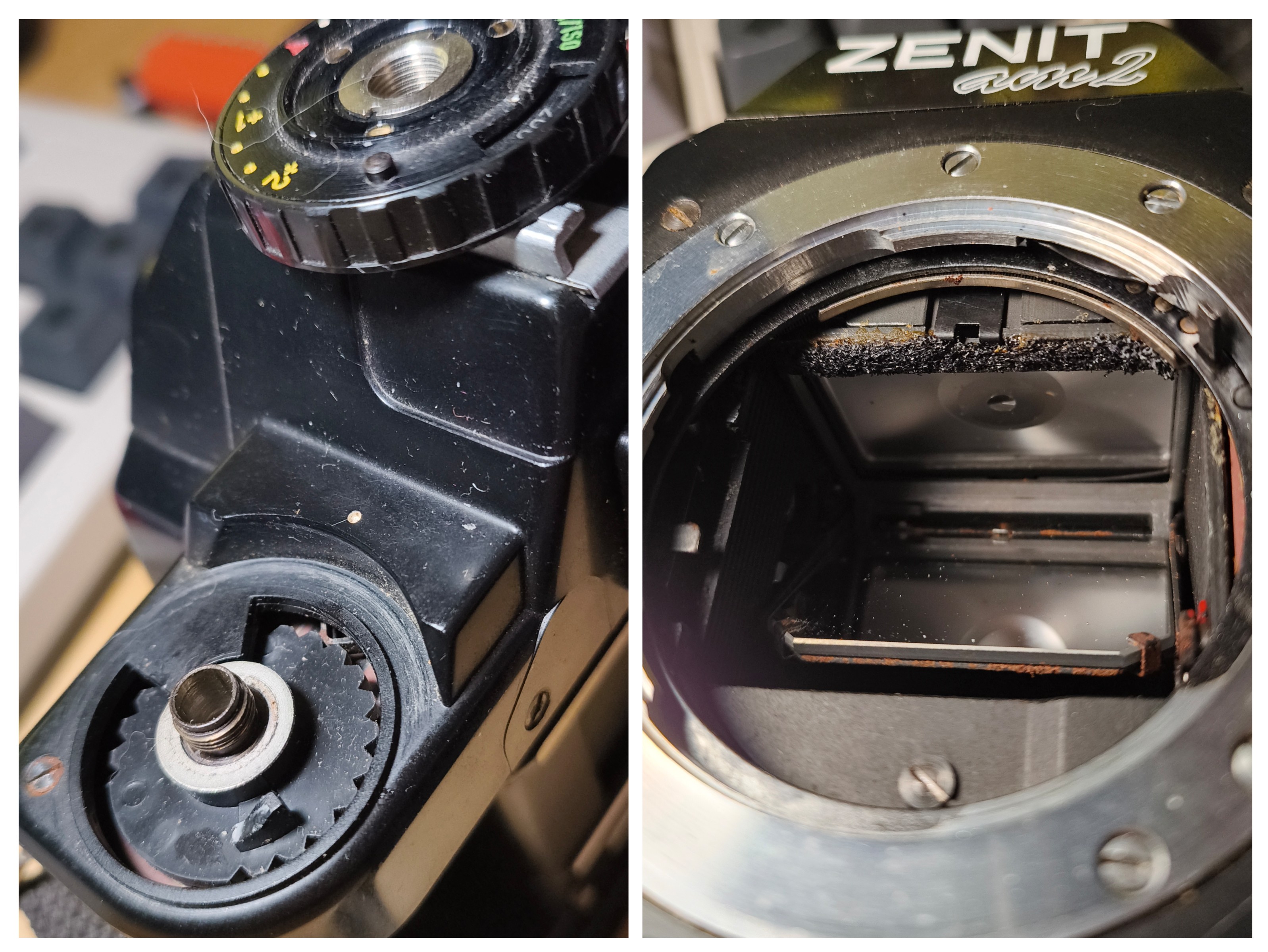Есть ещё один подопытный. На работе отдали, все равно выкинуть хотел. Так у него колесо экспокоррекции крутится на +360 без сопротивления. Разобрал, а там язычок сломан. Выставил на 0. На сколько реально в таком режиме использовать? Если реально, то какую плёнку (цветную) взять для дневной съемки? Там есть выставление исо, но не похоже, что оно как-то влияет на автоматику аппарата. Ну и визор очень грязный, на верхний элемент ворса налипло который сверху.