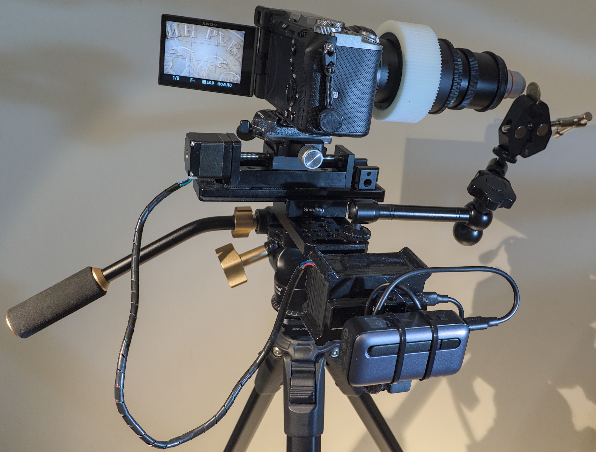 Можно сделать свою моторизованную макро-направляющую из рельсовой направляющей MGN для ЧПУ станка с винтовой (или шариково-винтовой, если ты богач) передачей. Станочная рельса, какой бы китайской она не была — это уже серьезный агрегат для серьезных задач. На пик-2 моя самодельная направляющая с мотором. Проект на гитхабе: https://github.com/ipv3network/MacroPribor-32 Стоимость такой поделки около 4000-5000 рублей, если считать только обязательные компоненты, без излишеств типа falcam f22 и зажимов от смоллрига. Вот еще проекты опенсорсных макро-направляющих от других авторов: https://github.com/appliedprocrastination/OpenMacroRail/ https://github.com/mattwach/motorized_macro_rail