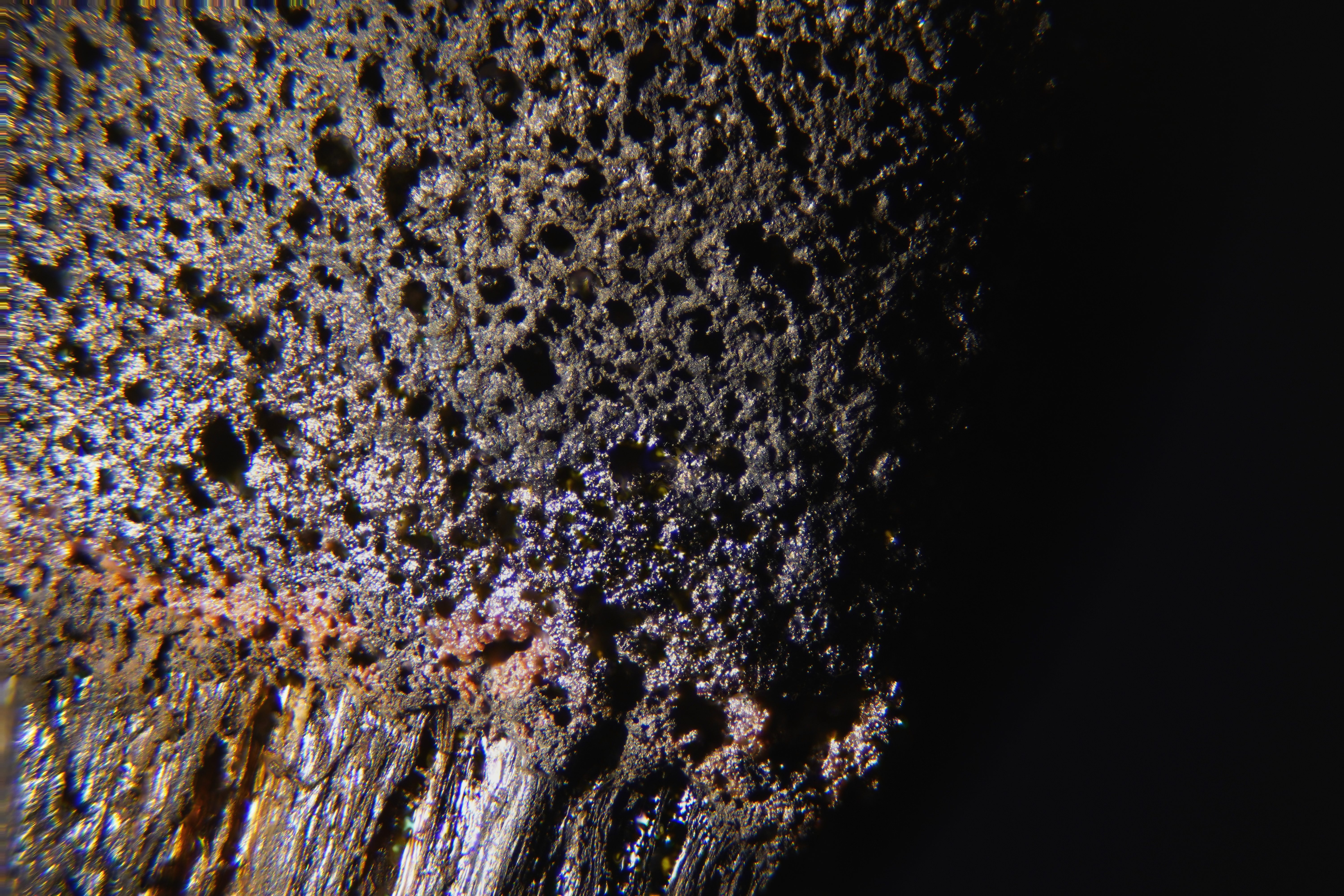 Скорее всего из-за бликов и отражений. На жестком макро увеличении (от 20:1) бликующими и глянцевыми становятся даже те поверхности, которые невооруженным глазом кажутся абсолютно матовыми. Программным алгоритмам сложно отличить мощный блик от контура объекта. Нужен поляризационный фильтр. А лучше два: один между источником света и объектом съемки, а второй между объектом съемки и объективом. Второй фильтр можно засунуть между объективом и матрицей, как можно ближе к объективу и как можно параллельнее плоскости матрицы. С микроскопными объективами не под бесконечность это может быть непросто. Но без поляризатора не сфоткаешь нормально мелкие металлические хуйнюшки и кристаллы.