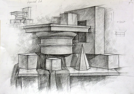 2. Натура с геометрией (шар, цилиндр) - всё то же самое + обучаешься уверенно и не случайным образом делать закругления. Изображаешь более сложное освещение. Развиваешь навык штриховки закруглённых поверхностей. Изучение тона.