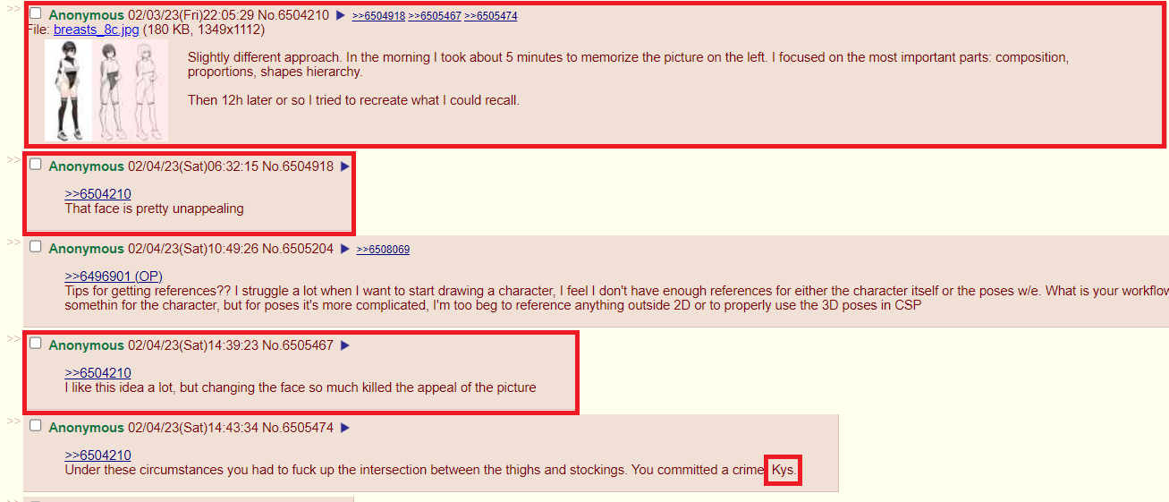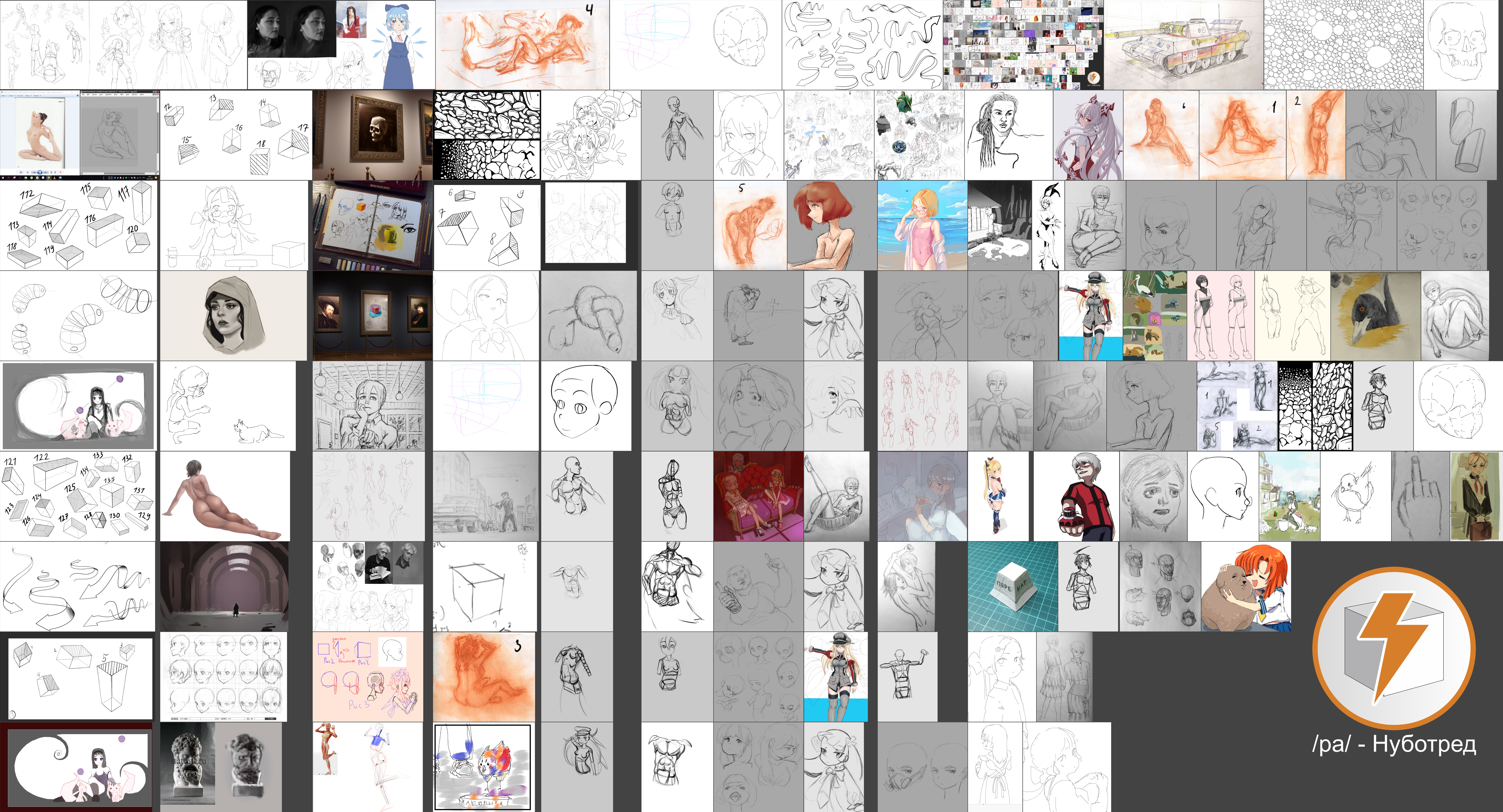 >>840481 >Это точно нуботред? И да и нет. Большинство художников там действительно занимаются минимум по три года. Например я вкатился в тред в апреле 2020. А рисовать начал пытаться с 2016 примерно. Ходил в парк и рисовал. И еще траил книжку Марка Кистлера где он нагло врал что я научусь рисоватьза 30 дней. Могу ли я назвать себя не нубом? Нет. Потому-что я премабег. Могу лия сейчас пойти в критику и сказать мол "оцыните"? Нет. Потому что я пермабег и меня обоссут. Примерно год назад я сунулся в анимутред и мне невежливо предложили съебать.