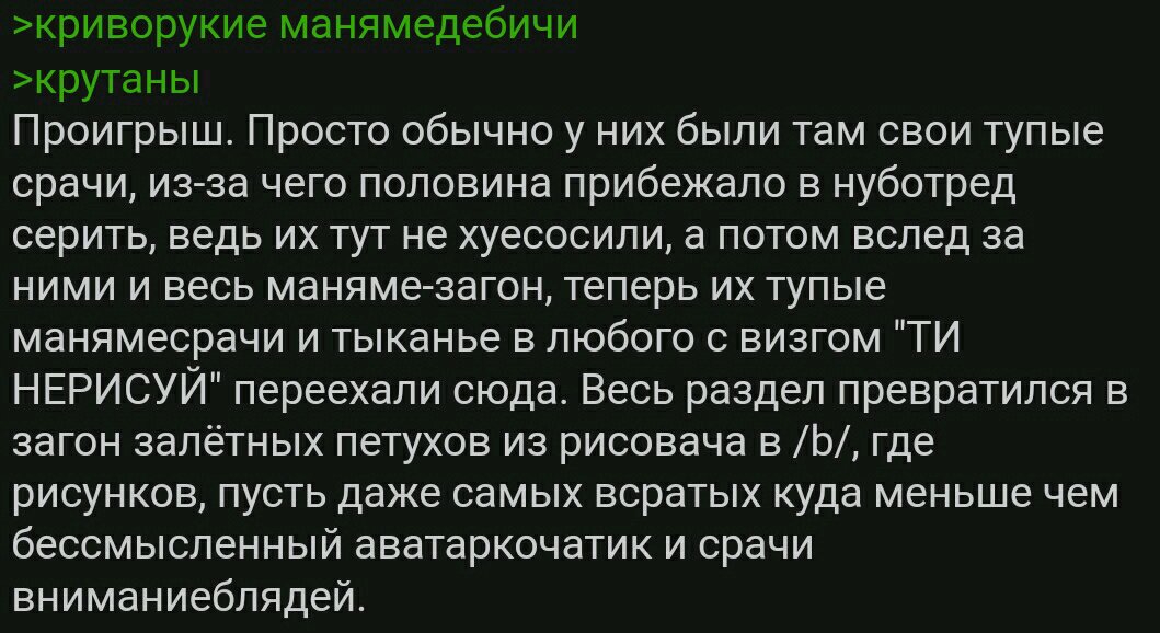 >Два новых рисунка и одна фигурка в треде >Похуй >Зеленка запостил >ОМНОМНОМ КАКОЙ ЖЕ ЗЕЛЕНКА ДОЛБОЕБ >Сотни реплаев, редлайны, актив в треде >Всерьез считают что проблемы в нерисуях