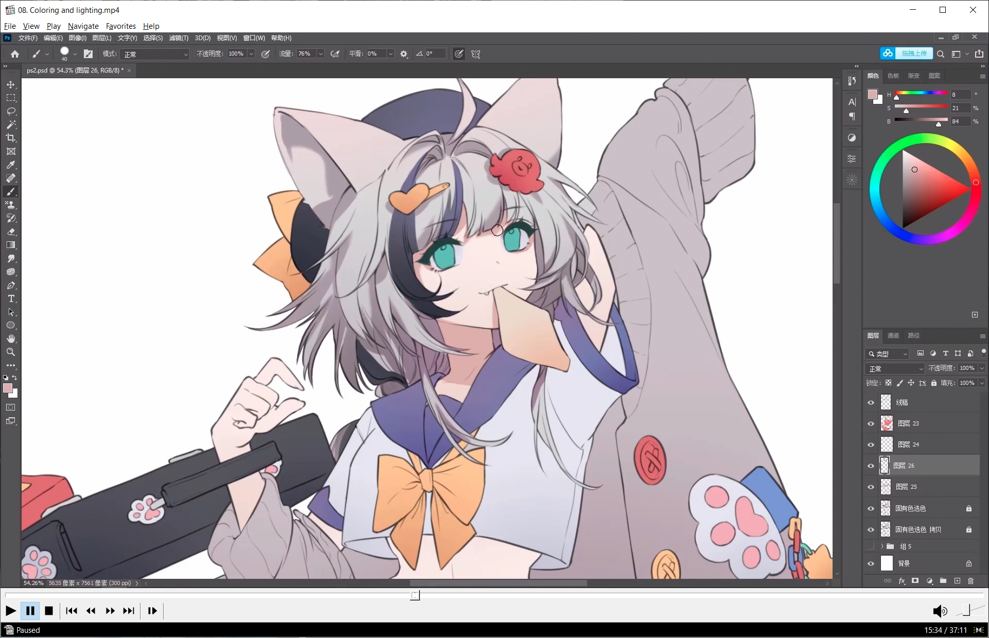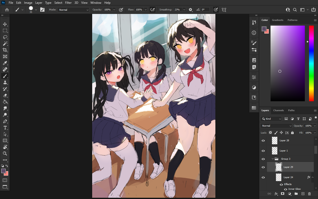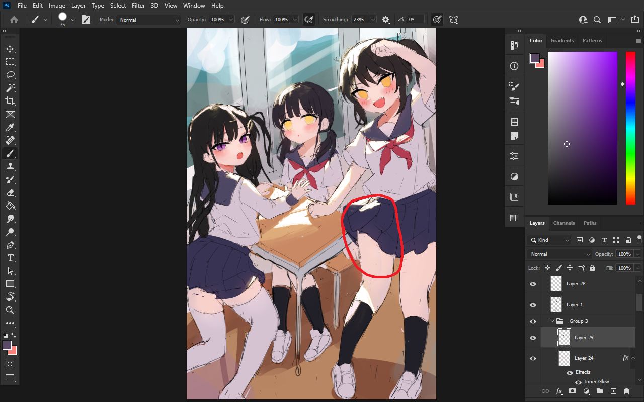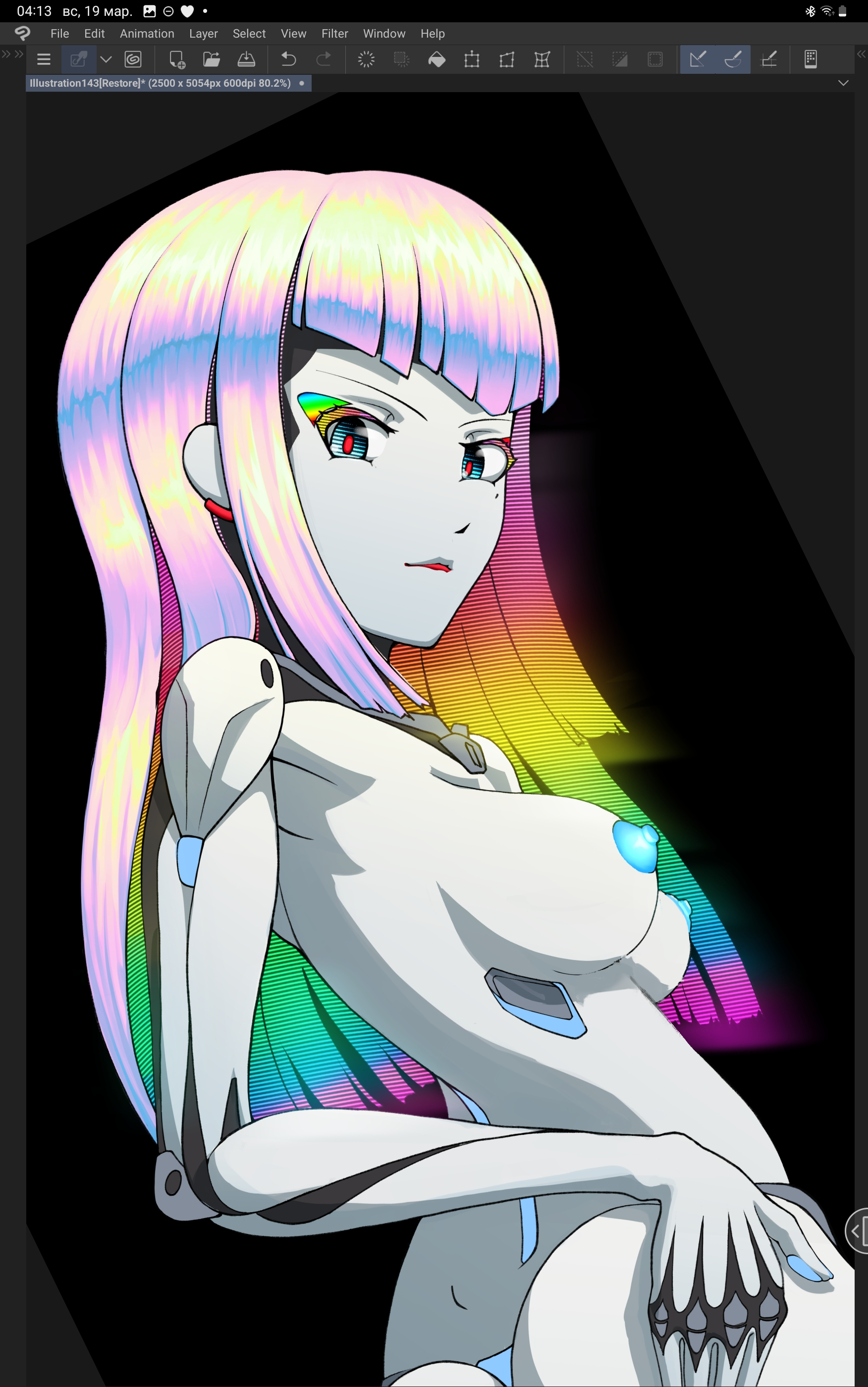 >>853273 Выдели пустую область за персонажем и инвертируй выделение, получится маска прямо по внешней границе лайна. Дальше уже нужно только за границами внутри силуэта следить. Если хочешь через Vivid Light красить - привыкай юзать отдельные слои для одежды, кожи, etc, и не оставлять скетчевых дыр в заливках. Режимы слоев, стакаясь друг с другом, даже VL x VL дают непредсказуемый результат. Тут аккуратность важна.