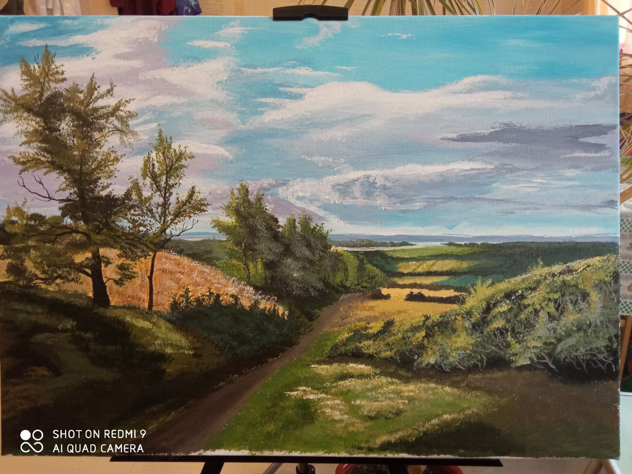 Как вы относитесь к туториалам и прочим подобным видосикам из ютуба? Я тот анон, что спрашивал зимой по поводу акрила. Разрисовал пару листков и один шаблон, я купил в итоге холст 50х70 и попытался повторить картину одного художника, потому как очень уж понравилась. Я пока ещё не доделал конечно. С травой проблемы, не могу тонко вывести линии, с дорогой напортачил. Сойдёт для первого раза?