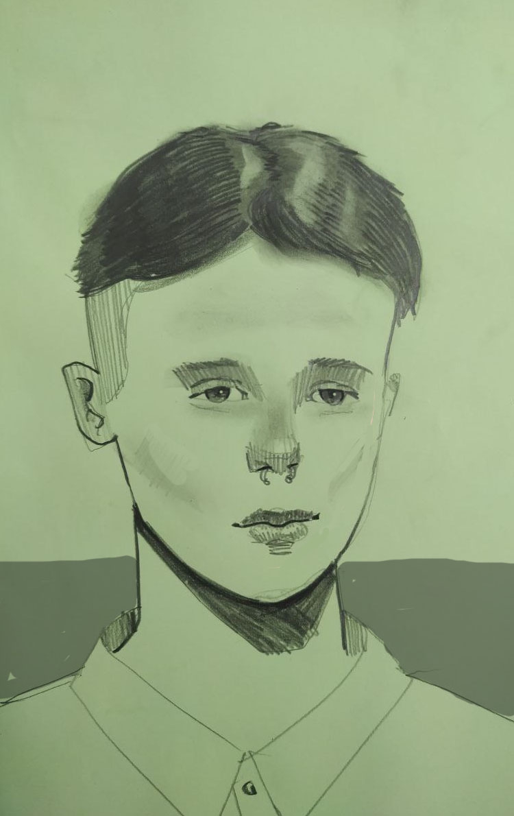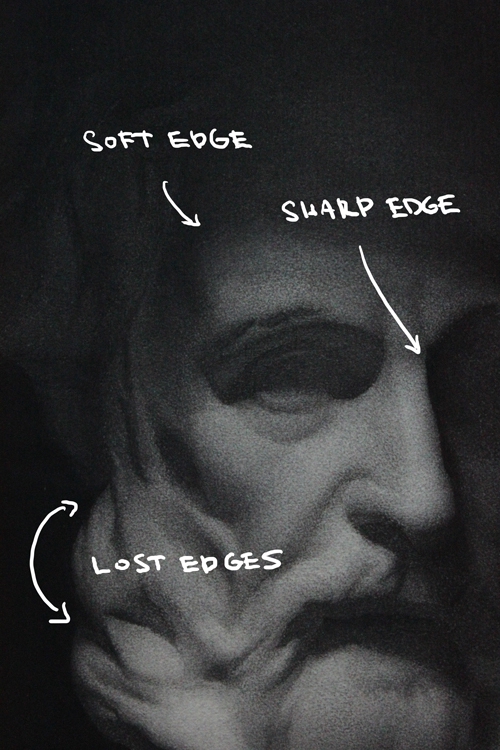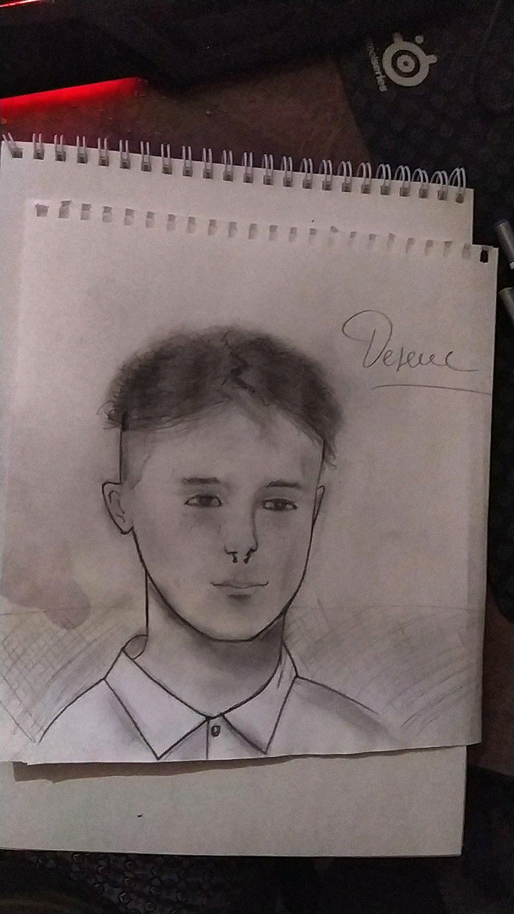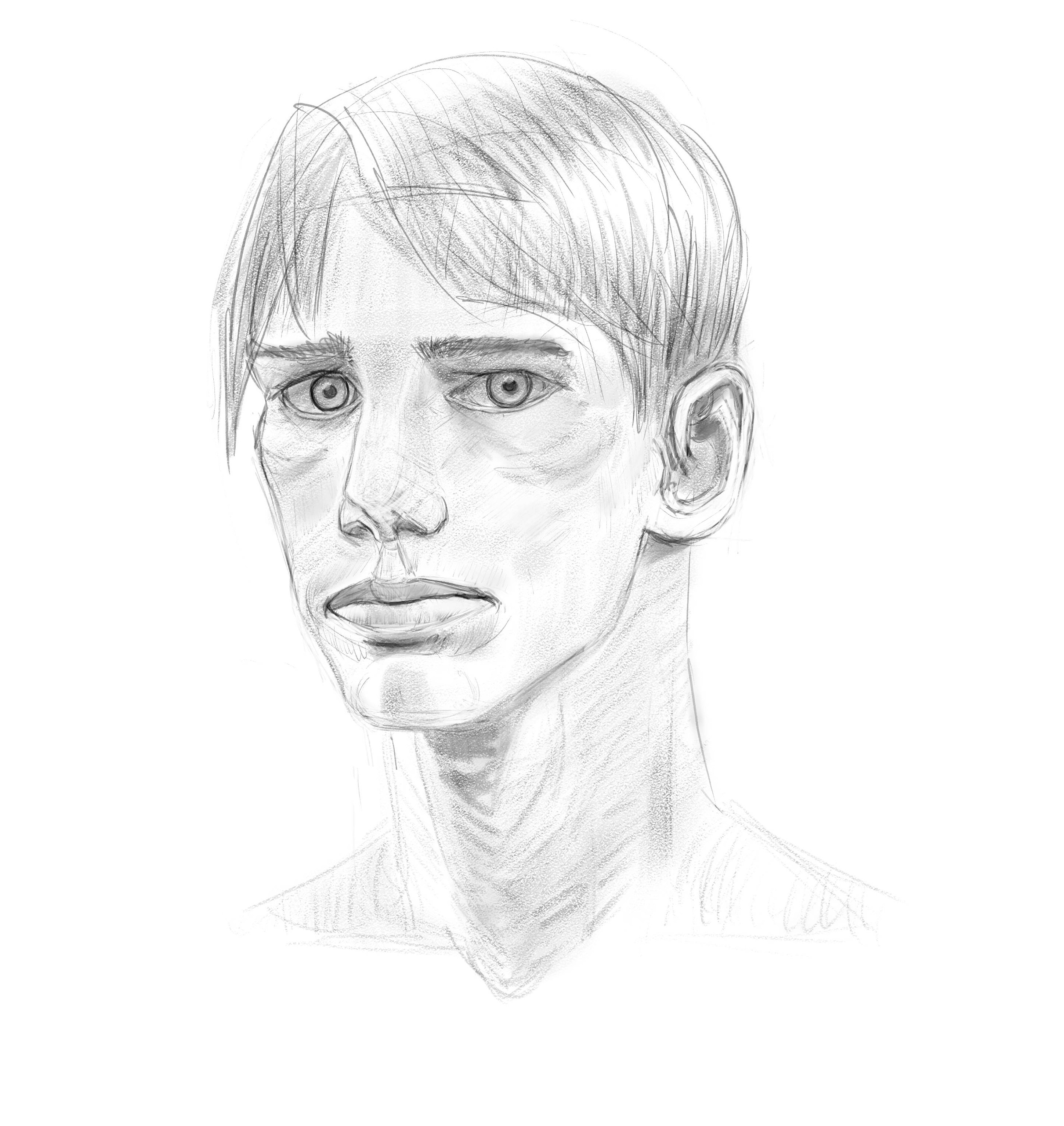 >>852292 Не делай такой толстый и не аккуратный контур. Если делаешь лайн попробуй менять толщину лайна в разных местах см. pic 2. на виске линия жесткая, уверенная, толстая, черная. Потом на щеке она утончается , ее почти не видно и потом она на подбородке снова становится толстой и плотной. Такой лайн создает интересный эффект, то что линия не однородная выглядит интереснее. Мозг все равно дорисует ее в голове. Попробуй потренить такую линию, типо ведешь карандаш жестко, потом ослабляешь ведешь тонко потом снова нажимаешь. Поиграй с этим приемом. Еще скажу про штриховку и растушевку. Смотри pic 3. Видишь можно теневую часть просто и быстро заштриховать не отрывая карандаш, ровными вертикальными линиями. Это создает эффект скечта, лекого не замороченного рисунка и в тоже время хорошо отделяет темную нижнюю часть носа, которая неаходится в тени от светлой на верху. Растушевку использовать можно но не в коем случае не злоупотреблять ей. Рисунок с большим количеством мыла выглядит непрофессионально. В теории ты думаешь что такой мыльцо тут и там создаст ощущение градации, переходов тона но на деле просто рисунок кажется неопрятным и грызным. Или ты думаешь что растушевка быстрый способ перекрыть теневую часть? Что может бысть быстрее просто вертикальных, четких линий, верх, вниз, верх вниз. Перекрыл и все. Применить растушевку можно НО ее должно быть в рисунке процентов 15-20. Остальное просто плотный штрих. Например ты можешь растереть пальцем щеки и нос, а остальное все пусть будет выполнено штрихом. Волосы у меня получились так себе, но у тебя просто опять растушевку, и выглядит как буд-то у парня уже в 18 лет алопеция началась и он вернулся из турции с операции по пересадке волос. Волосы это такой же обхем как и нос, губы и прочее. Они имеют форму, то что они состоят из толстых волосков не должно наталкивать тебя на мысль просто рисовать полосочками какждый волосок или растересть пальцем просто. Погугли советские памятники как там скульпторы делали прическу, например памятник маяковскому. Вот тоже самое и с волосами. Хотя понятно что когда рисуешь с фотки сложно считать объем из за того что освещение может вообще не подчеркивать его у волос. Но все равно думай об волосах как об объеме. А так молодец.