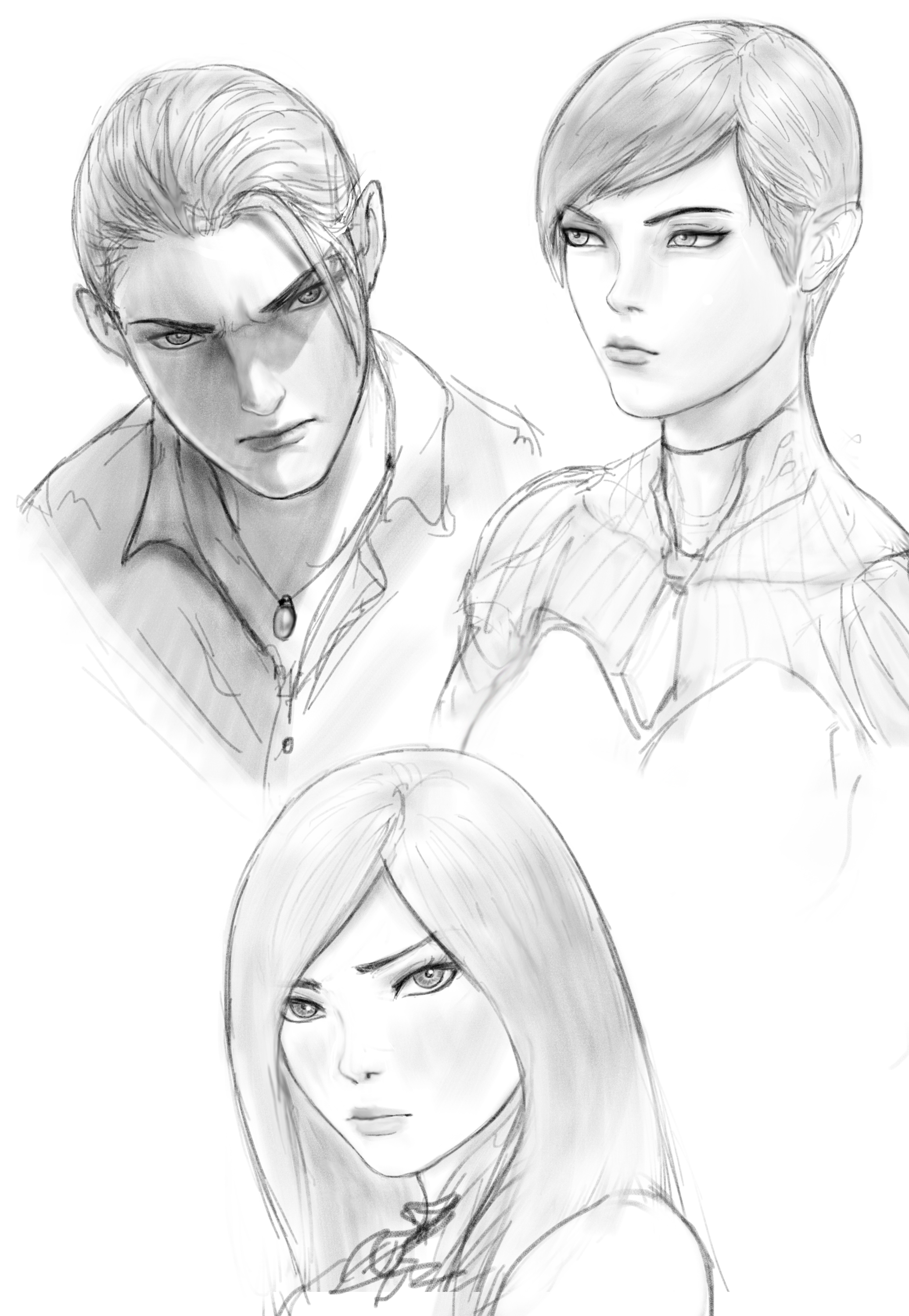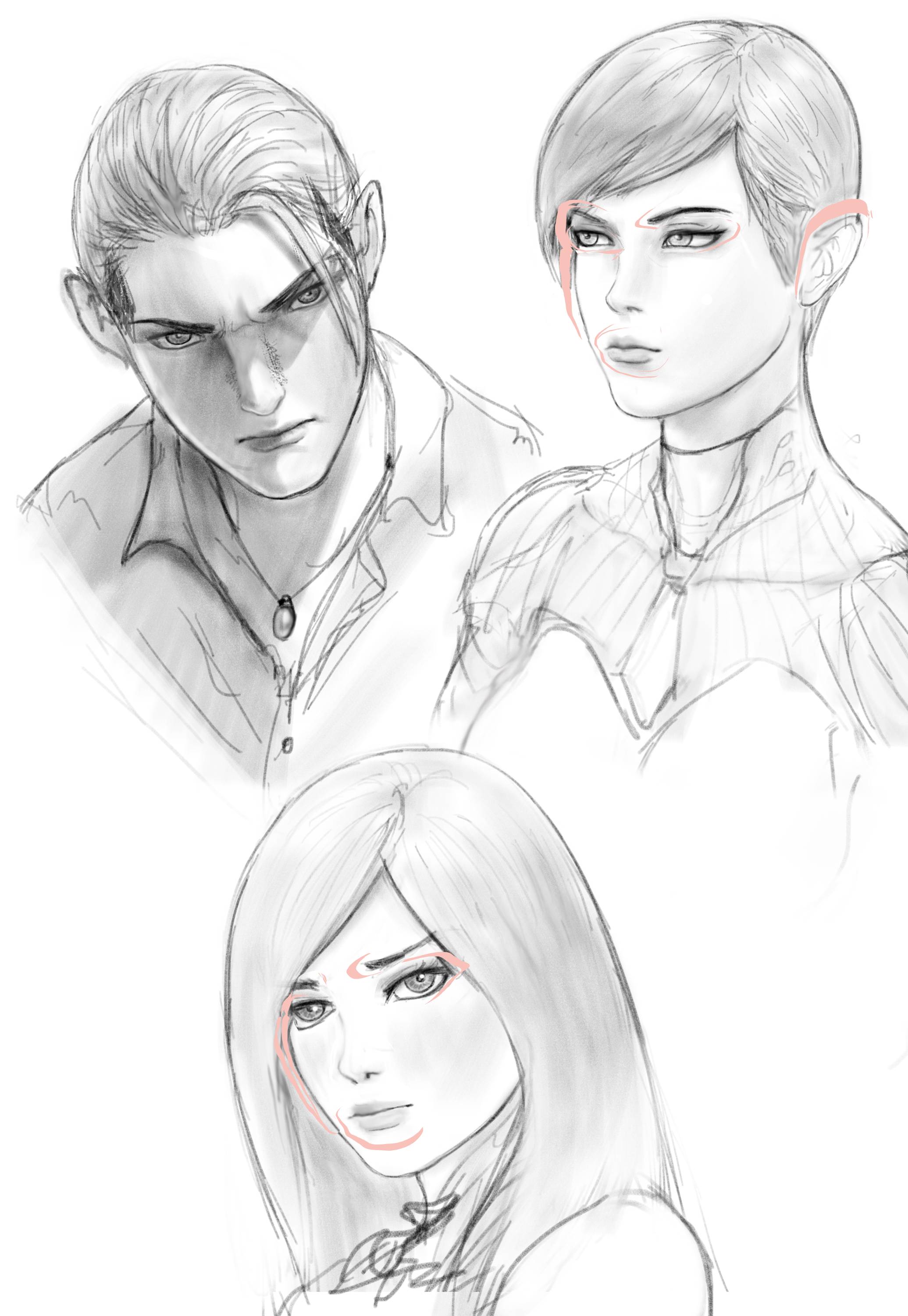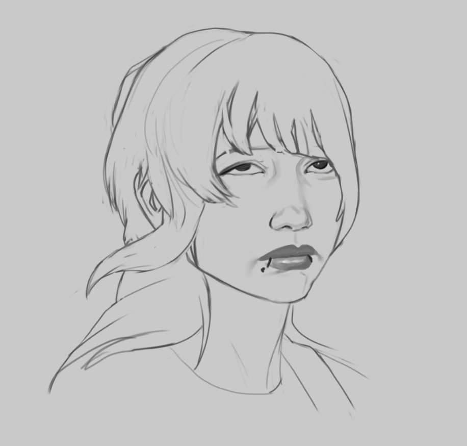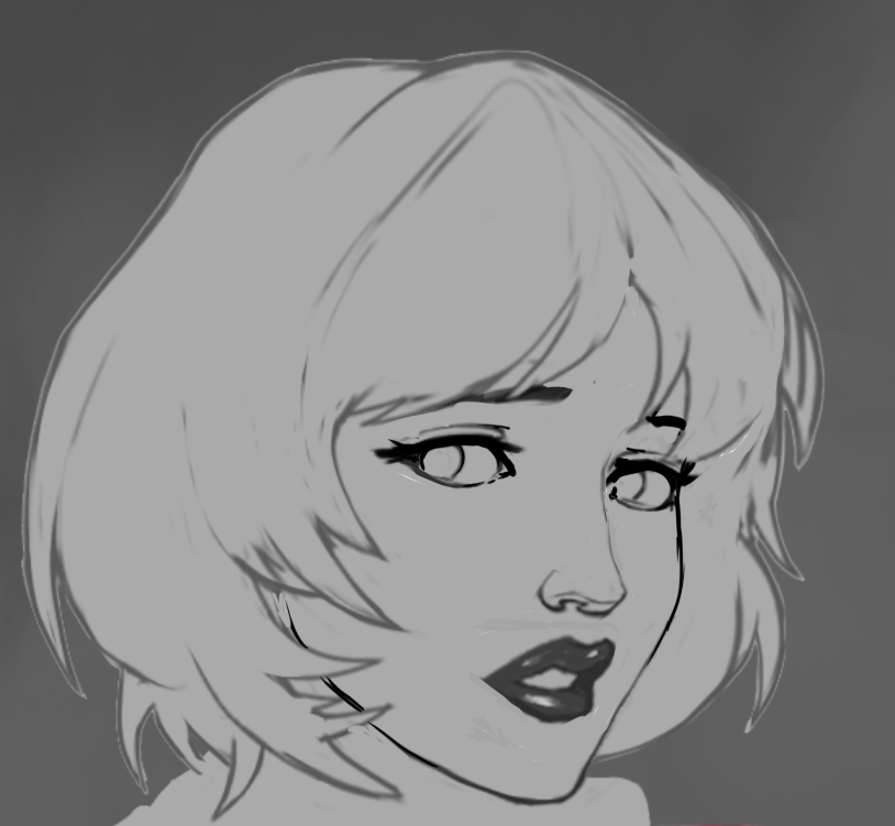 >>907976 Хороший стиль, мне нравится. Сплав аниме и традишки, не знаю, как это называется, но круто. Анатомия и перспектива кривоваты только. Вот поправил на свой вкус, без обид. Большие (а тут еще и широко расставленные) глаза самому все время хочется нарисовать, но они ломают лоб. Нет поворота на висок у мужика. Нос надо немного обозначить, а то совсем нет никакой границы. Губы шикарные.