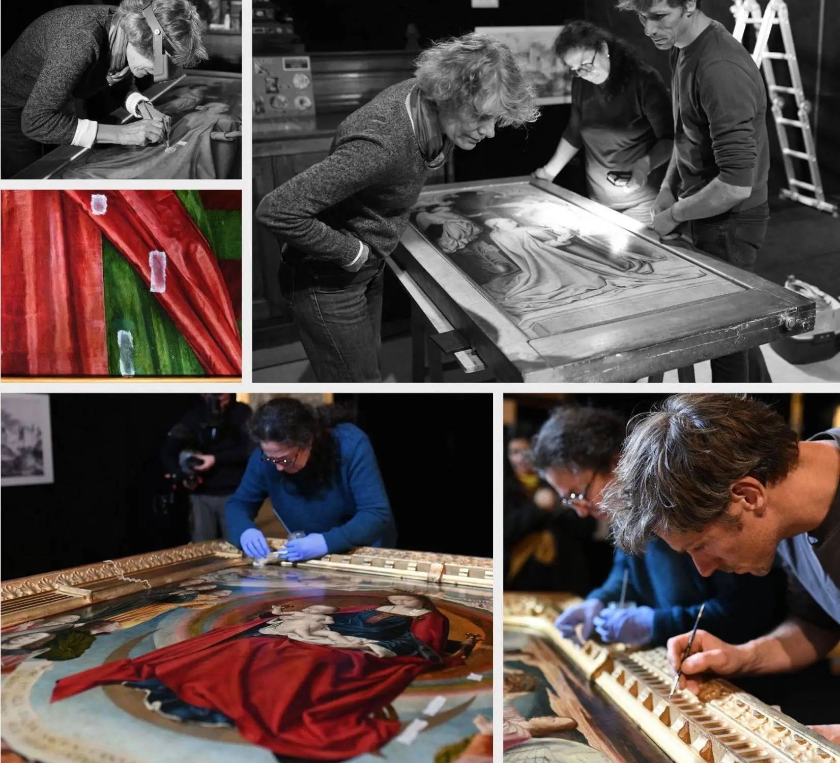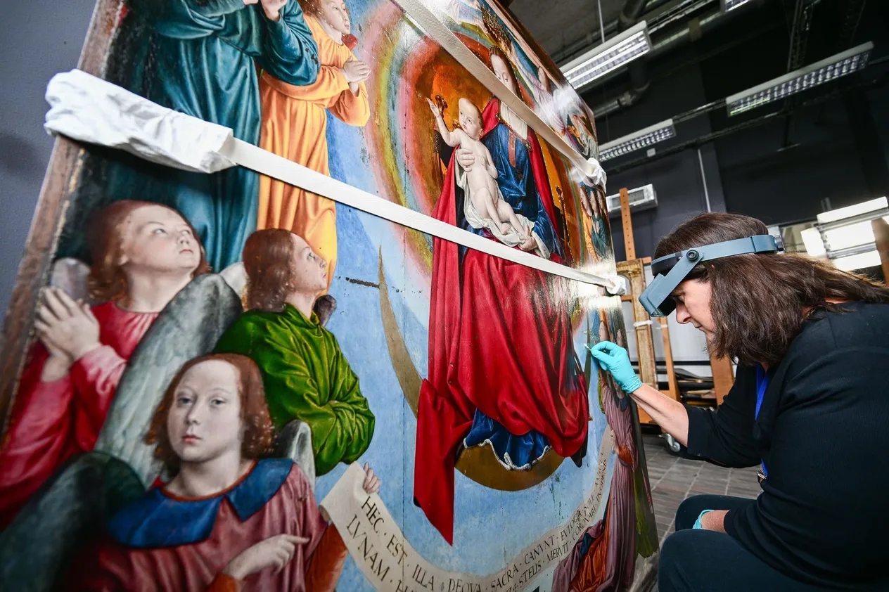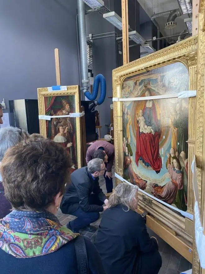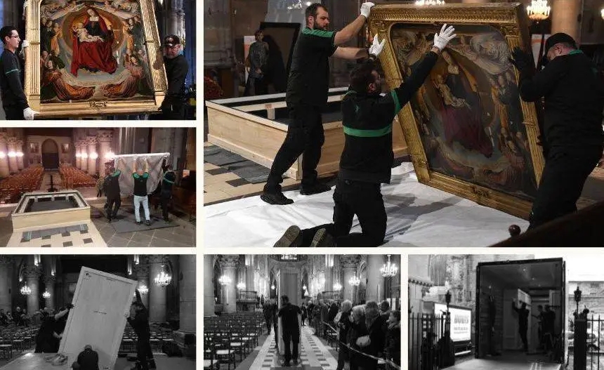 - Структурная консолидация: Специалисты укрепили деревянную основу и восстановили симметрию композиции, добавив недостающие фрагменты (около 5 см) на боковых створках, которые были обрезаны еще до Французской революции
