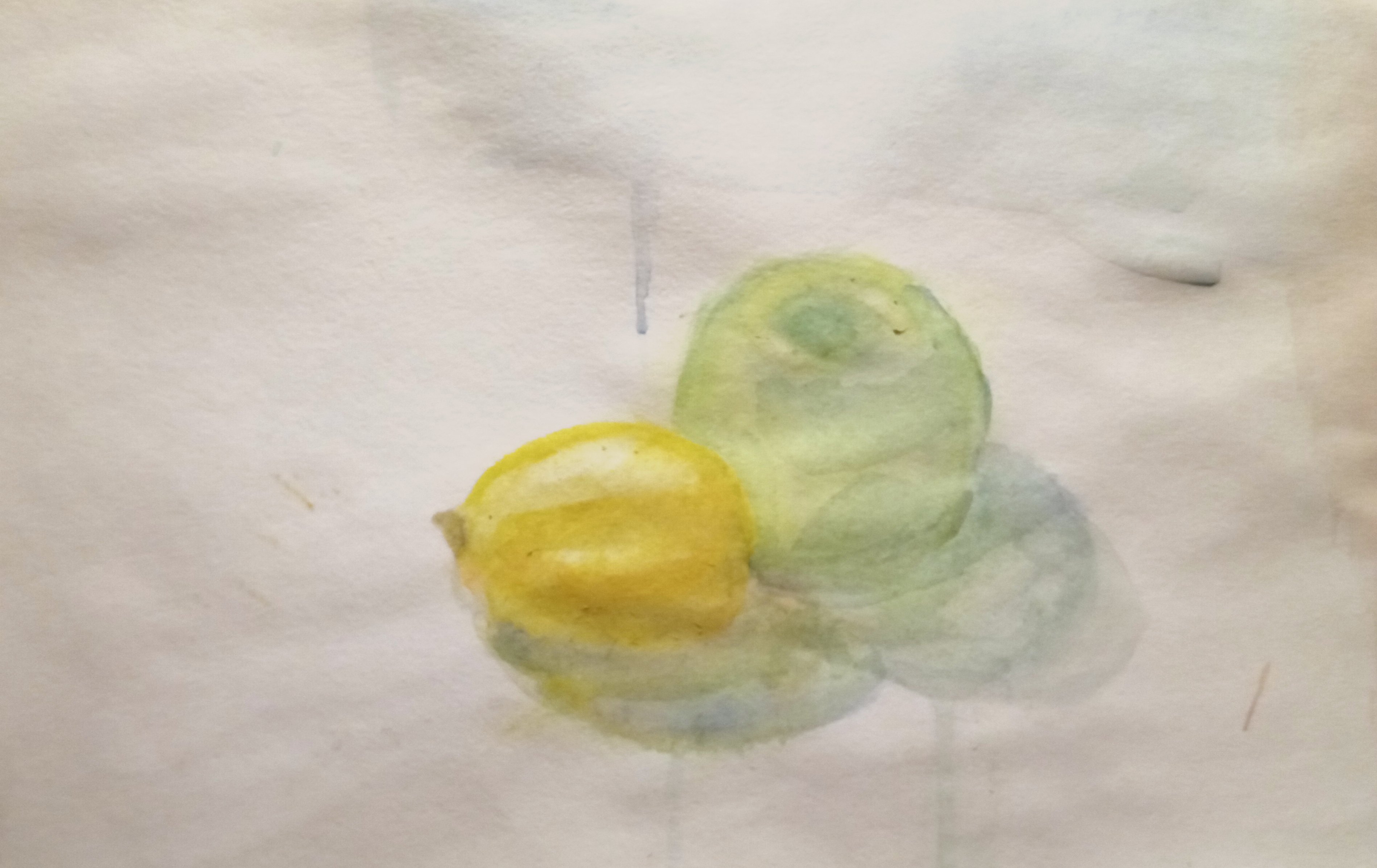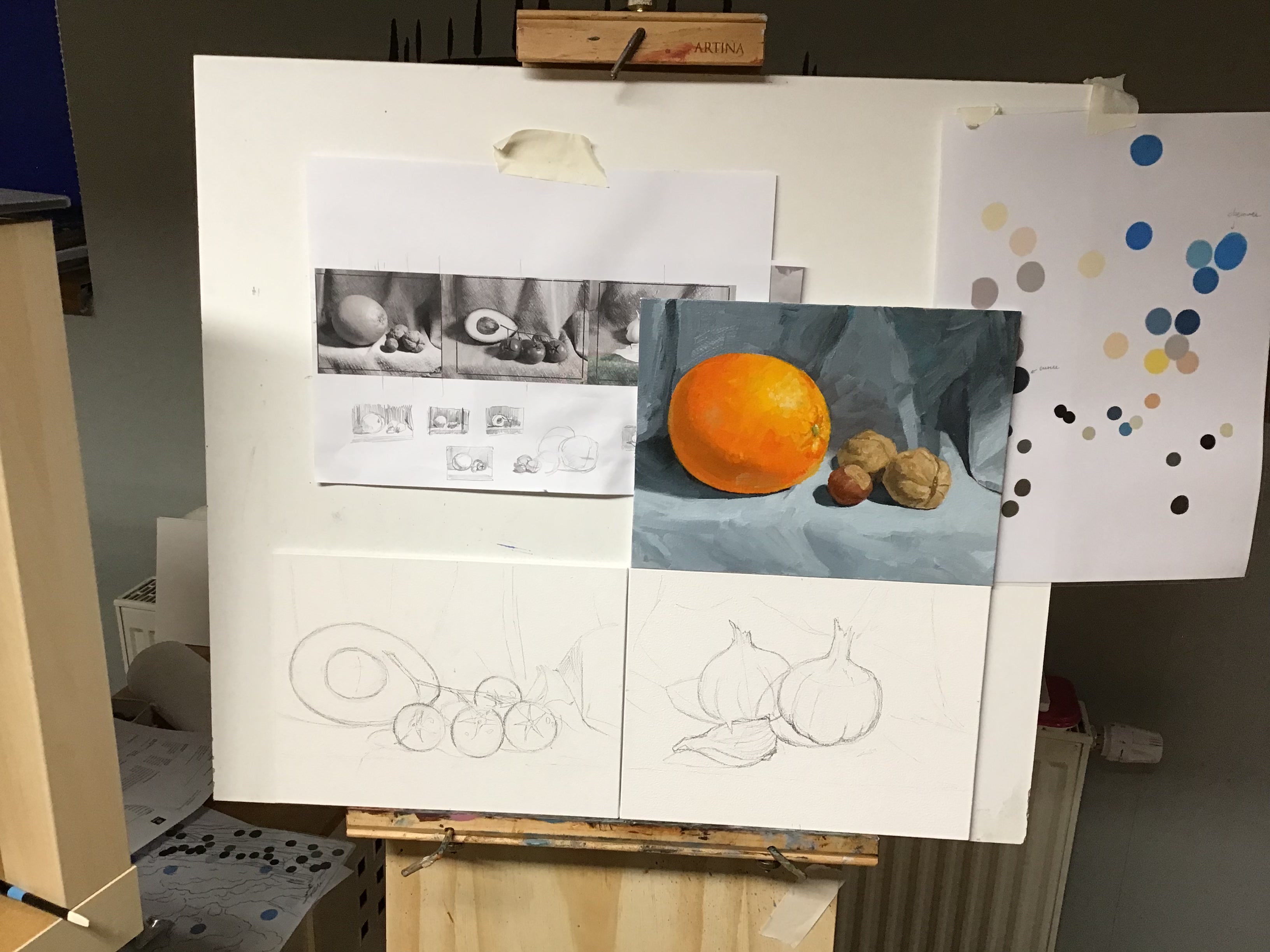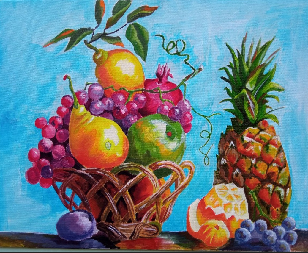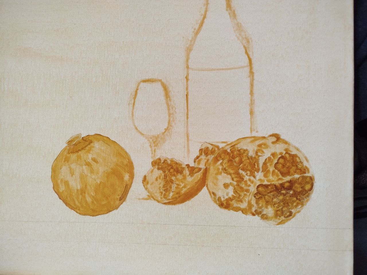 Сделал предварительный эскиз грозди и немного уже прописал сам гранат на холст в один слой.