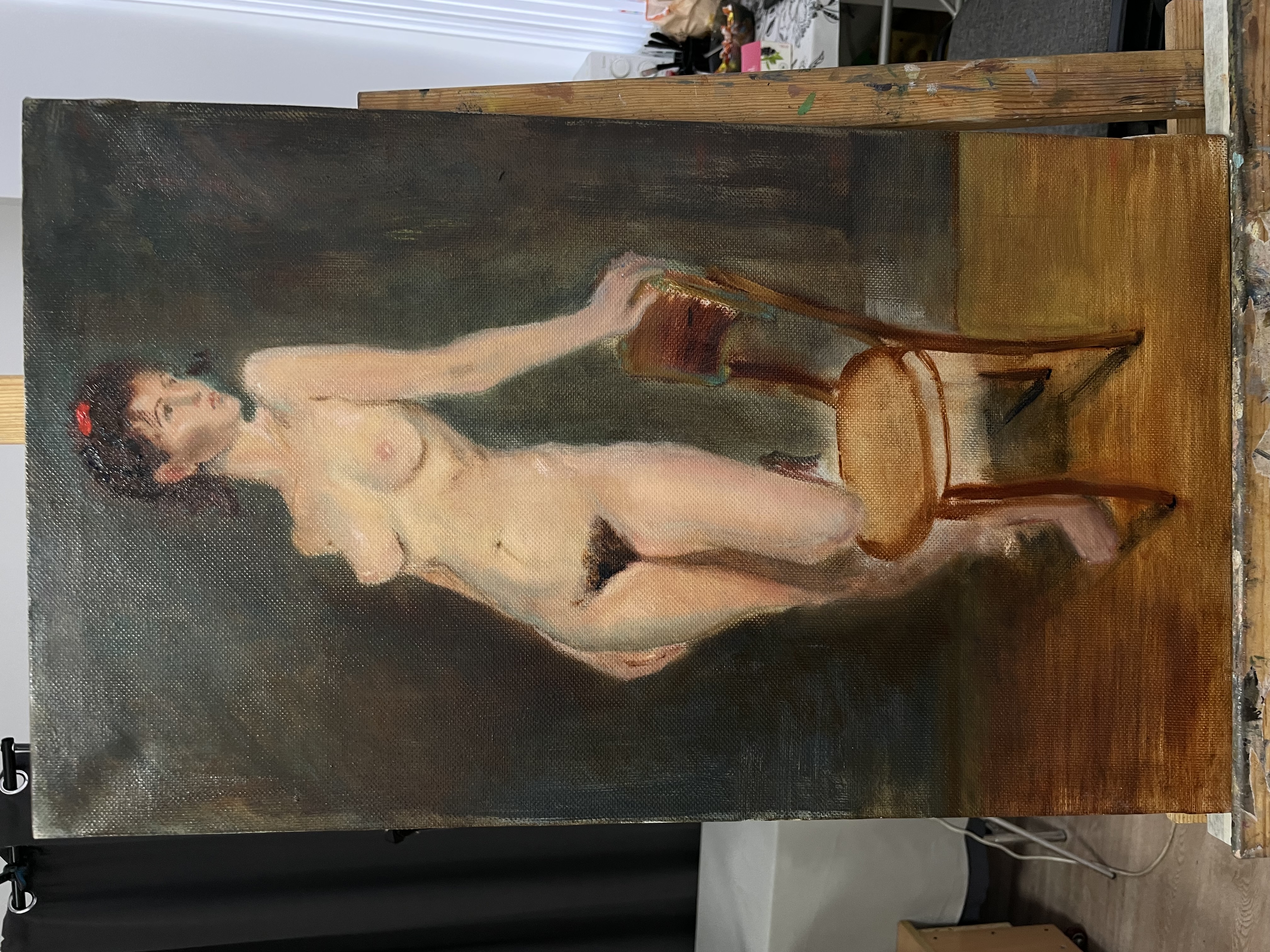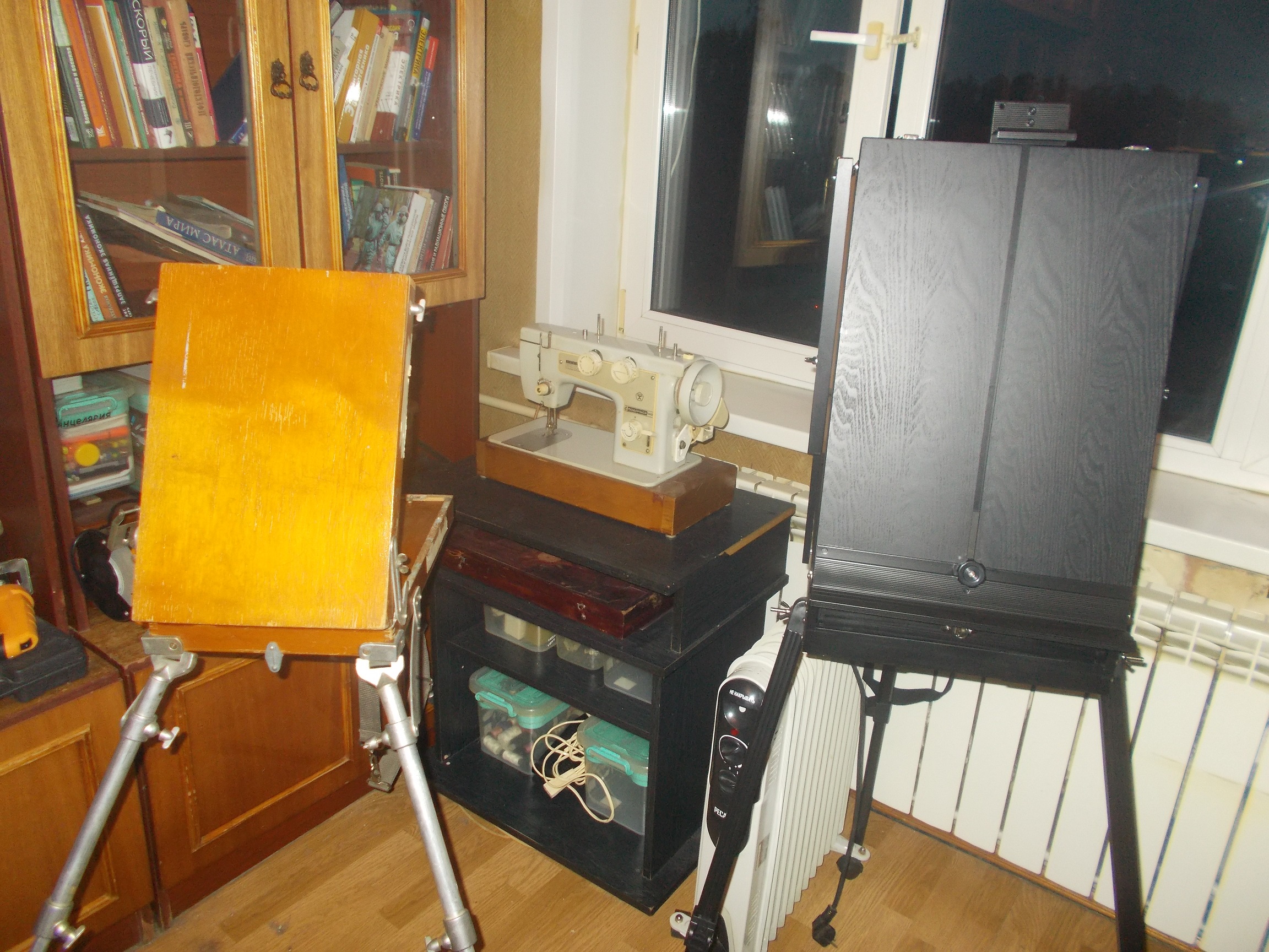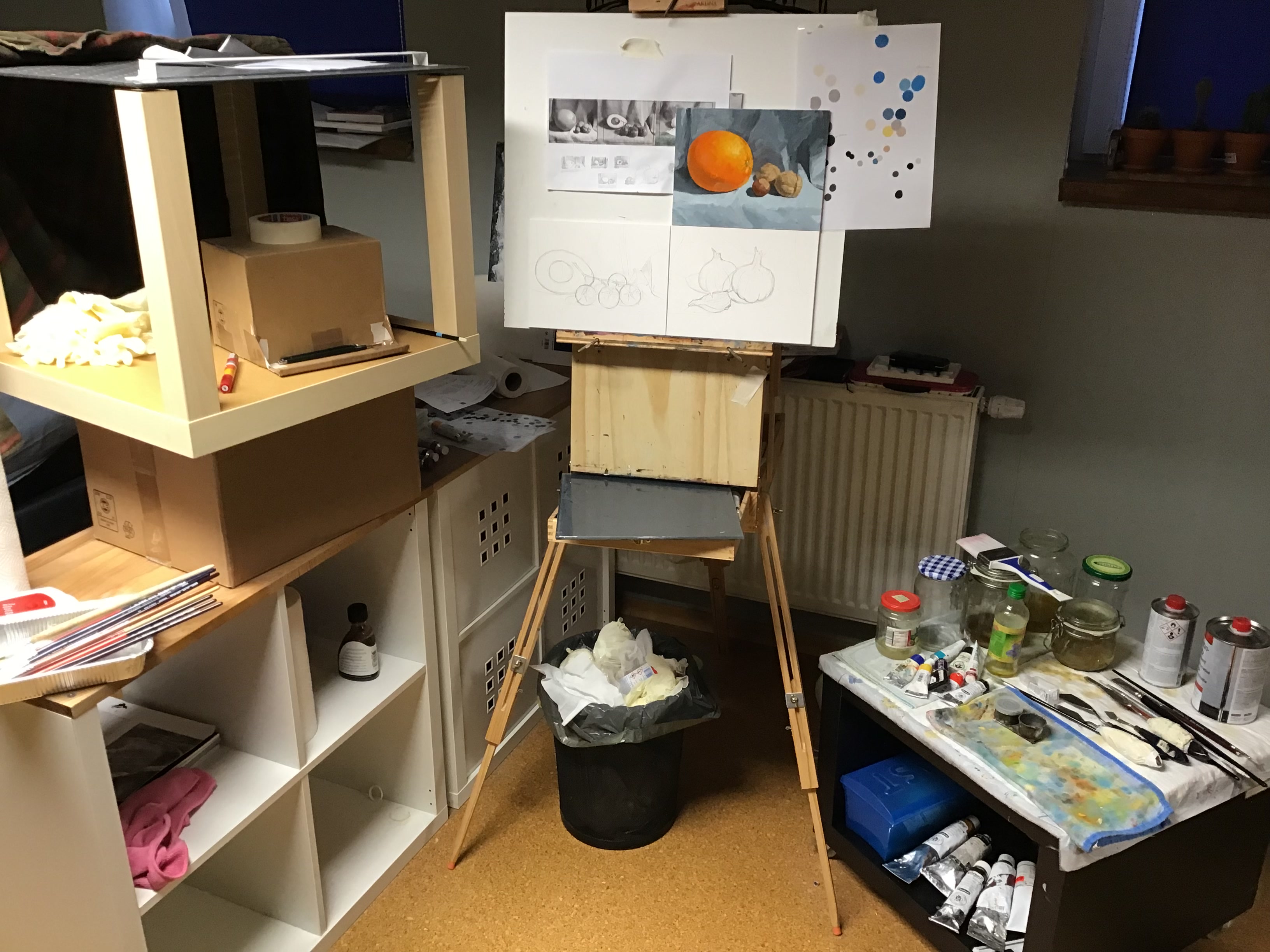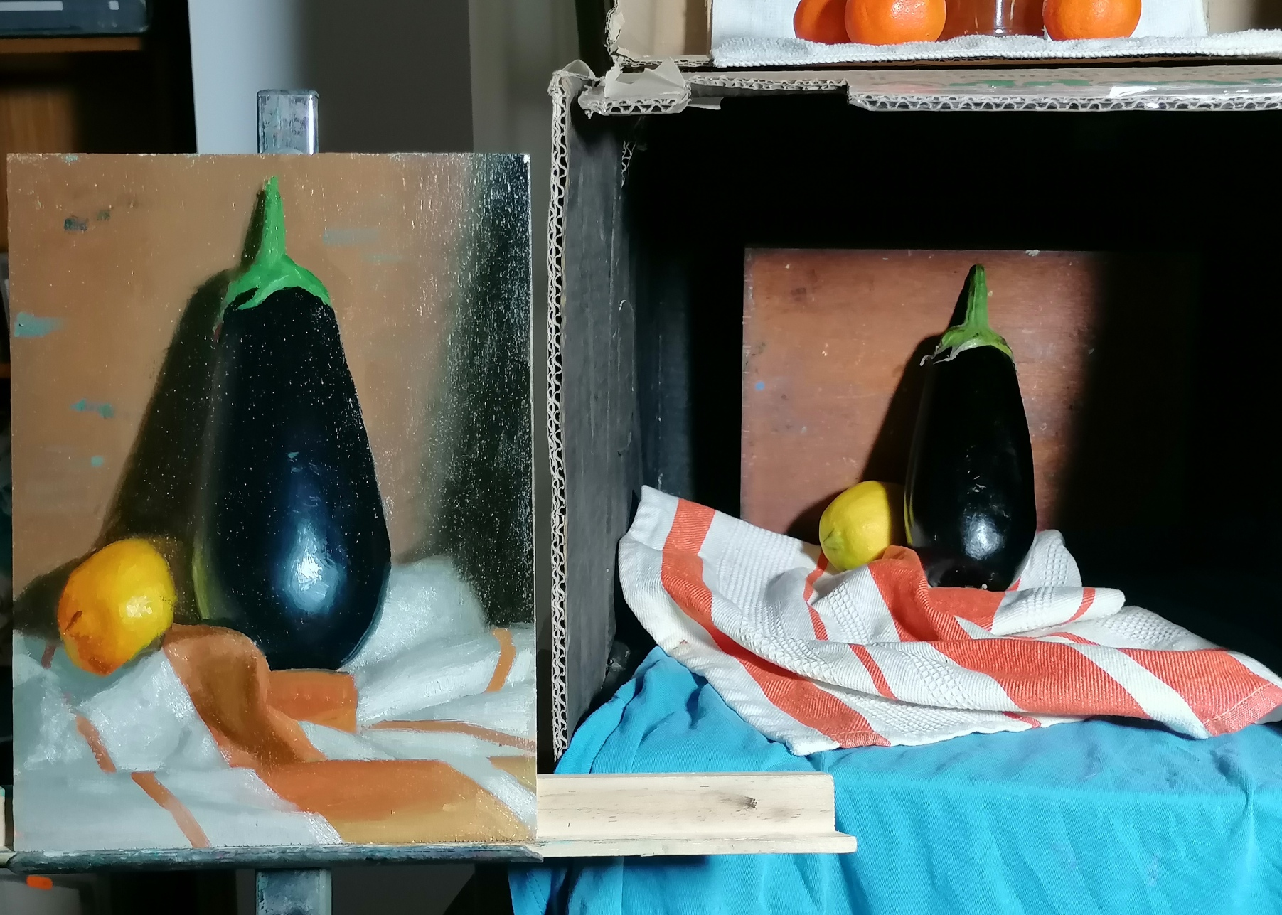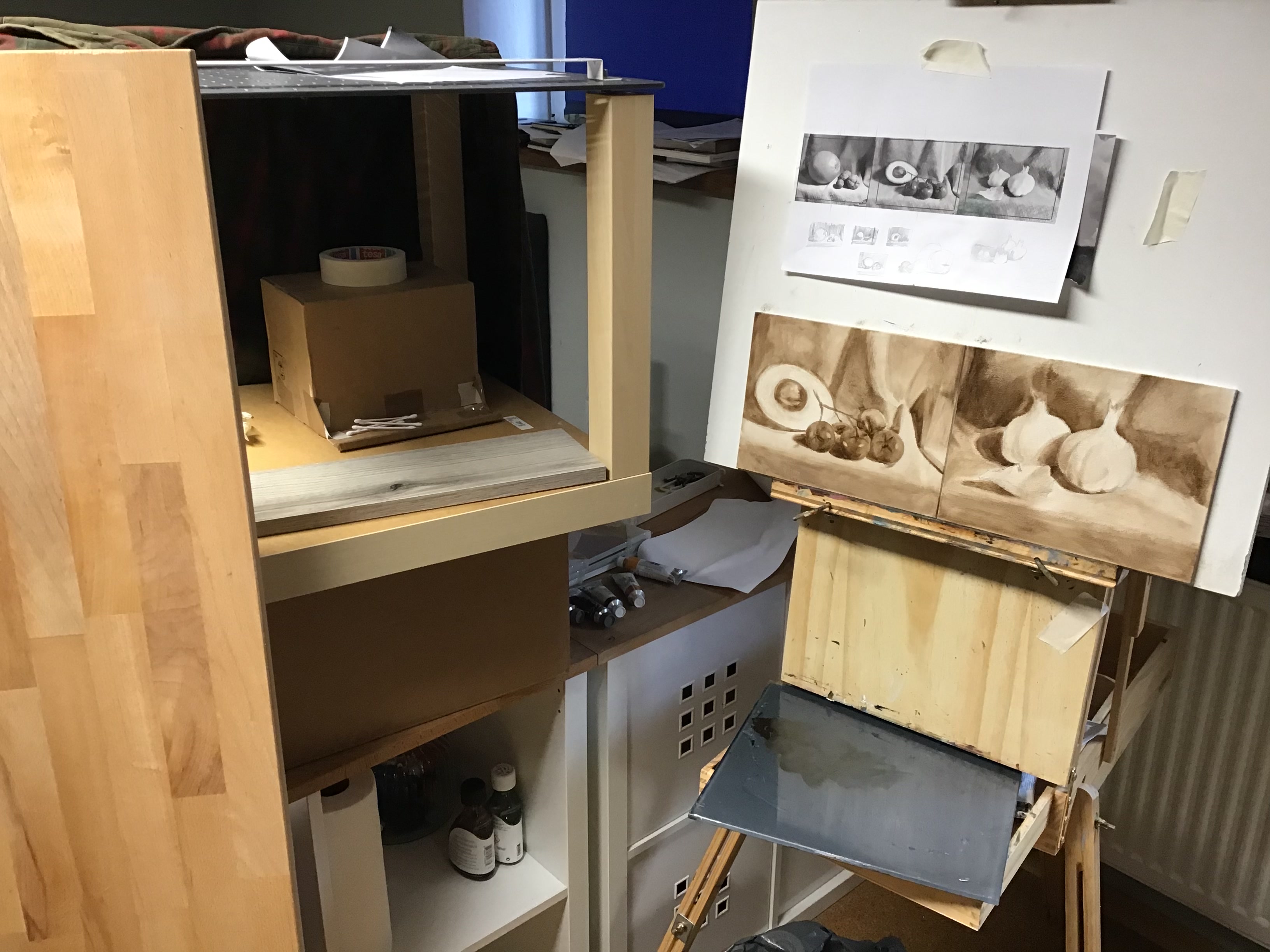 Пишу триптих, Фото делал заранее, но это как-то не то. Решил заморочится и построить коробку с контролируемым светом прямо на уровне мольберта. Нужно еще только красивую столешницу, вернее его кусок найти для базы. Пока сделал из говна и палок, как разберусь с тем, что мне от такой коробки нужно, построю уже солиднее из реек.