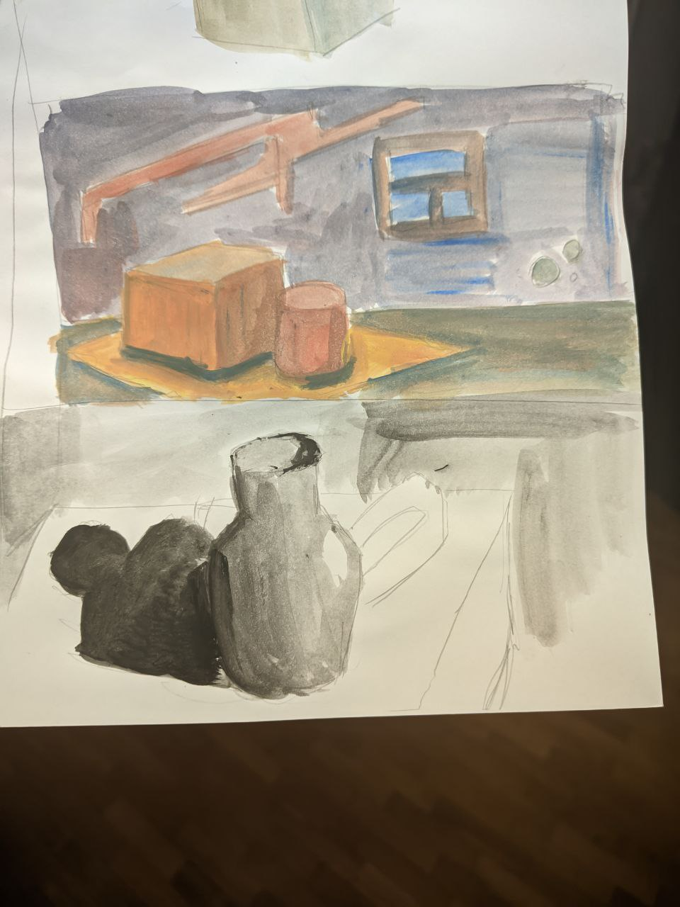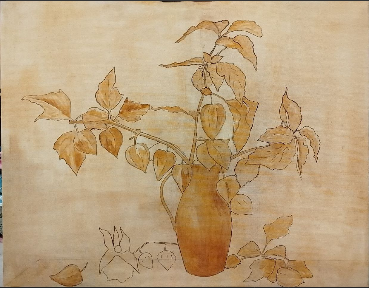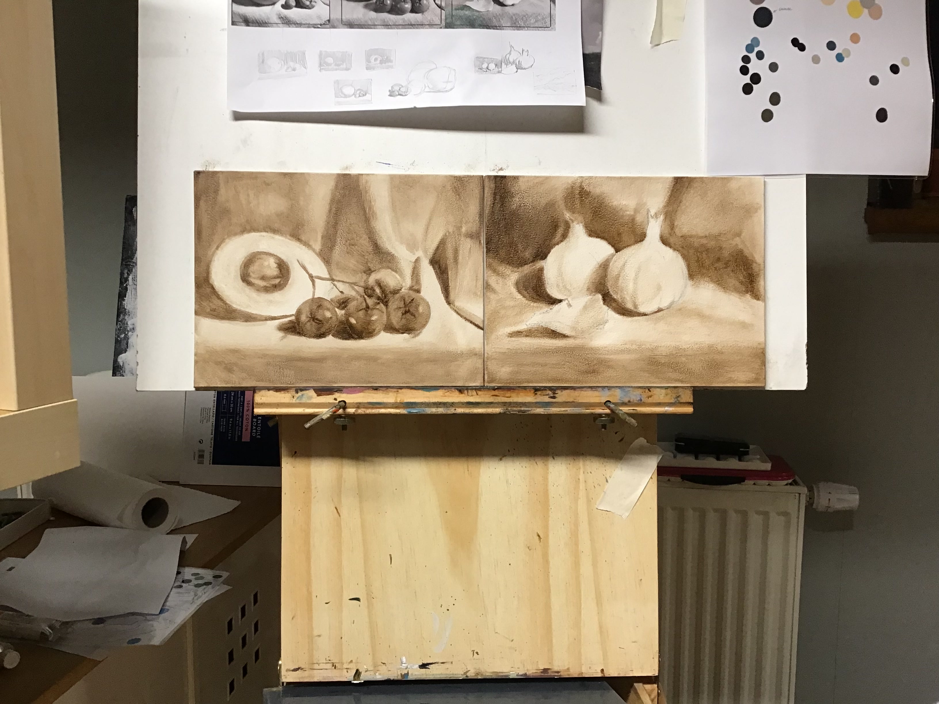 >>916797 Я затеял 50х70 натюрморт с гранатом, виноградом, бокалом и бутылью вина. В этот раз буду пробовать полностью прописать весь сюжет охрой, а потом постепенно вносить цвета. Дольше всего у меня сейчас идёт работа над эскизами отдельных деталей. Надо прорисовать, перевести на кальку понравившееся, а потом на холст перенести.