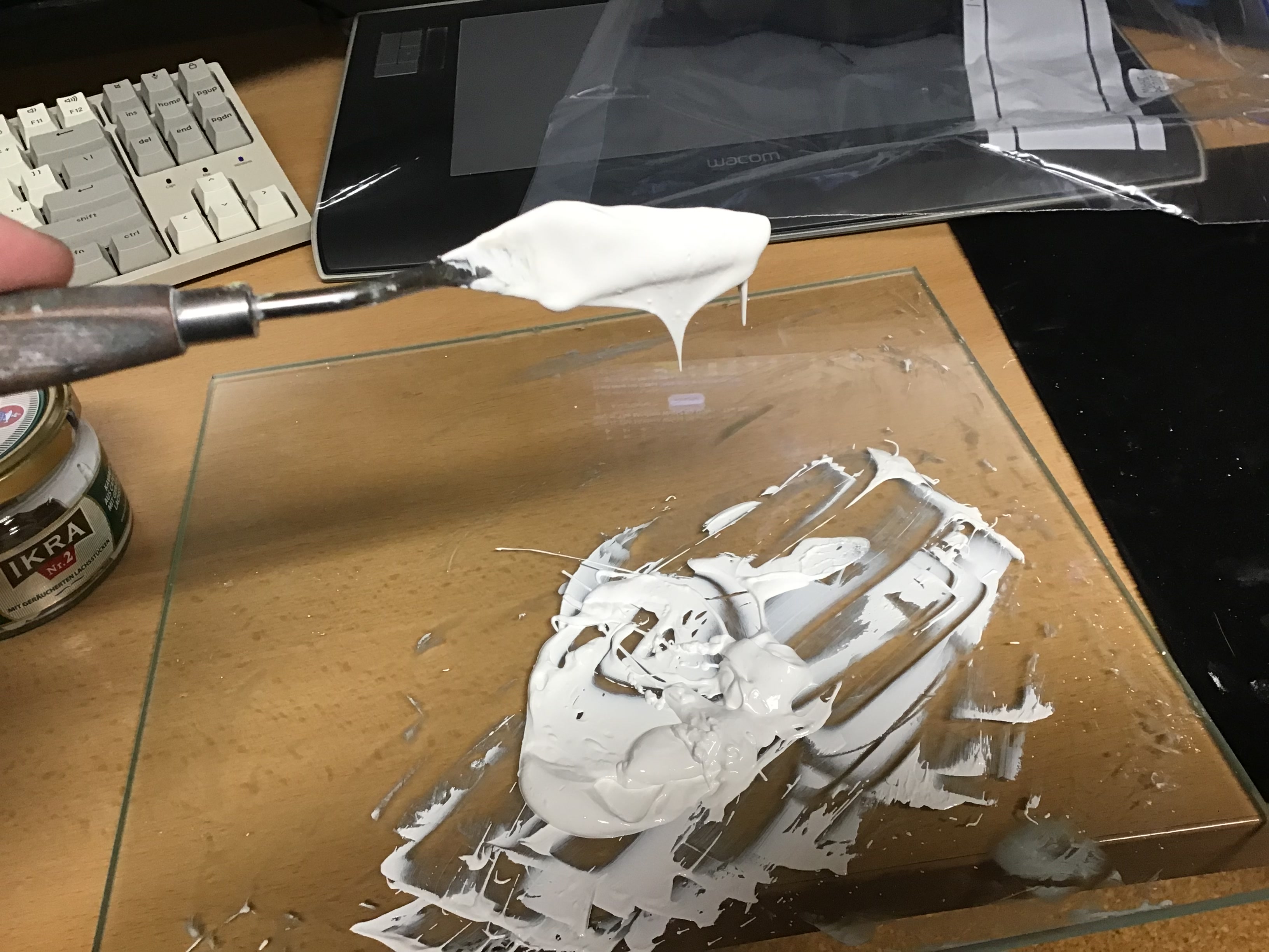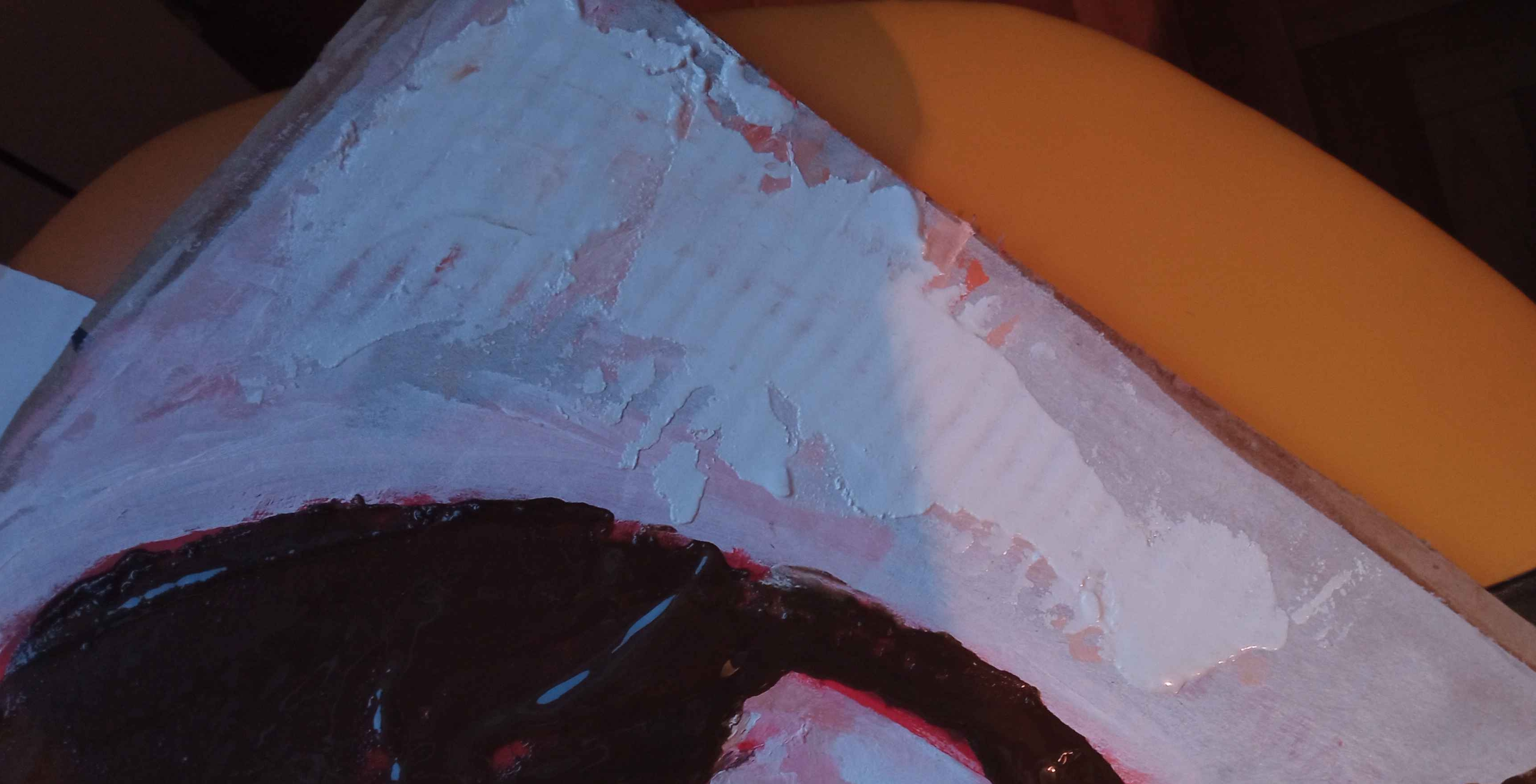 Ах да, сейчас еще на картине заметил мелкие краторы - похоже вайт спирит местами проел акриловый грунт. В некоторых местах дырок нет, в некоторых их дохуя. Похоже там где тряпкой шеркал, акрил проелся. Нужно будет протестировать как пенин себя ведет с акрилом.