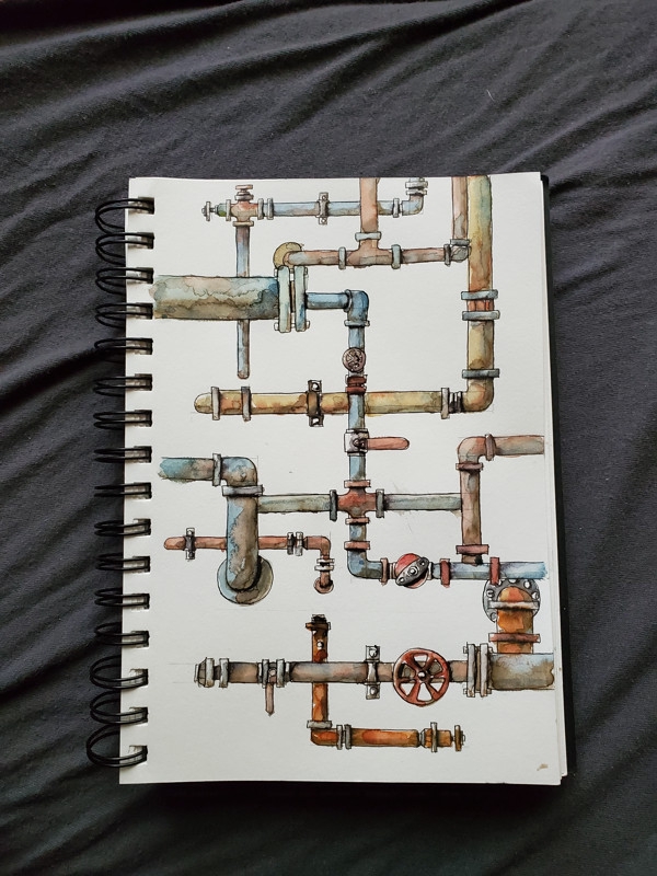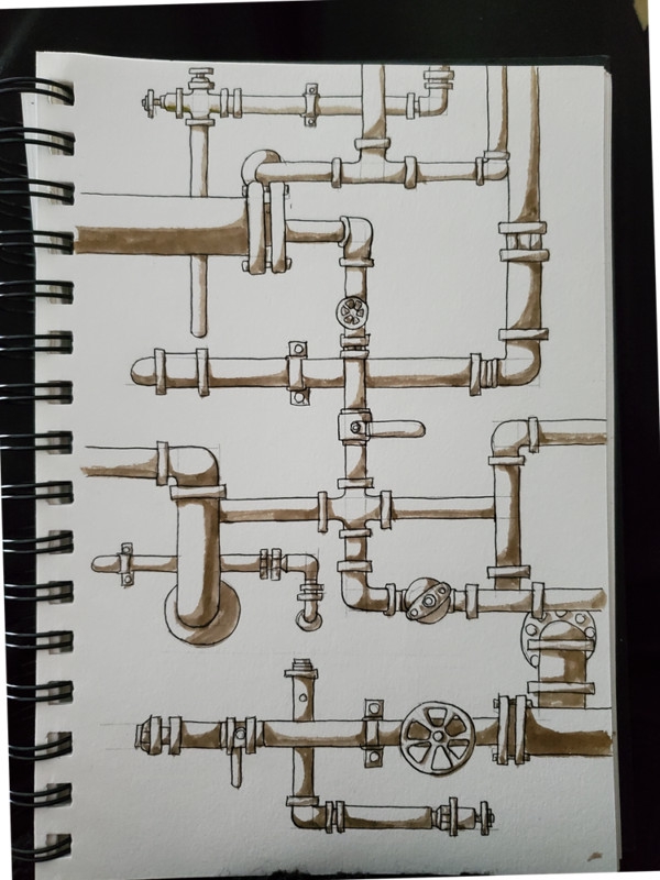 Попробовал применить пайплайн как в цифре. контур->тени->цвет. Чтобы тенью не размыть тушь, наложил ее акварельным маркером. Плавный переход не делал, смысла нет. Цвет ложил уже кистью, от которой тушь конечно размывается и грязнит, поэтому сделать чистые прозрачные цвета нет возможности. Поэтому ставка на грязную, гранжовую лессировку. Как оказалось, от предварительной тени толку мало, слишком теплый цвет. Наносить ее нужно было каким-нибудь серо-синим цветом. Жаль в свое время проебал купить набор серых маркеров для дизайнеров механизмов. Так как тематика трубы - грязные пятна и потекшая тушь выглядят в тему. Да, пресловутой акварельной легкости на которую надрачивают деды тут нет, и похуй.