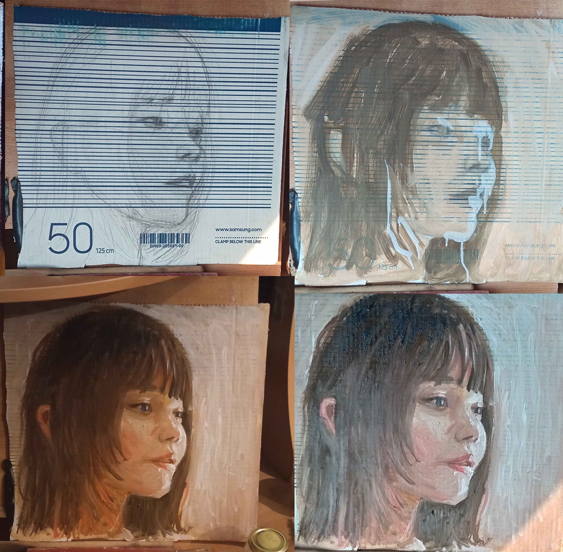 Какой свет используете, я в основном рисую в 8-9 вечера, занавешиваю окна и ставлю лампу светодиодную на 20вт с 6500к, но у меня от нее очень сильные блики, почти под любым ракурсом, а если острый угол сделать то появляются тени на фактуре холста