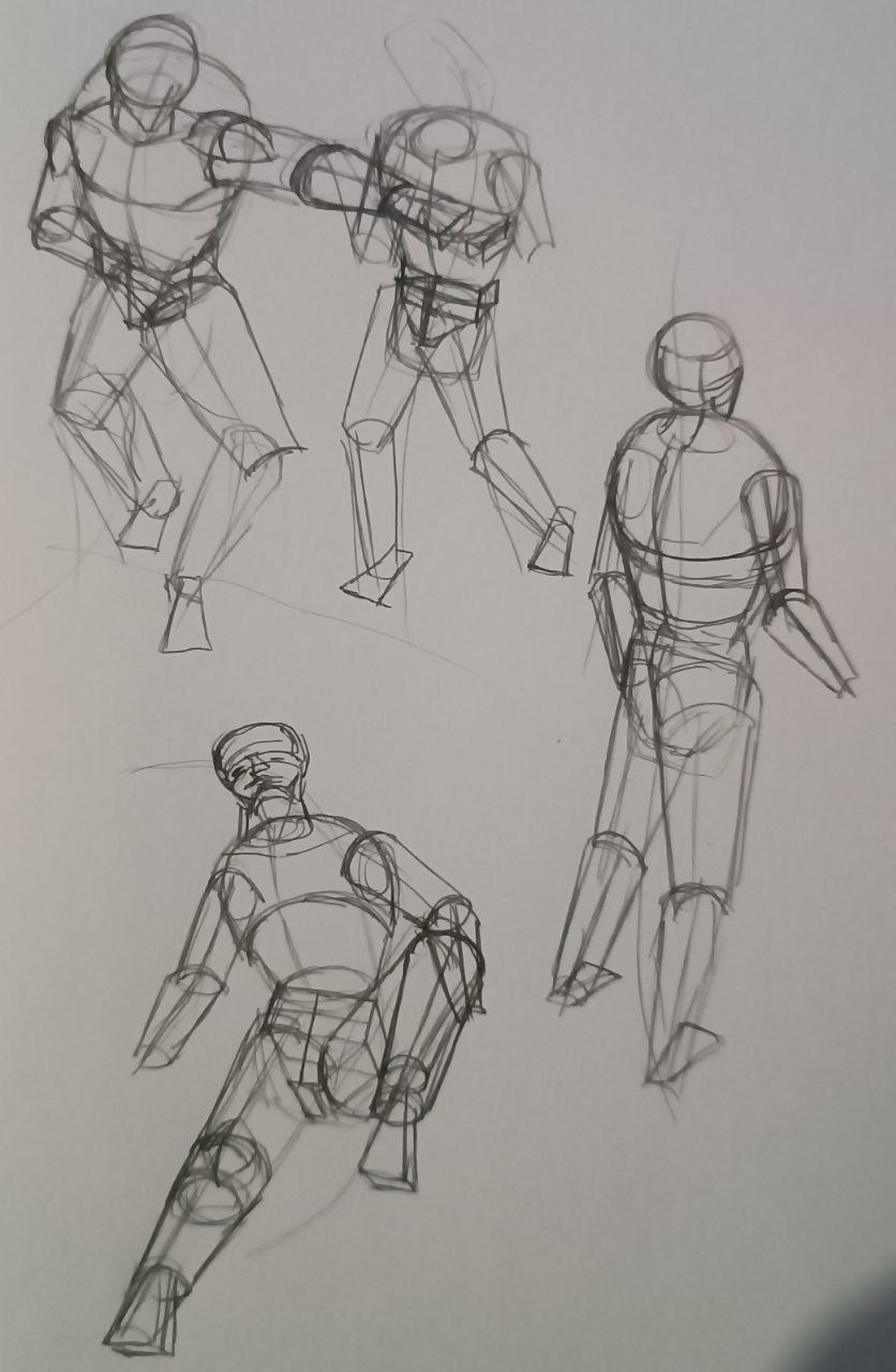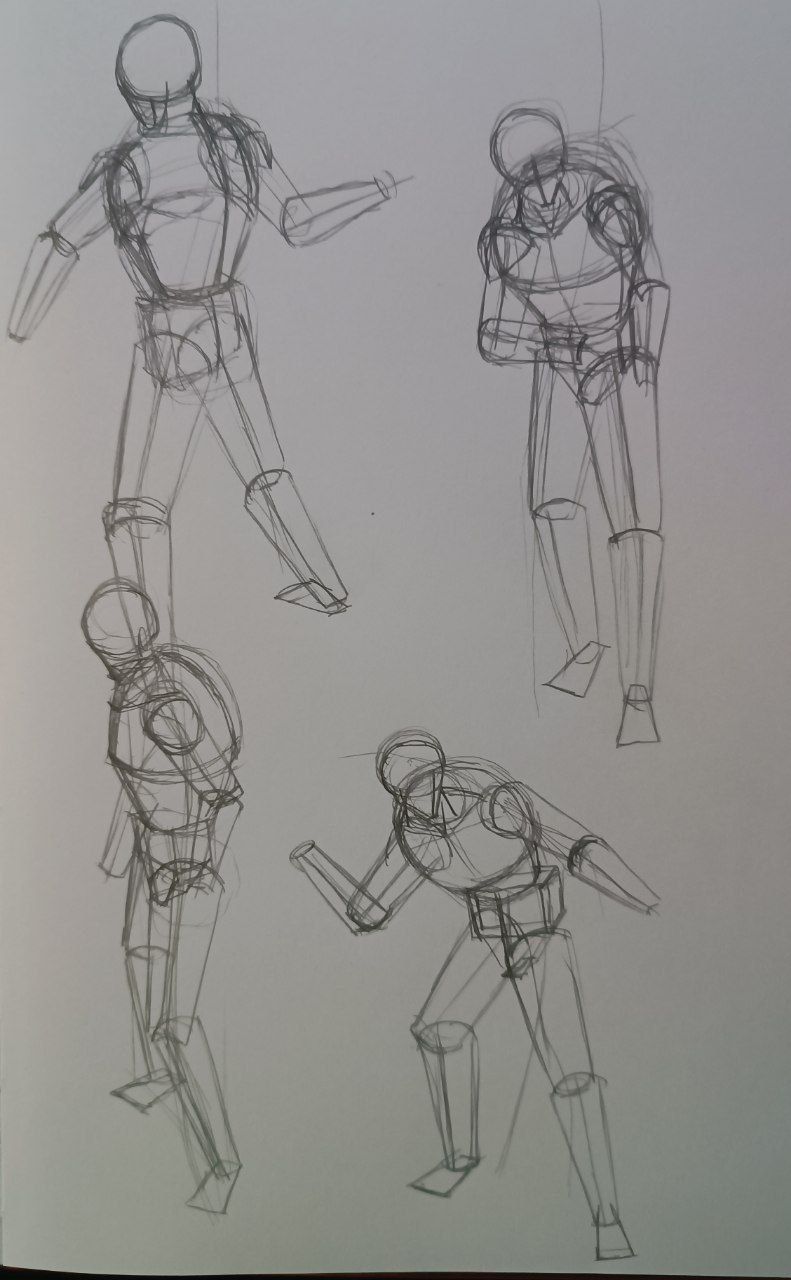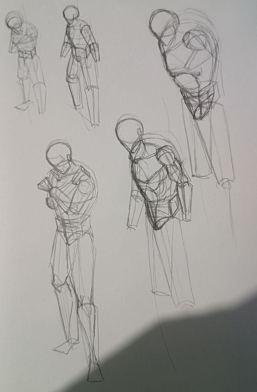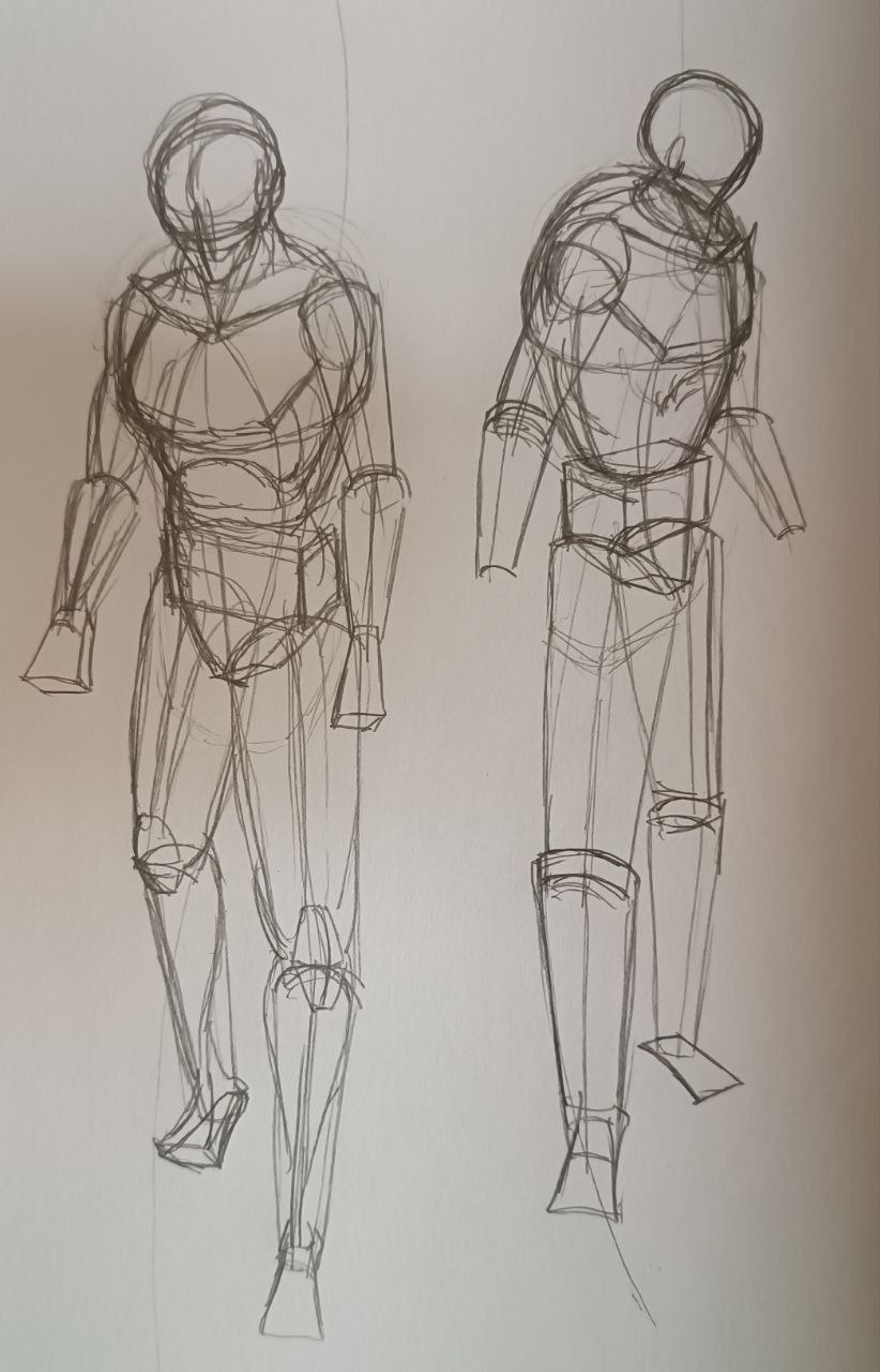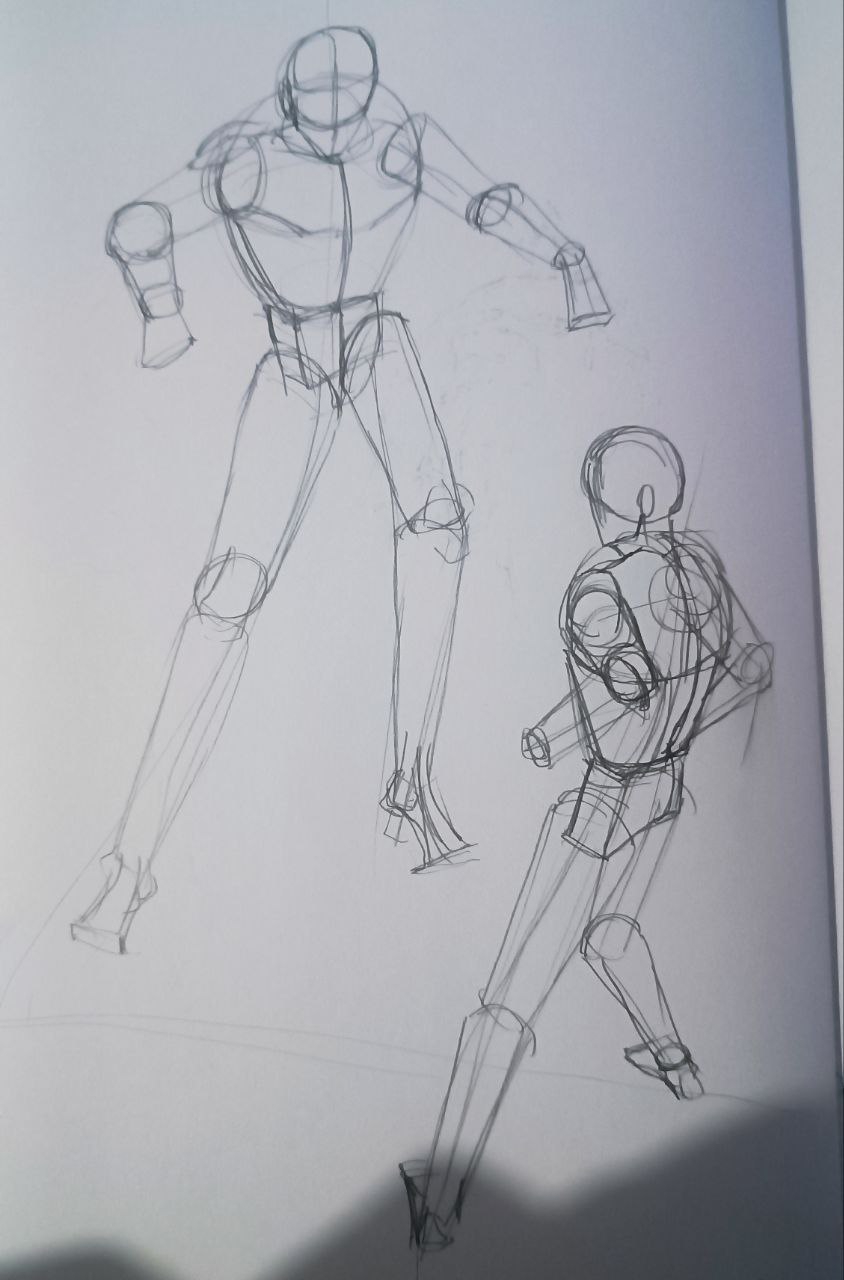 вечером: надо повторить принцип построения из книги Дэвида Росса. надо обратить внимание на пропорции манекенов. надо обратить внимание на поворот манекена в пространстве. мышцы пока не прорисовывать.