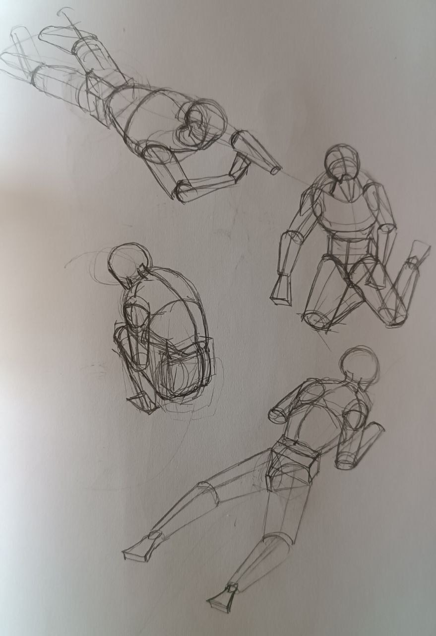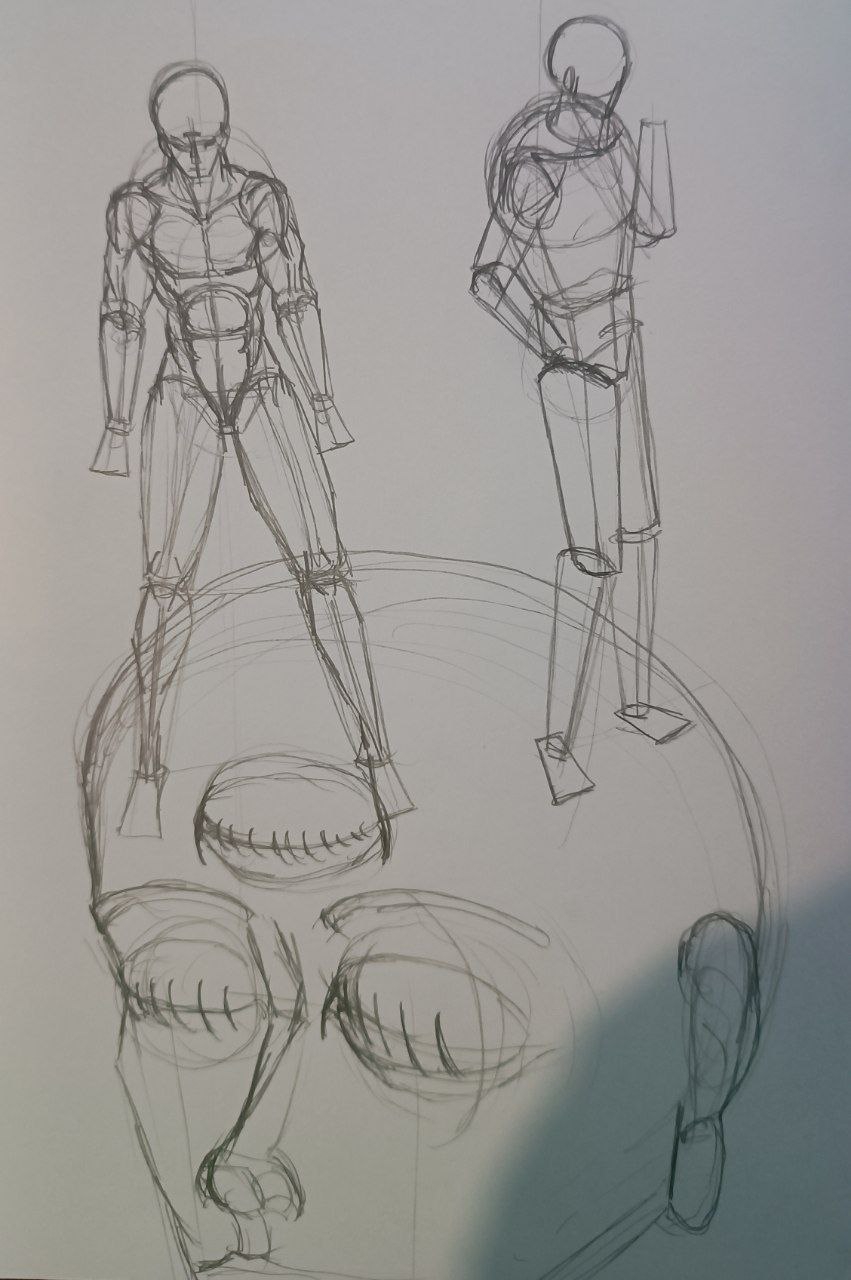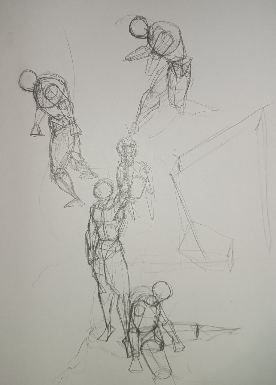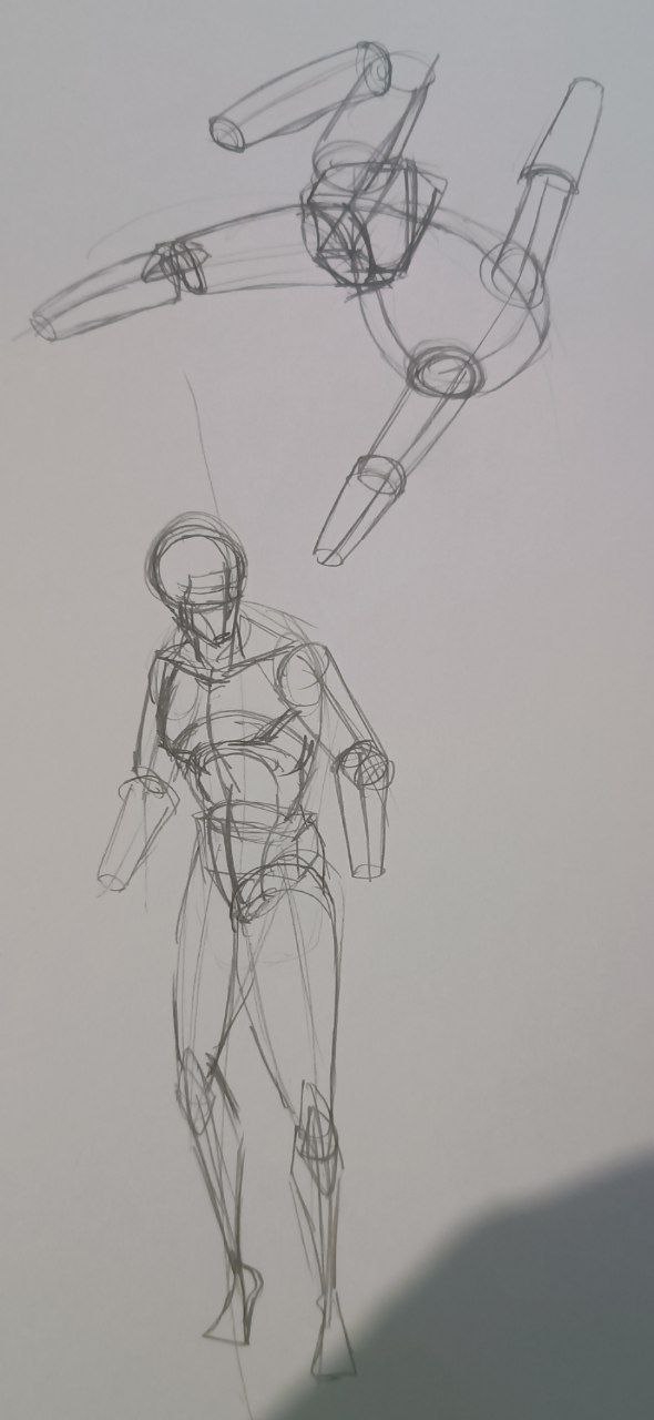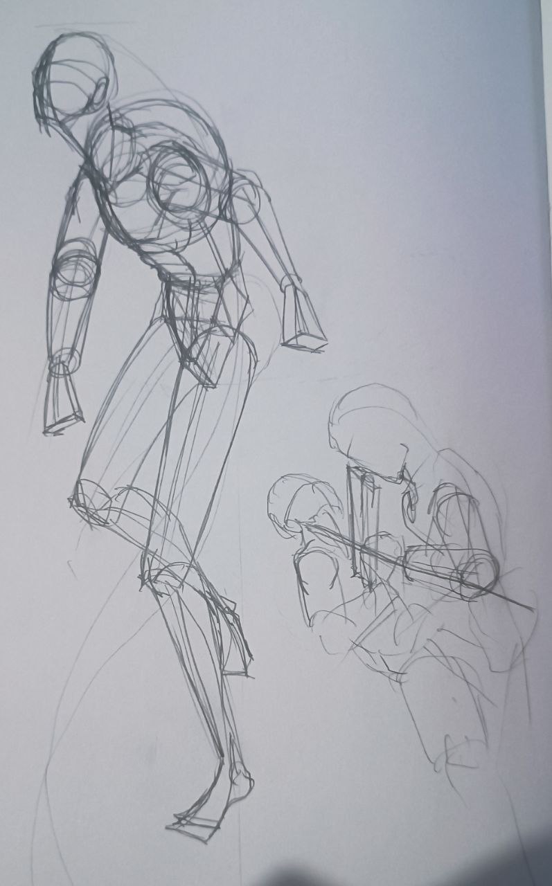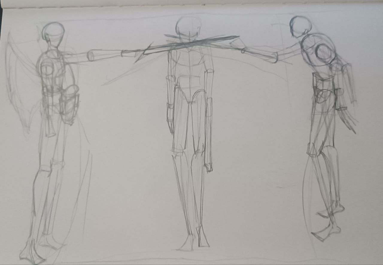 вечером: надо повторить принцип построения из книги Дэвида Росса. надо обратить внимание на пропорции манекенов. надо обратить внимание на поворот манекена в пространстве. мышцы пока не прорисовывать.