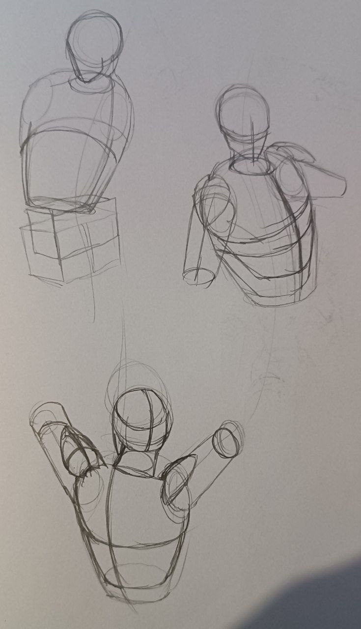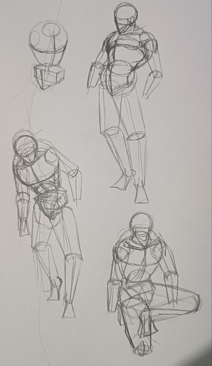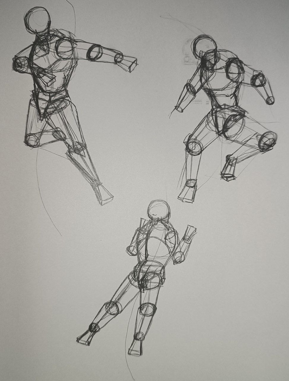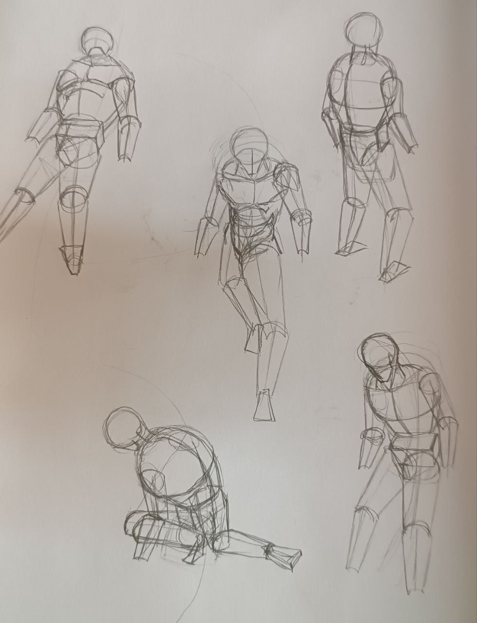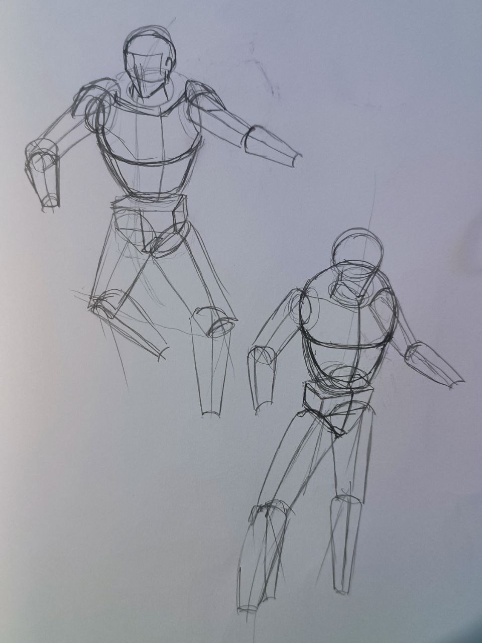 вечером: надо повторить принцип построения из книги Дэвида Росса. надо обратить внимание на пропорции манекенов. надо обратить внимание на поворот манекена в пространстве. мышцы пока не прорисовывать.