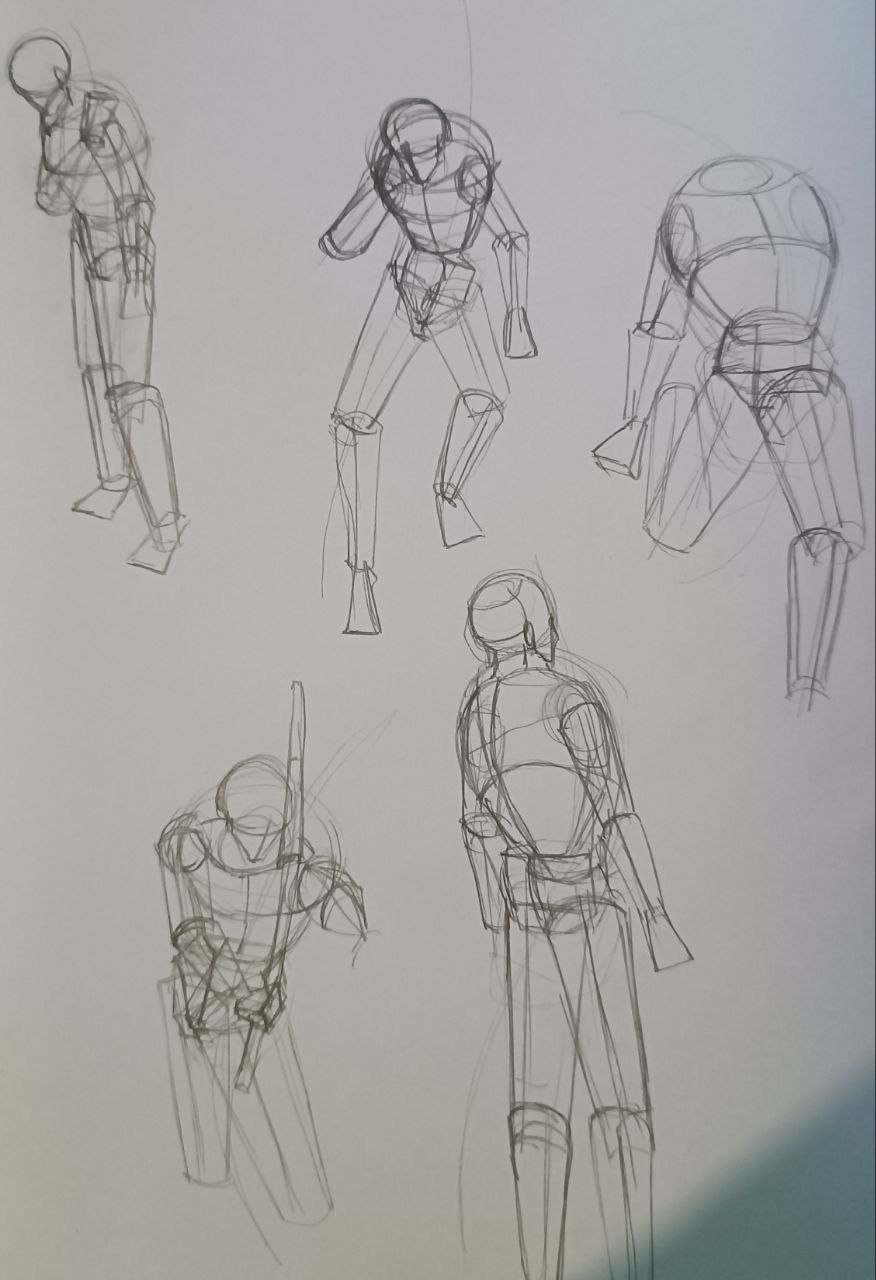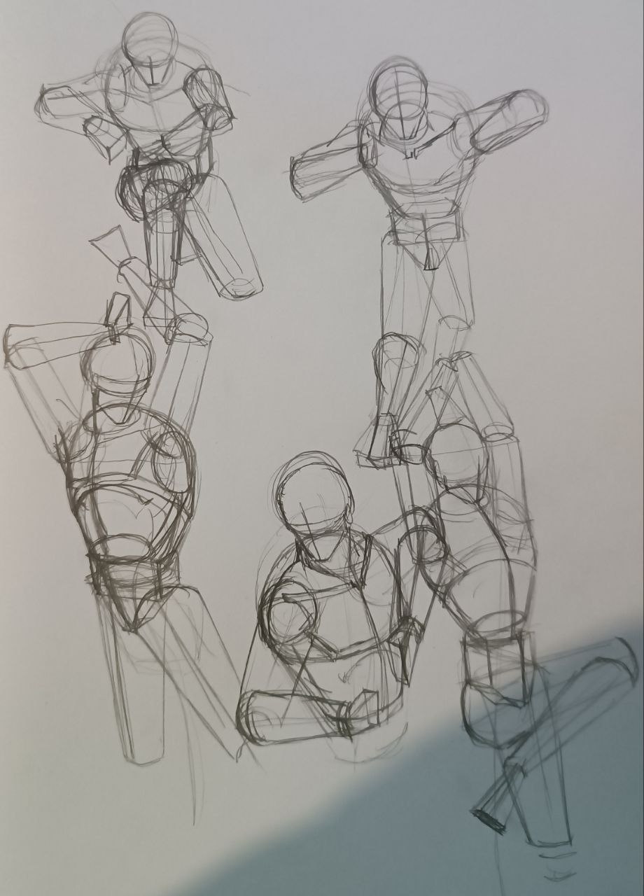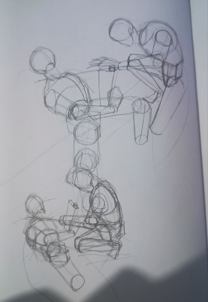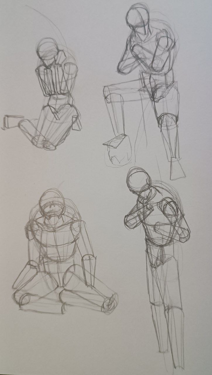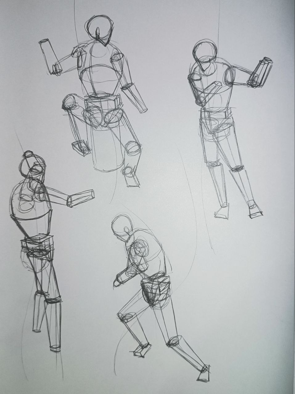 вечером: надо повторить принцип построения из книги Дэвида Росса. надо обратить внимание на пропорции манекенов. надо обратить внимание на поворот манекена в пространстве. мышцы пока не прорисовывать.