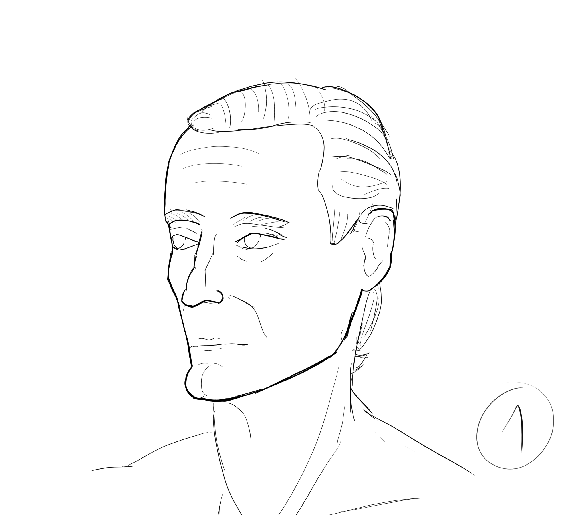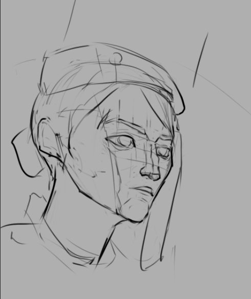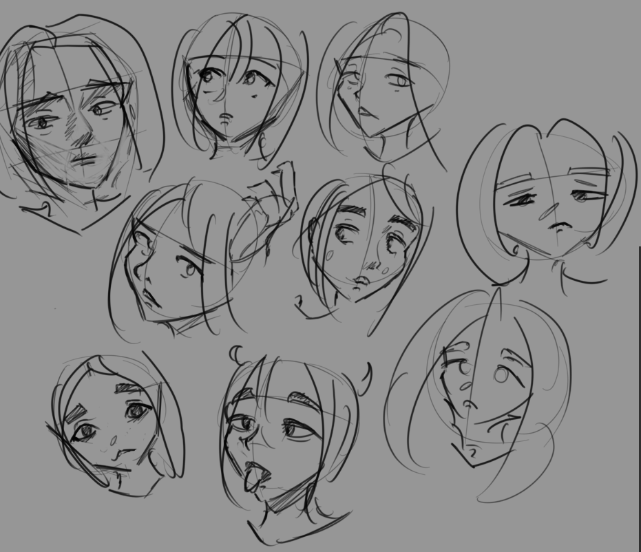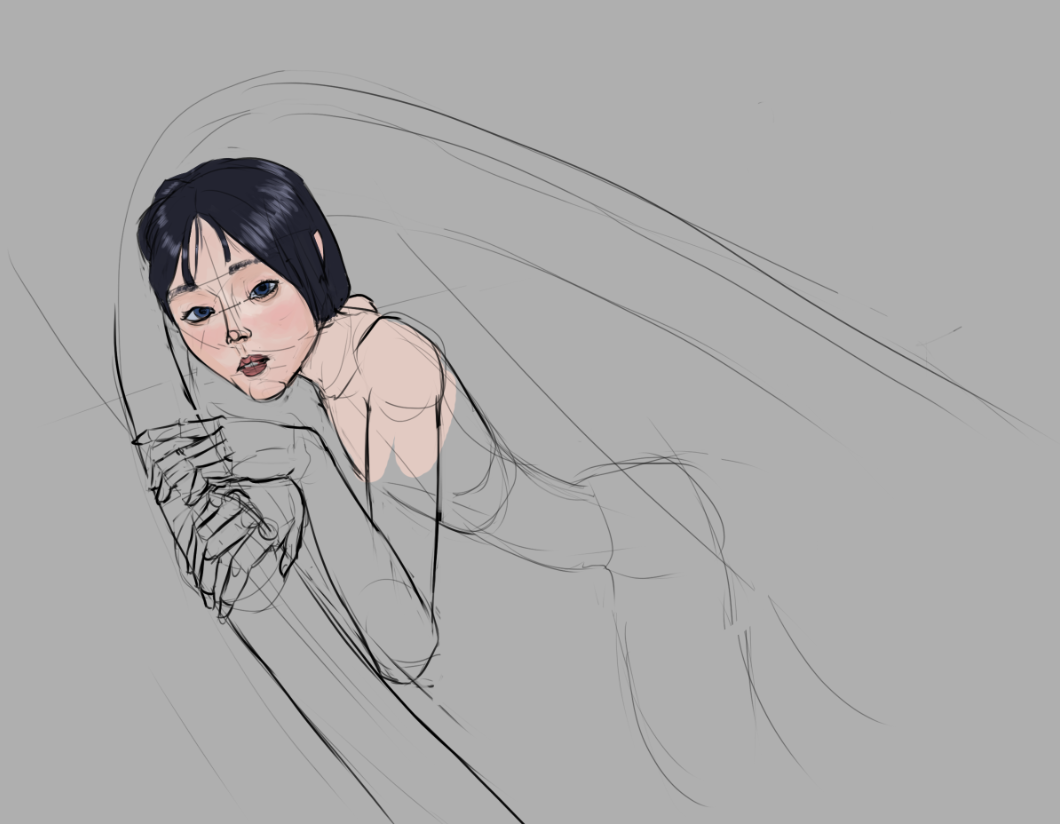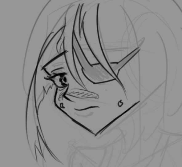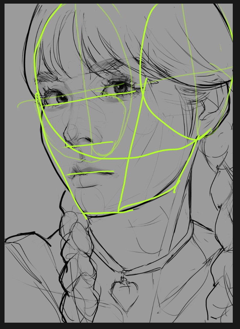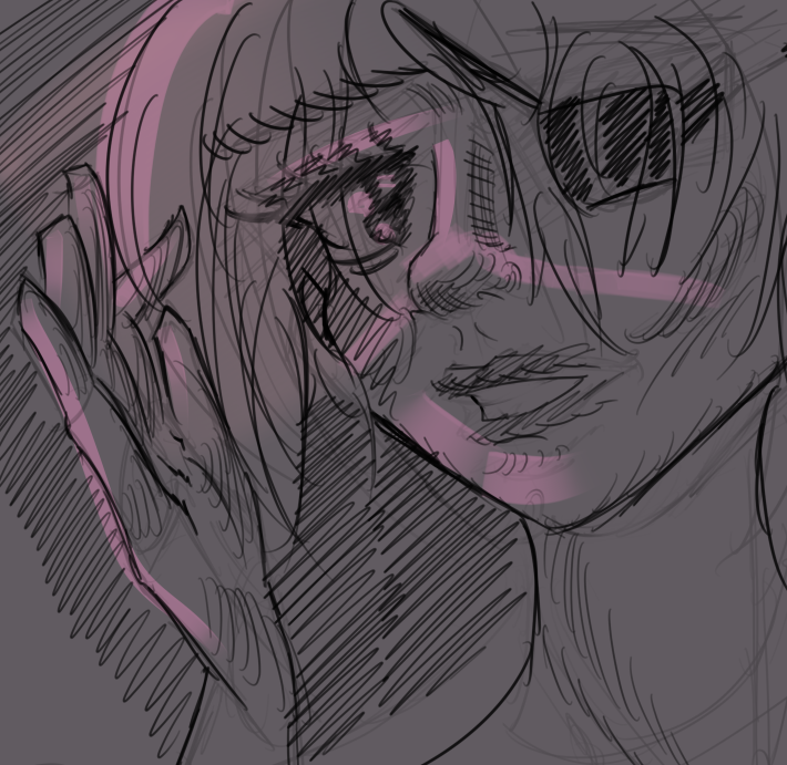Отчитывается анон с челленджем. День 2. Нашел время и сегодня порисовать в диджитале. Сделал набросок под интересным углом. По задумке она должна была удивится смотря чуть выше. Сразу учитывал перспективу, линии и помнил что волосы должны быть объёмнее. Вроде делал по пропорциям и учитывал плоскость черепа и тд. На выходе получился какой-то пиздец с лопатой вместо лица. Подумал что можно это исправить уменьшив челюсть. Пришлось еще и с кругами немного покопаться.