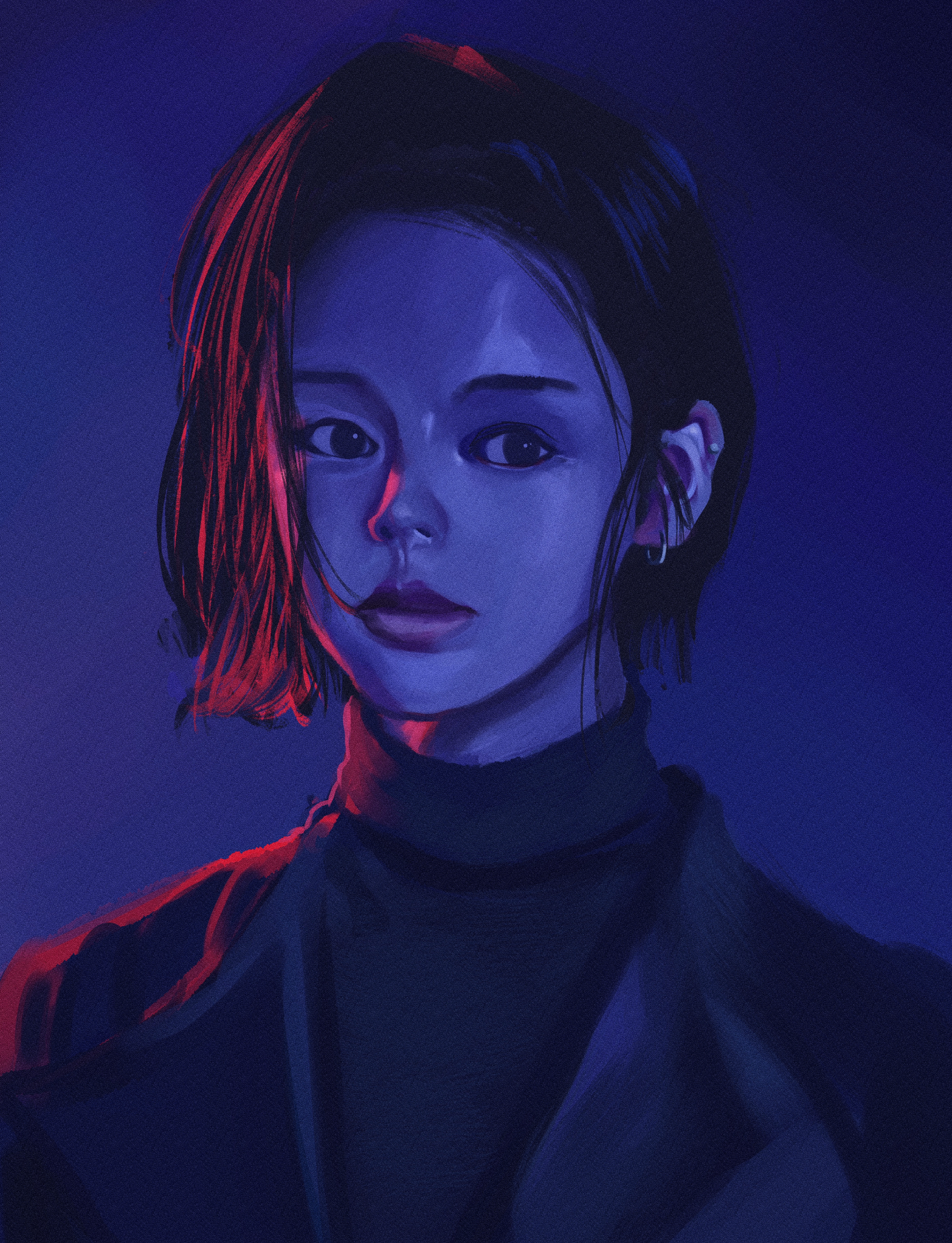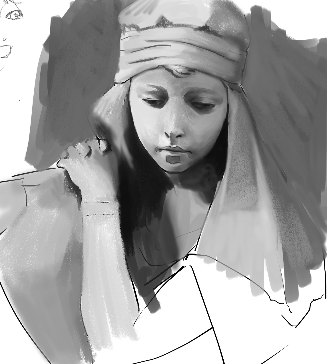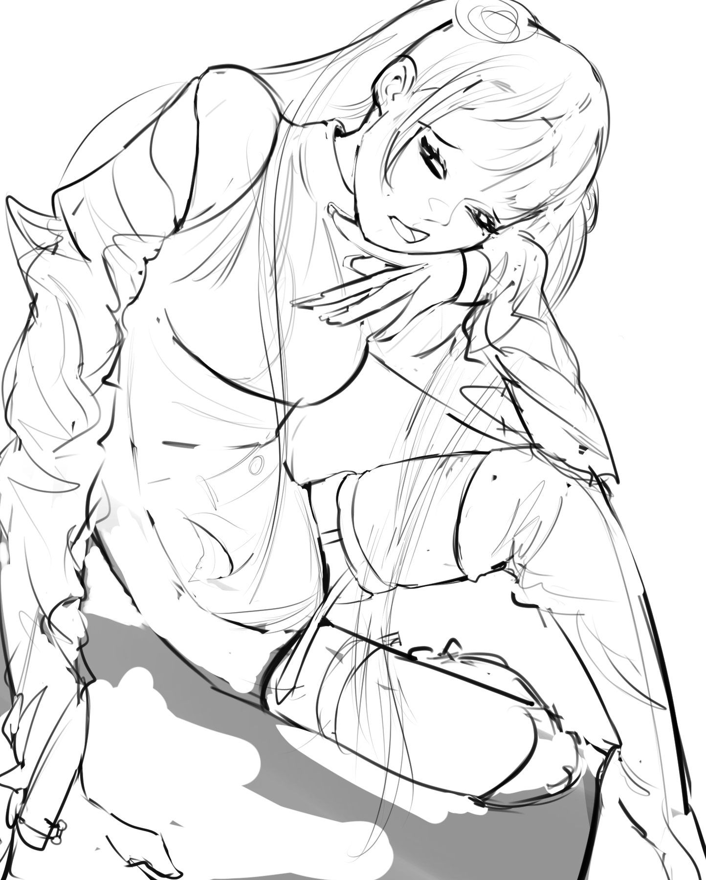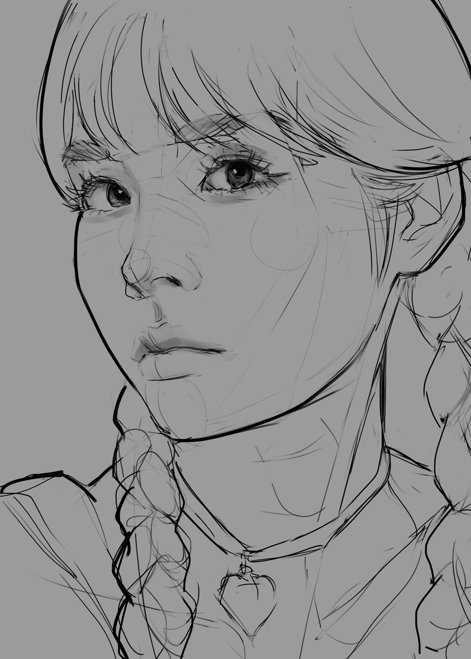 Отчитывается анон с челленджем. День 2. Нашел время и сегодня порисовать в диджитале. Сделал набросок под интересным углом. По задумке она должна была удивится смотря чуть выше. Сразу учитывал перспективу, линии и помнил что волосы должны быть объёмнее. Вроде делал по пропорциям и учитывал плоскость черепа и тд. На выходе получился какой-то пиздец с лопатой вместо лица. Подумал что можно это исправить уменьшив челюсть. Пришлось еще и с кругами немного покопаться.