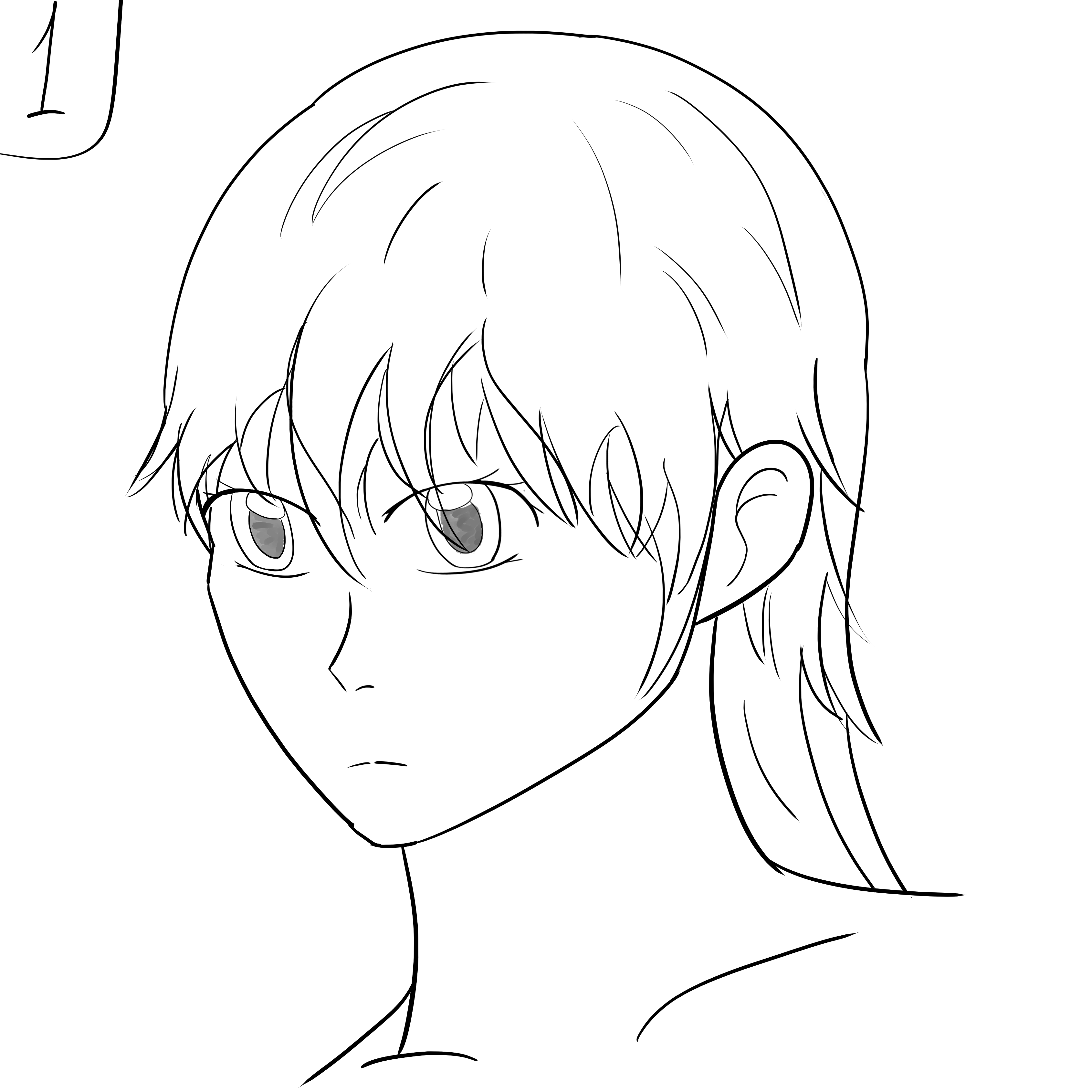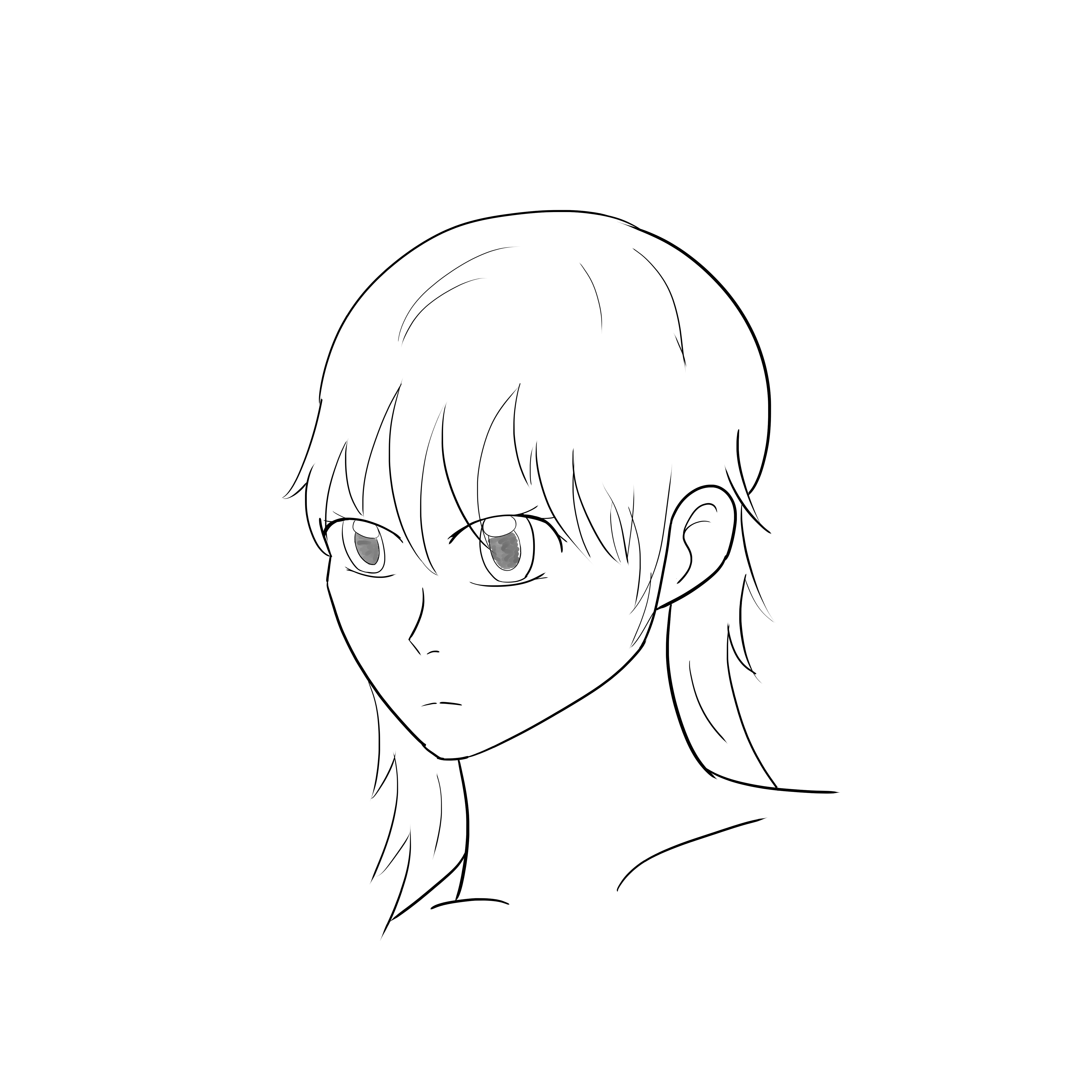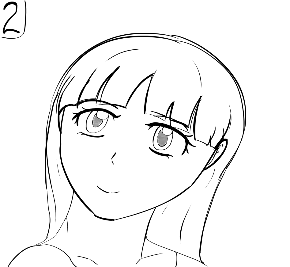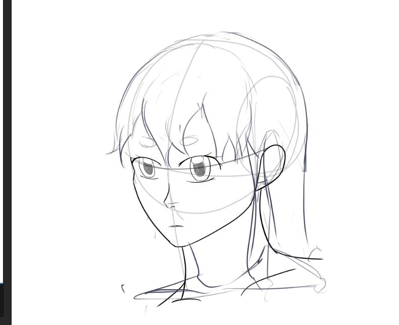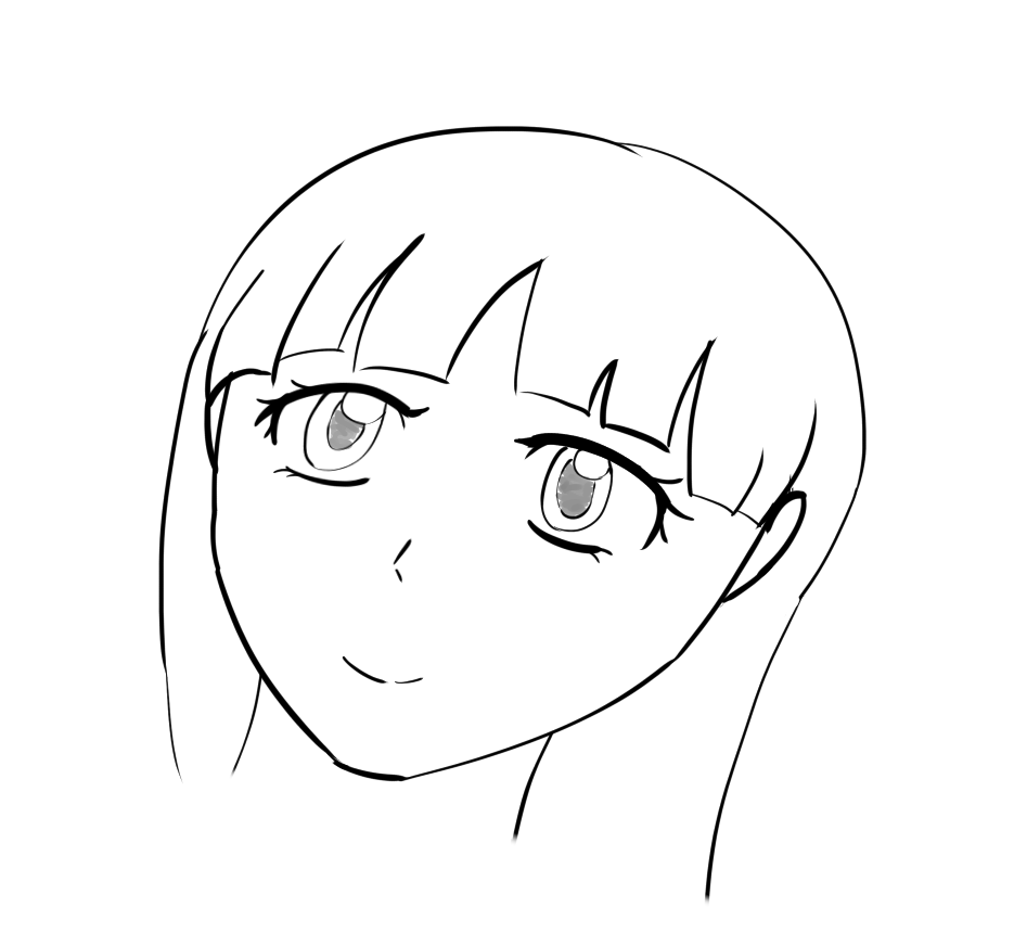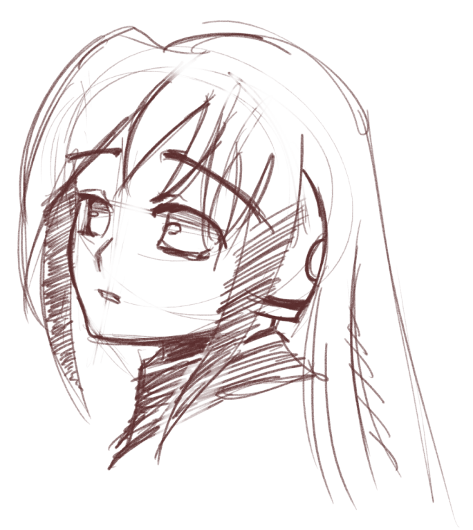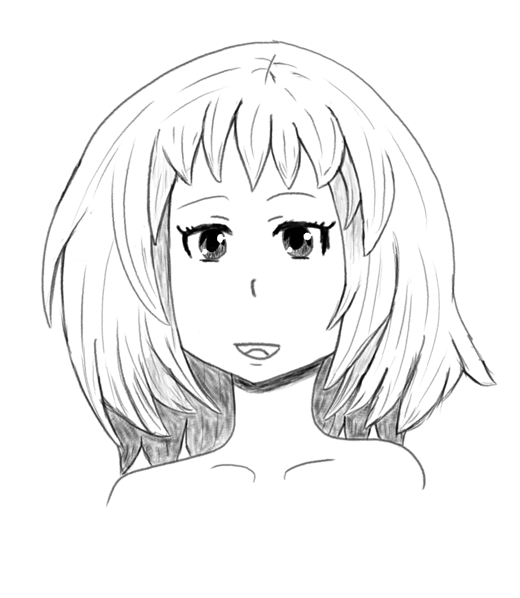 Короче под конец она действительно стала напоминать аниме тянку, но теперь даже я запутался в какой позе она сейчас вообще находится. Толи она смотрит направо чуток наклонясь, толи она просто стоит прямо, но под углом. Челка в этот раз решил нарисовать новую, но и в этот раз она выглядит неправильно.