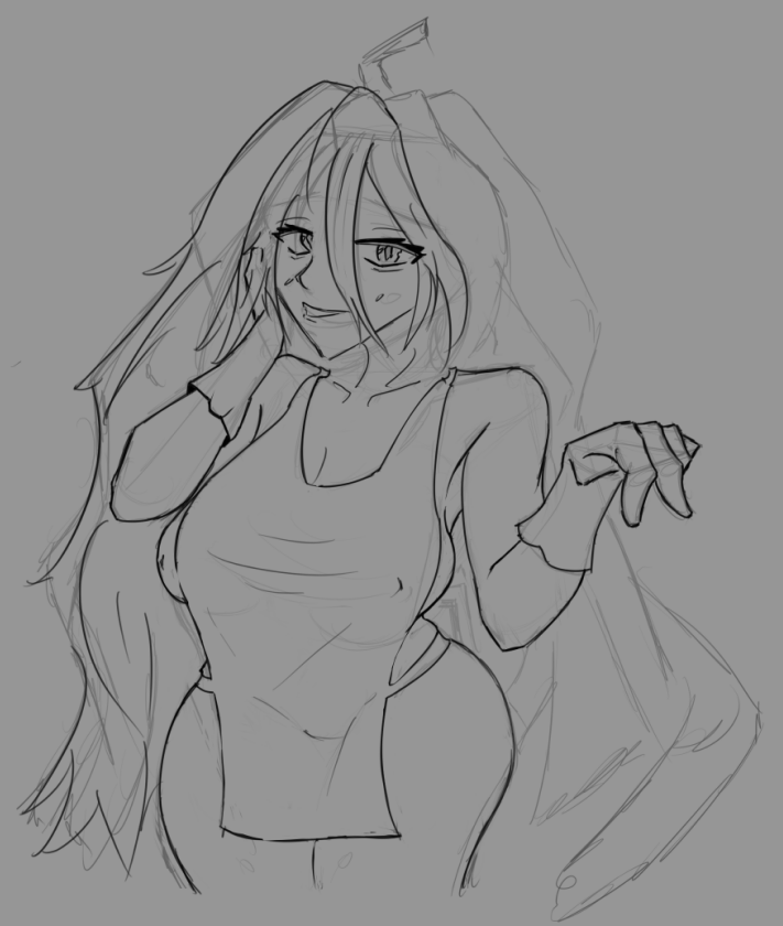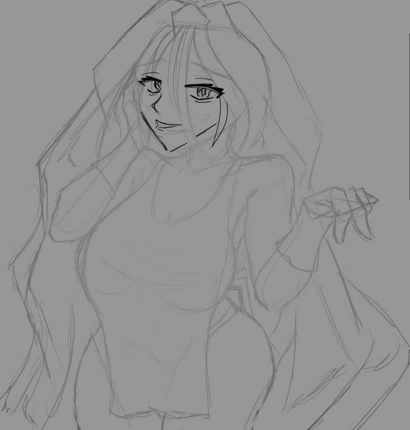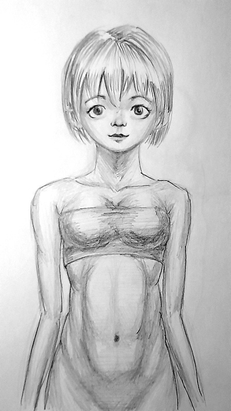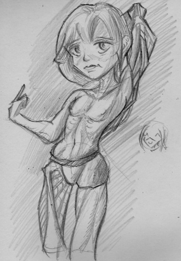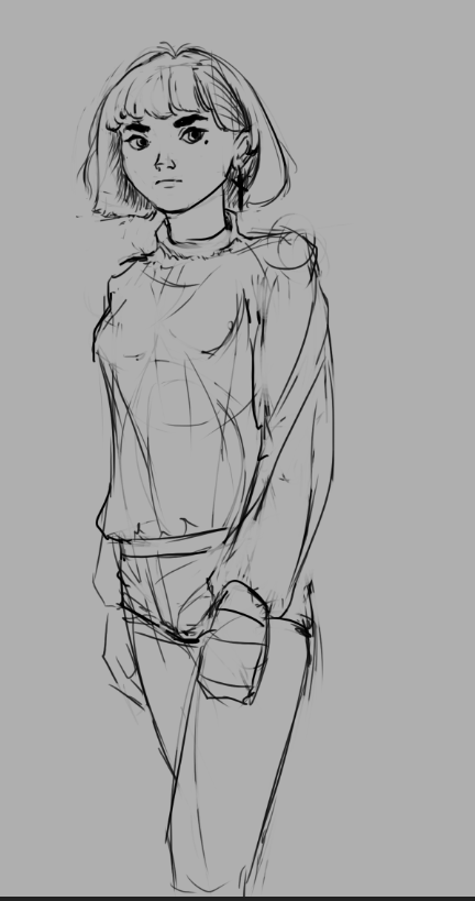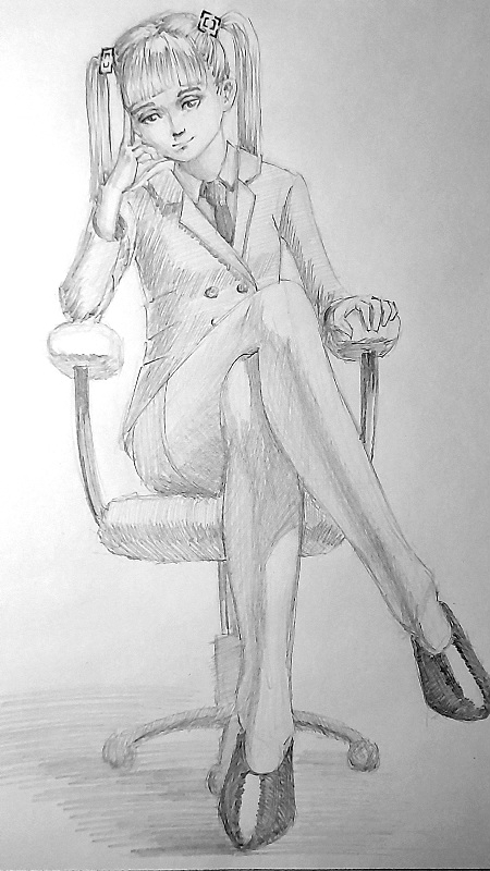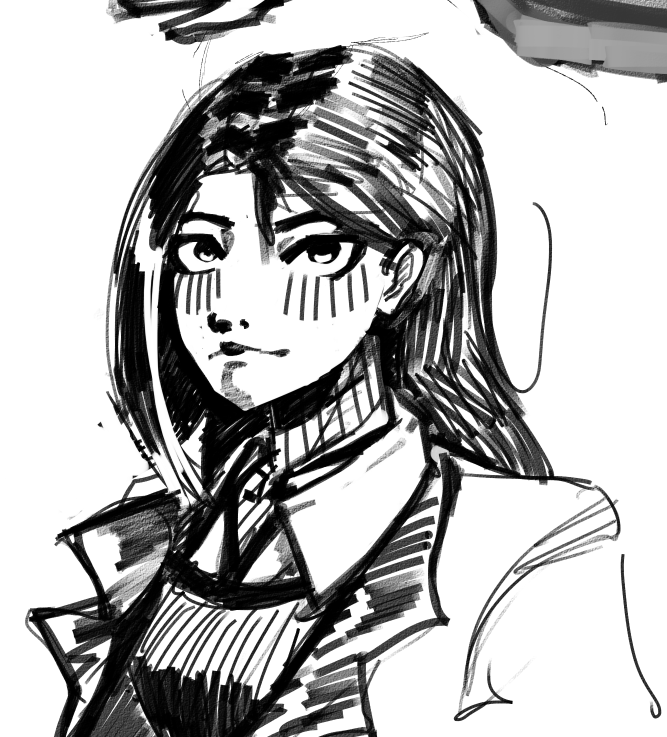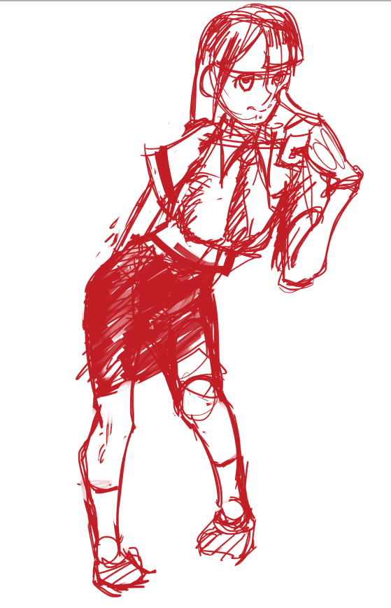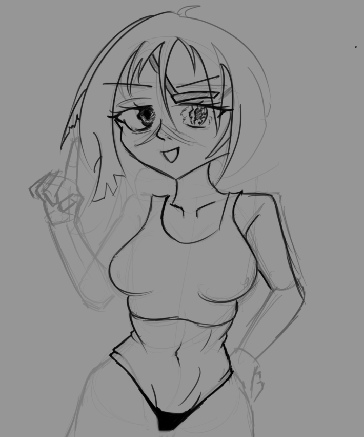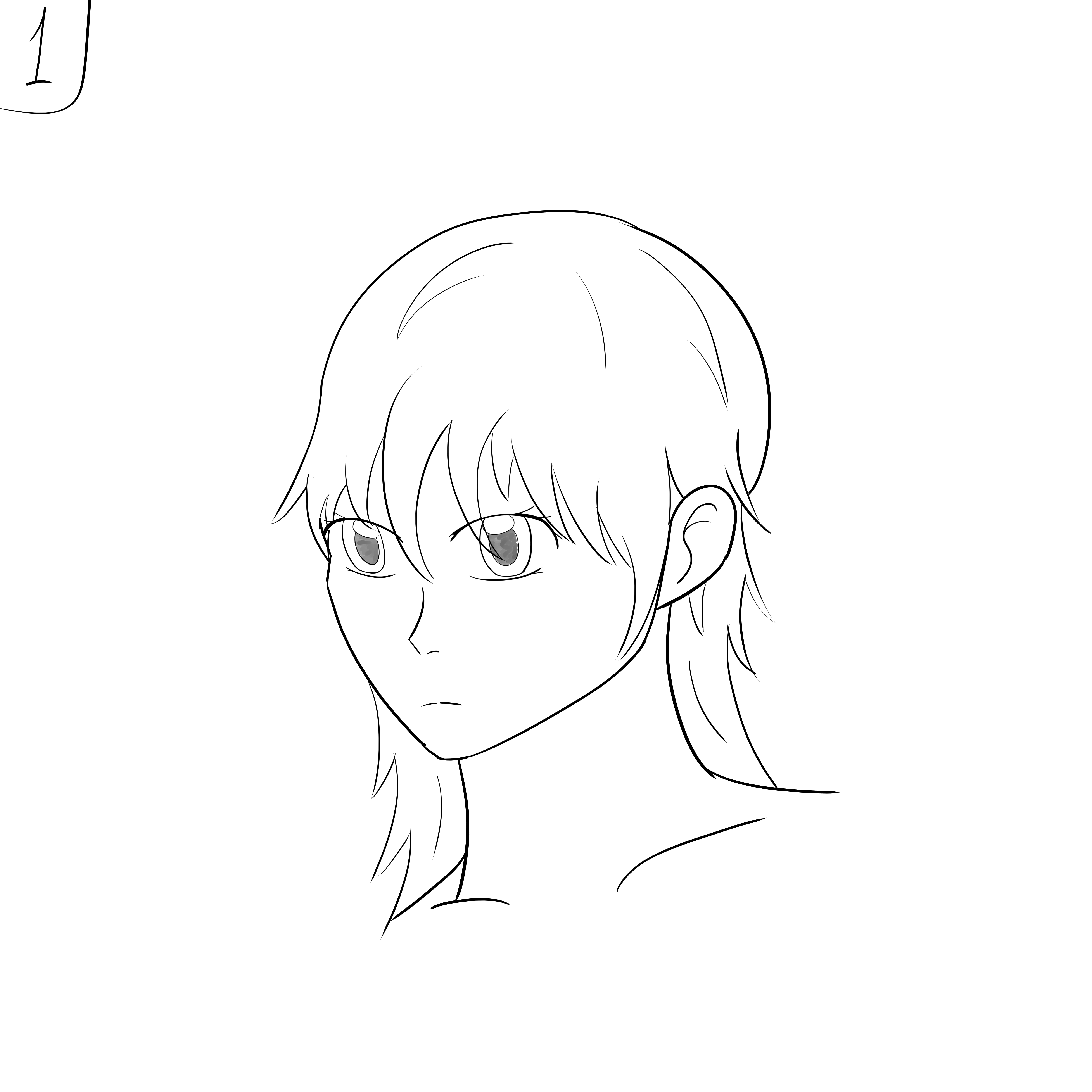 Короче под конец она действительно стала напоминать аниме тянку, но теперь даже я запутался в какой позе она сейчас вообще находится. Толи она смотрит направо чуток наклонясь, толи она просто стоит прямо, но под углом. Челка в этот раз решил нарисовать новую, но и в этот раз она выглядит неправильно.