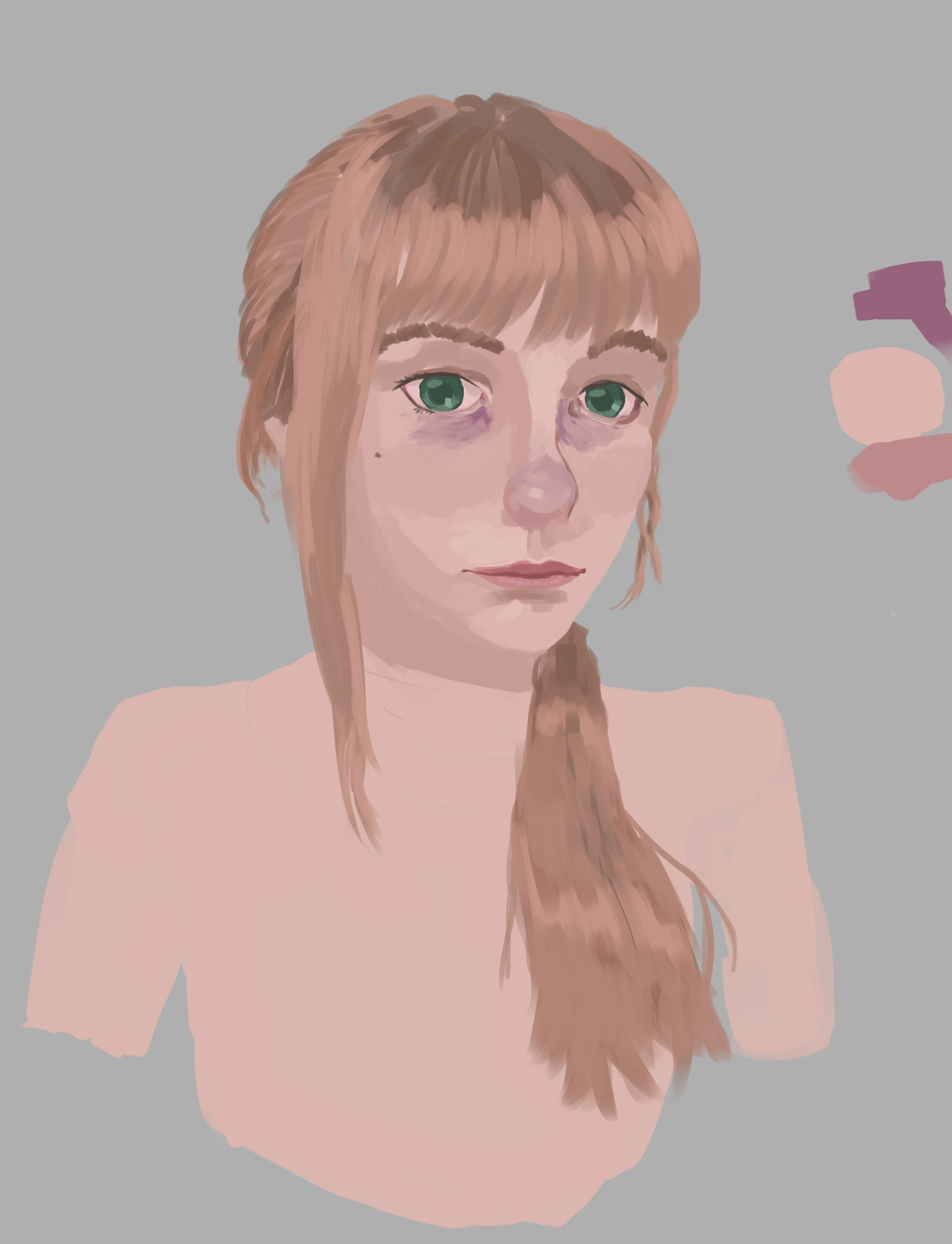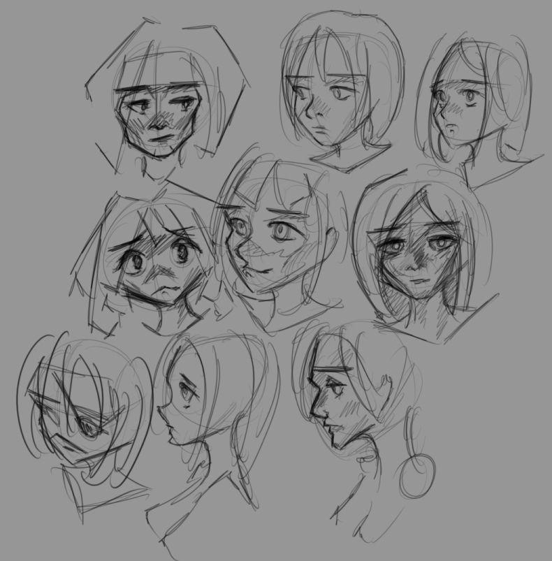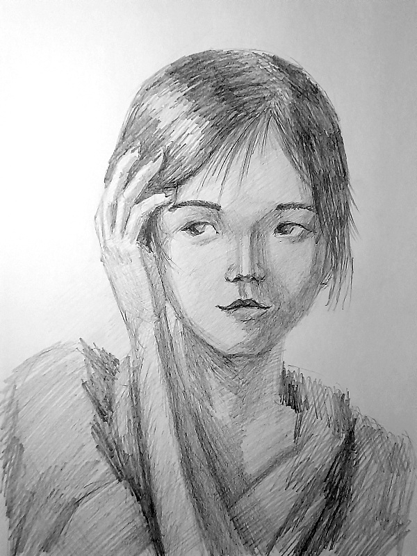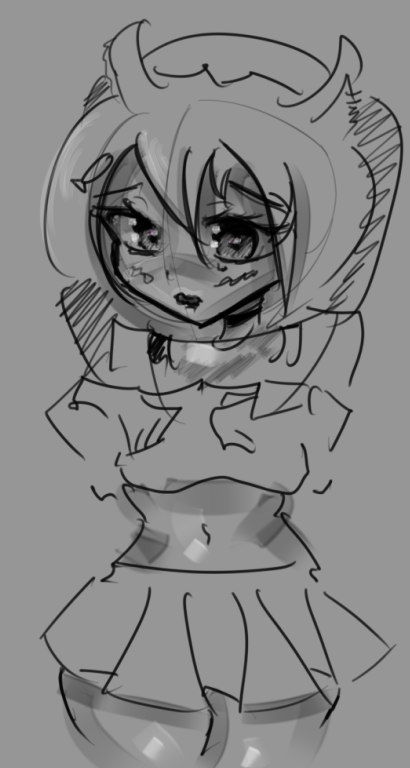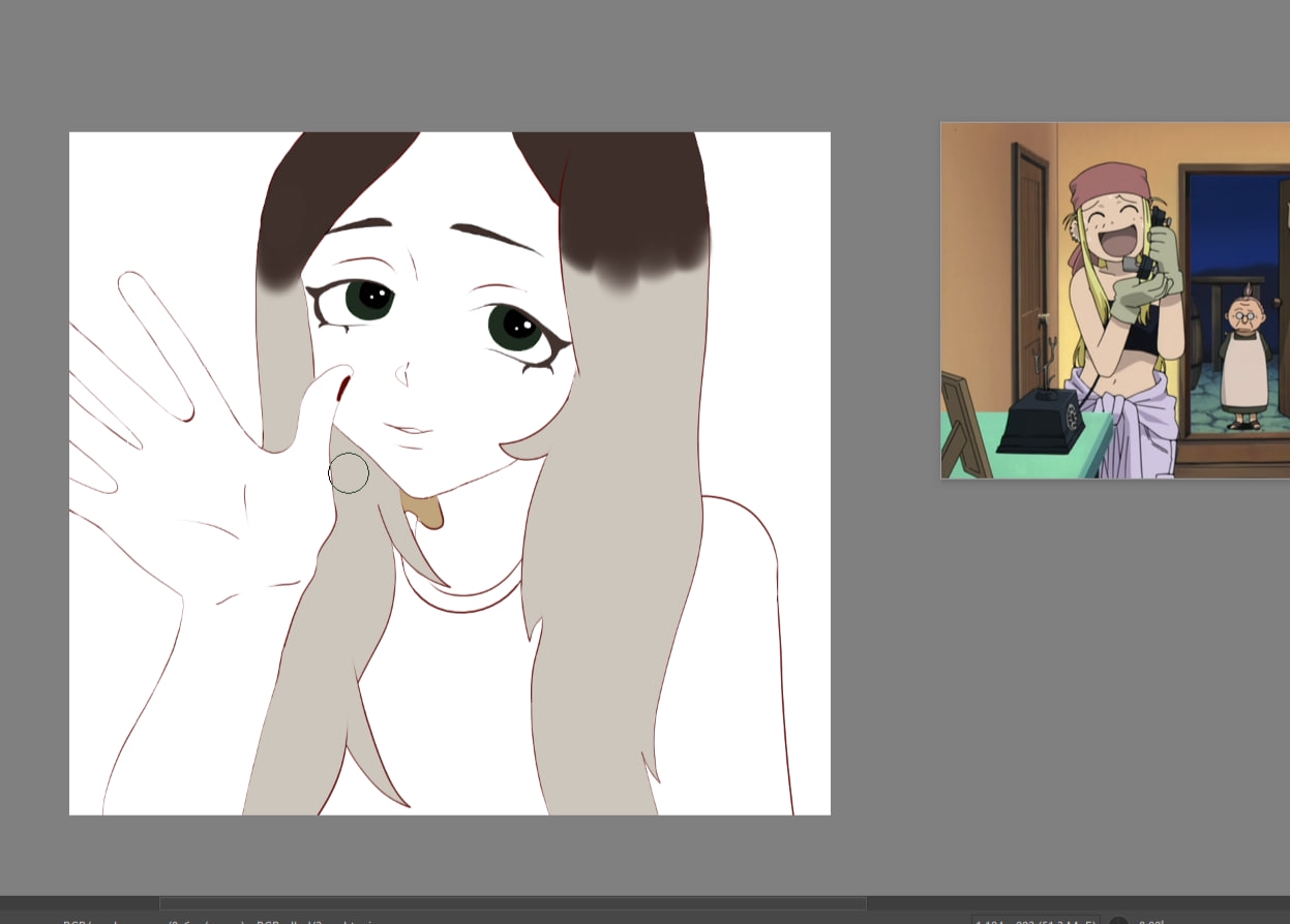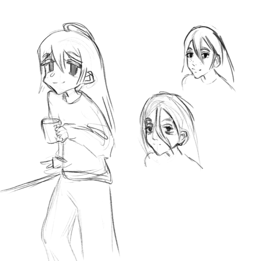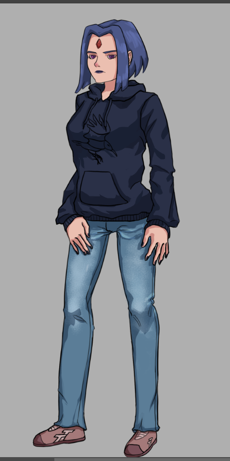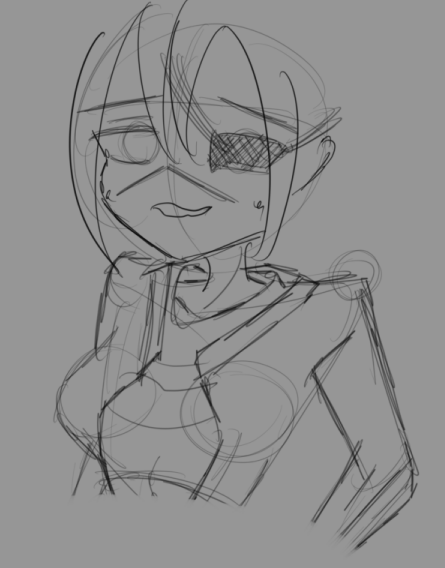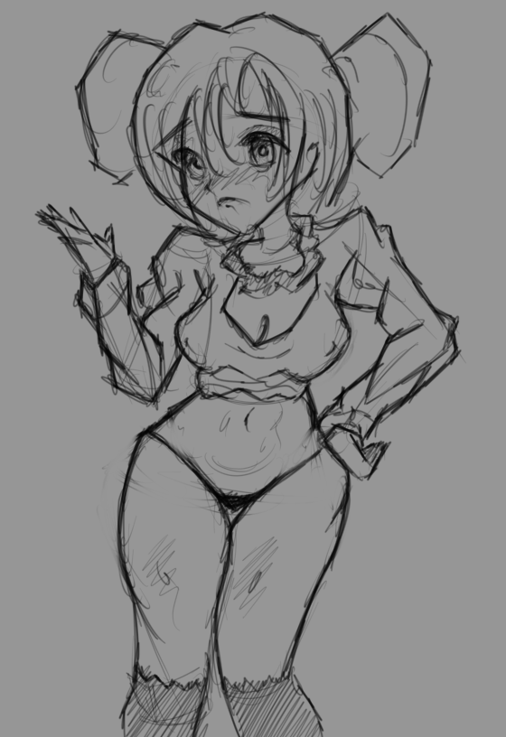 Короче под конец она действительно стала напоминать аниме тянку, но теперь даже я запутался в какой позе она сейчас вообще находится. Толи она смотрит направо чуток наклонясь, толи она просто стоит прямо, но под углом. Челка в этот раз решил нарисовать новую, но и в этот раз она выглядит неправильно.