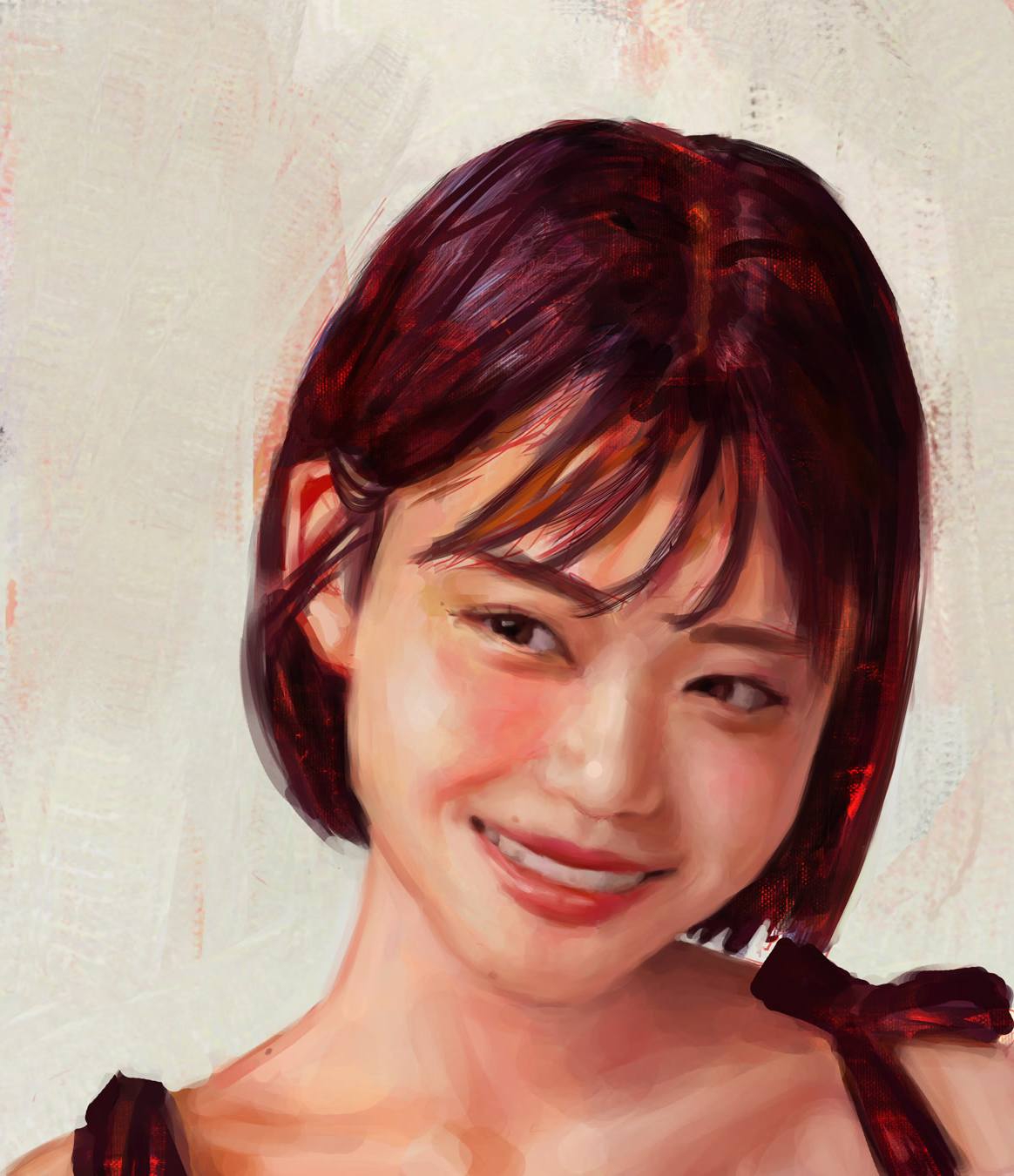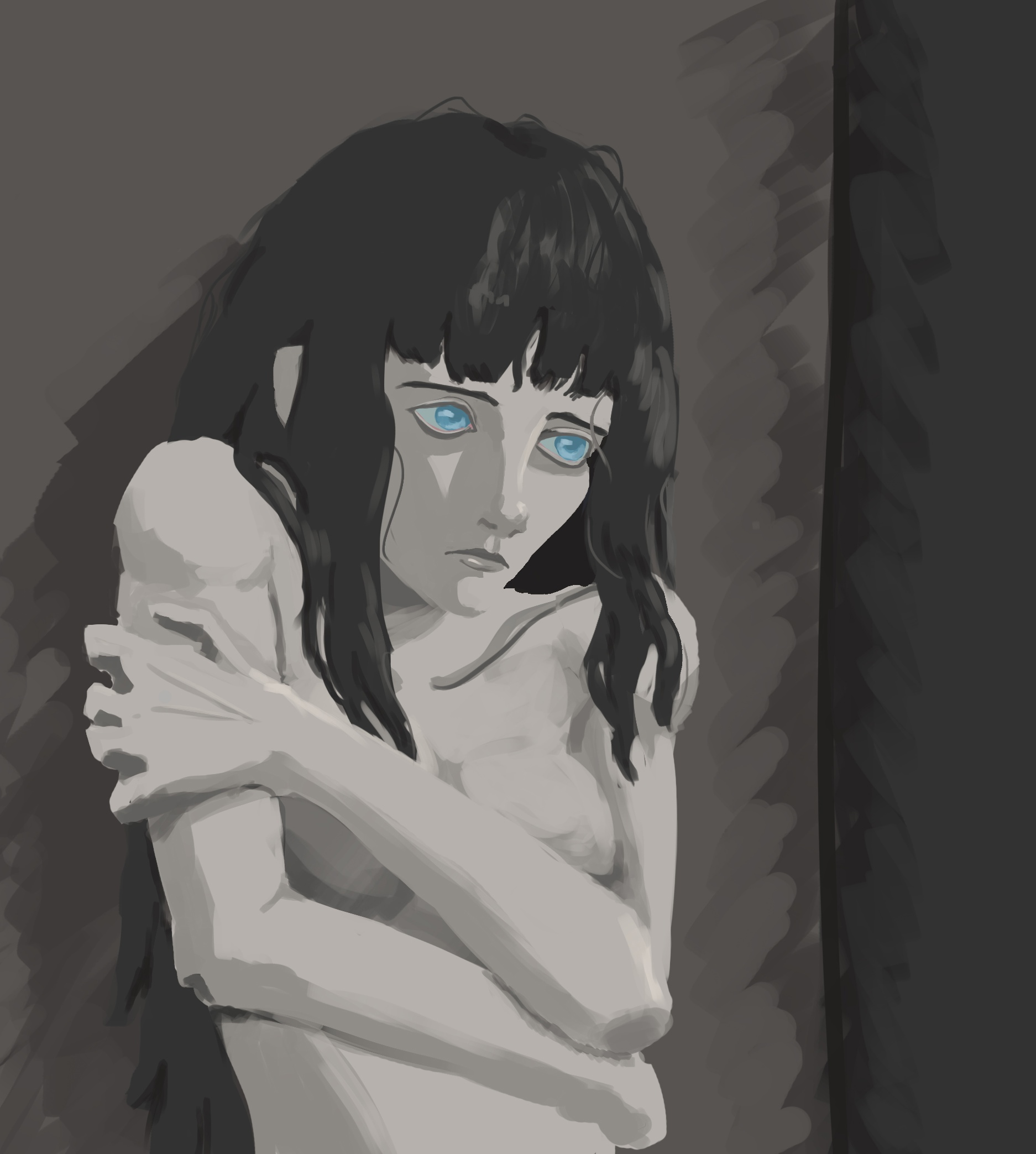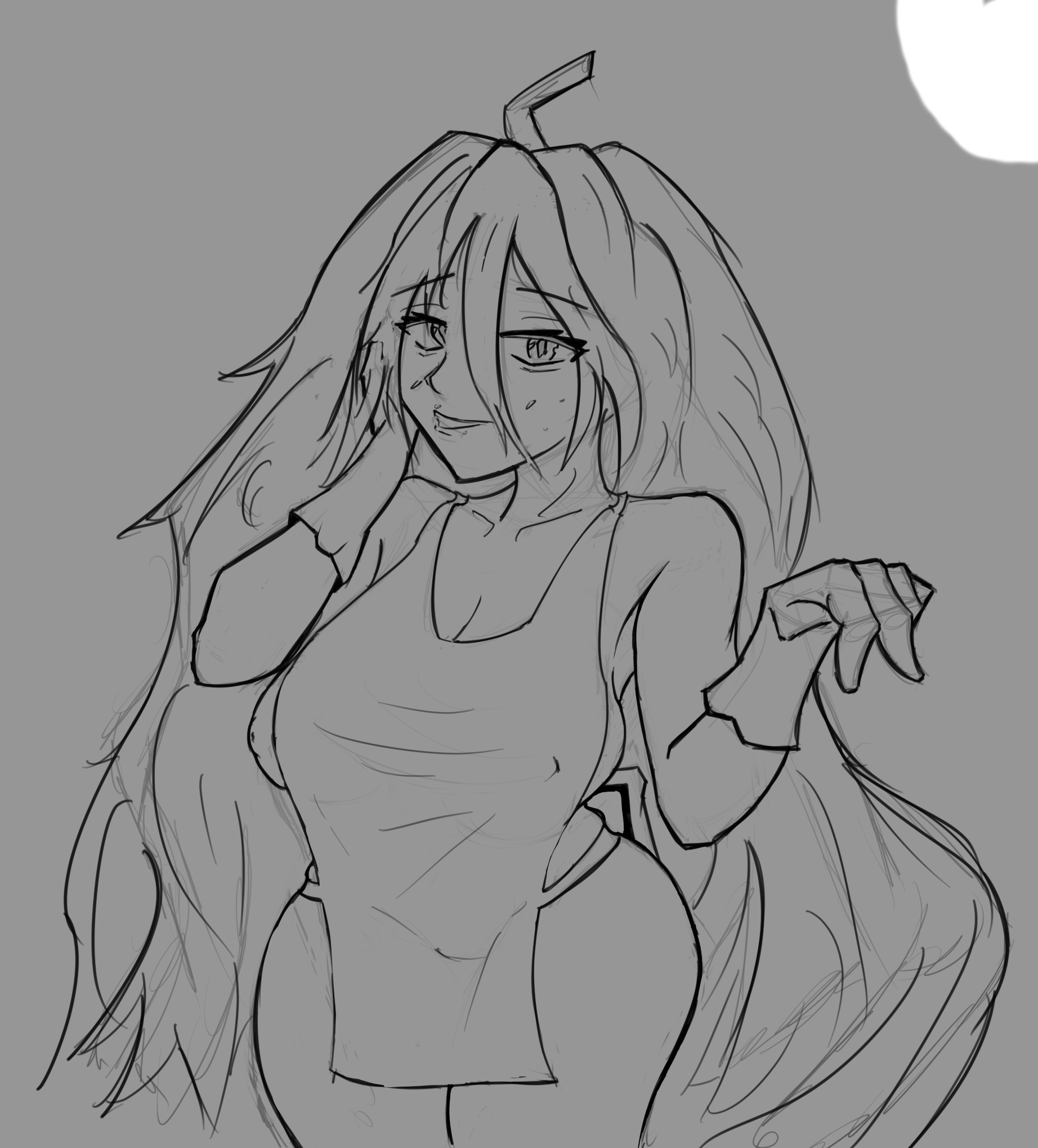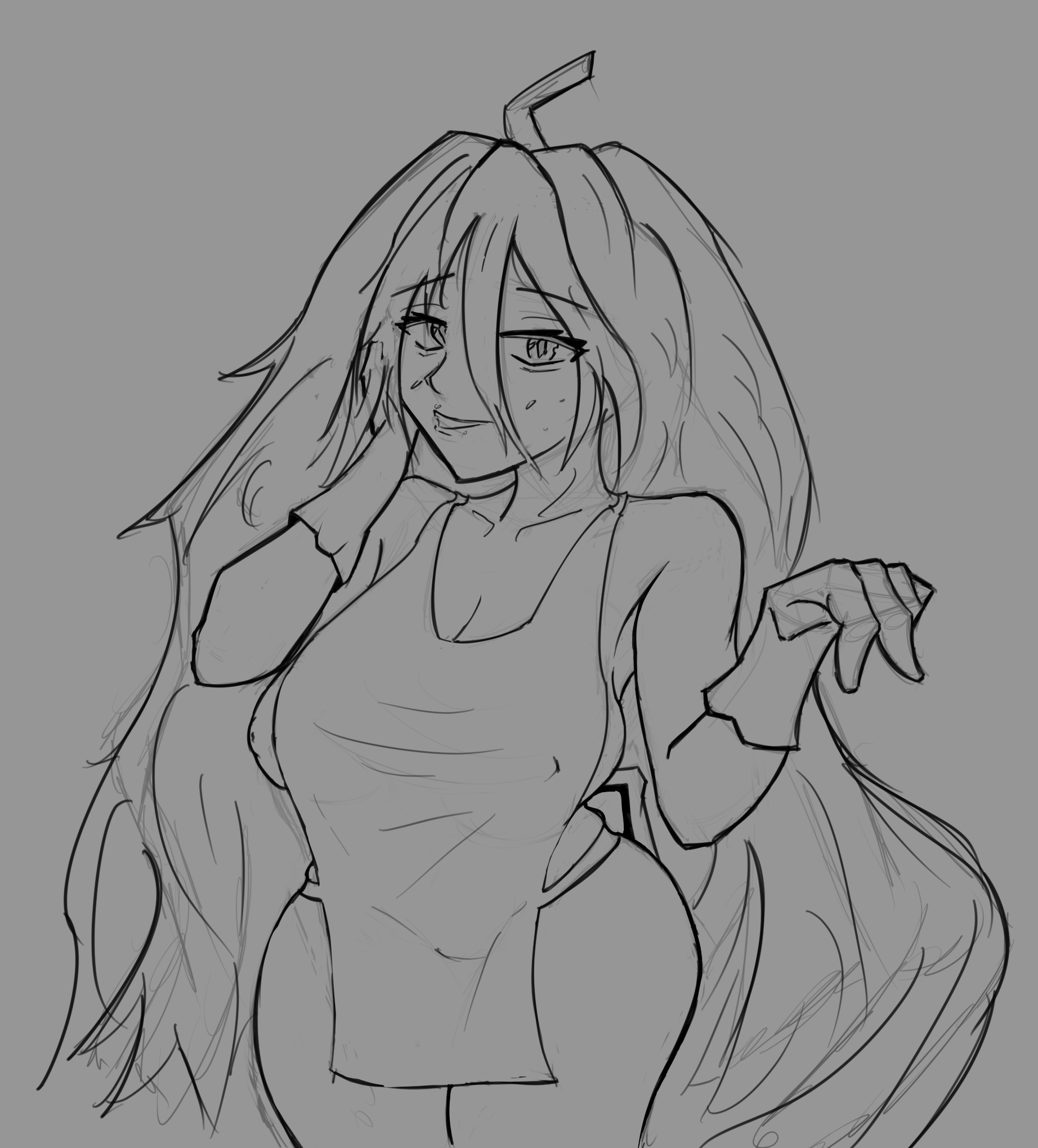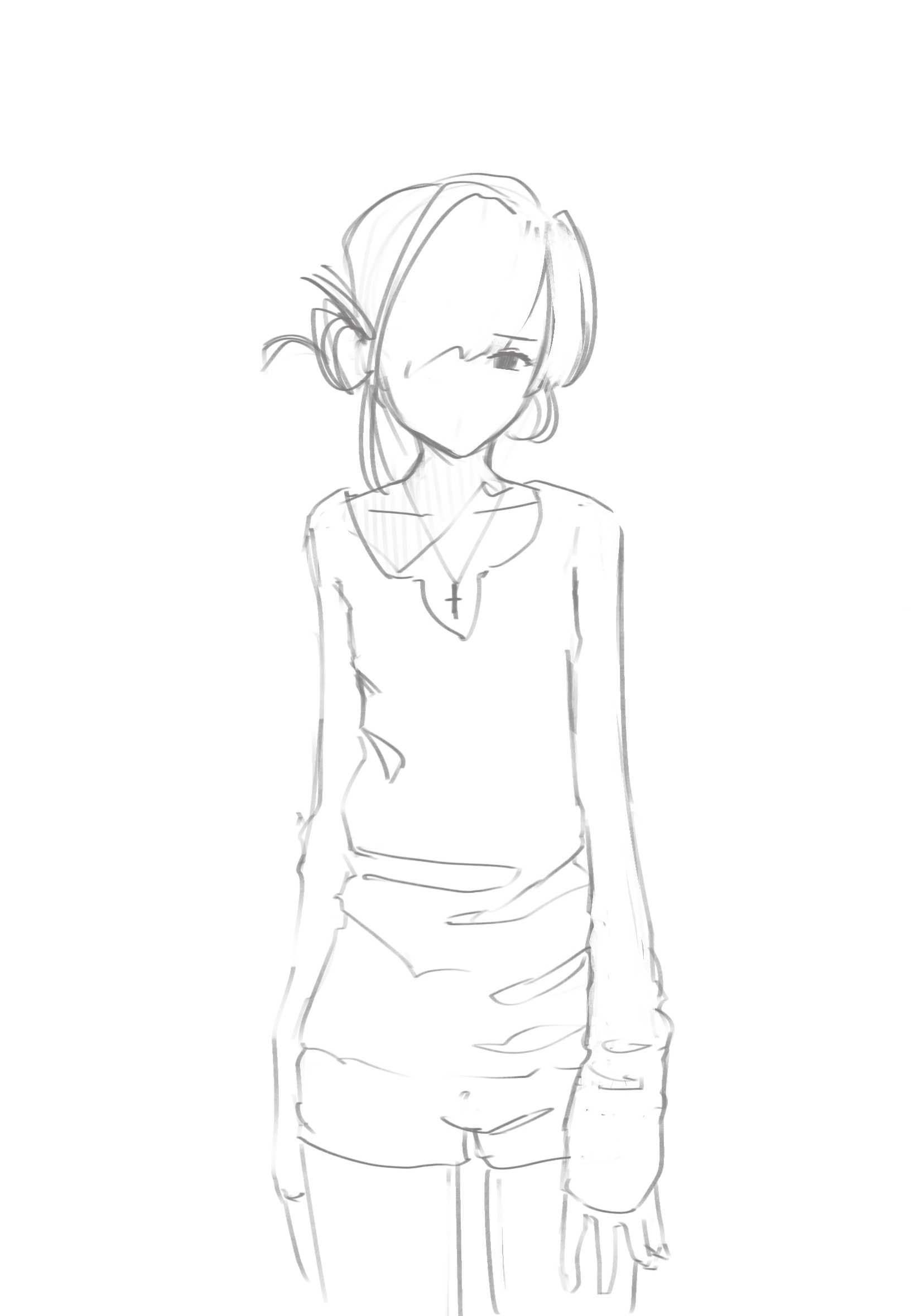 Короче под конец она действительно стала напоминать аниме тянку, но теперь даже я запутался в какой позе она сейчас вообще находится. Толи она смотрит направо чуток наклонясь, толи она просто стоит прямо, но под углом. Челка в этот раз решил нарисовать новую, но и в этот раз она выглядит неправильно.