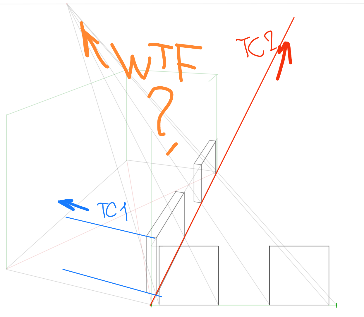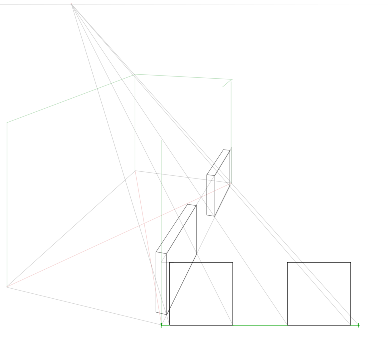>>905194 В выборе горизонта и точки схода. у тебя разные горизонты, а ты между ними строишь проекции. У кубов горизонт проходит через сами кубы, а у прямоугольников ты смотришь на них сверху.