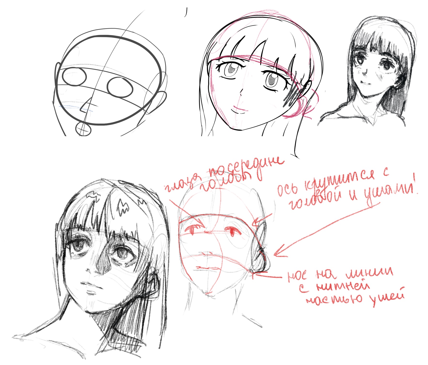 Подскажите сейчас хотя бы по пропорциям и анатомии вышло нормально? Как нормально рисовать челки? Я читал что они должны как бы огибать тот самый круг в обьеме. И что с ушами?