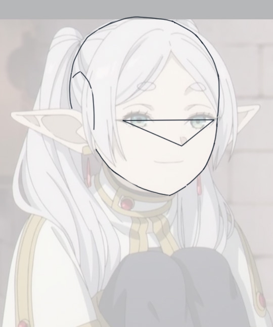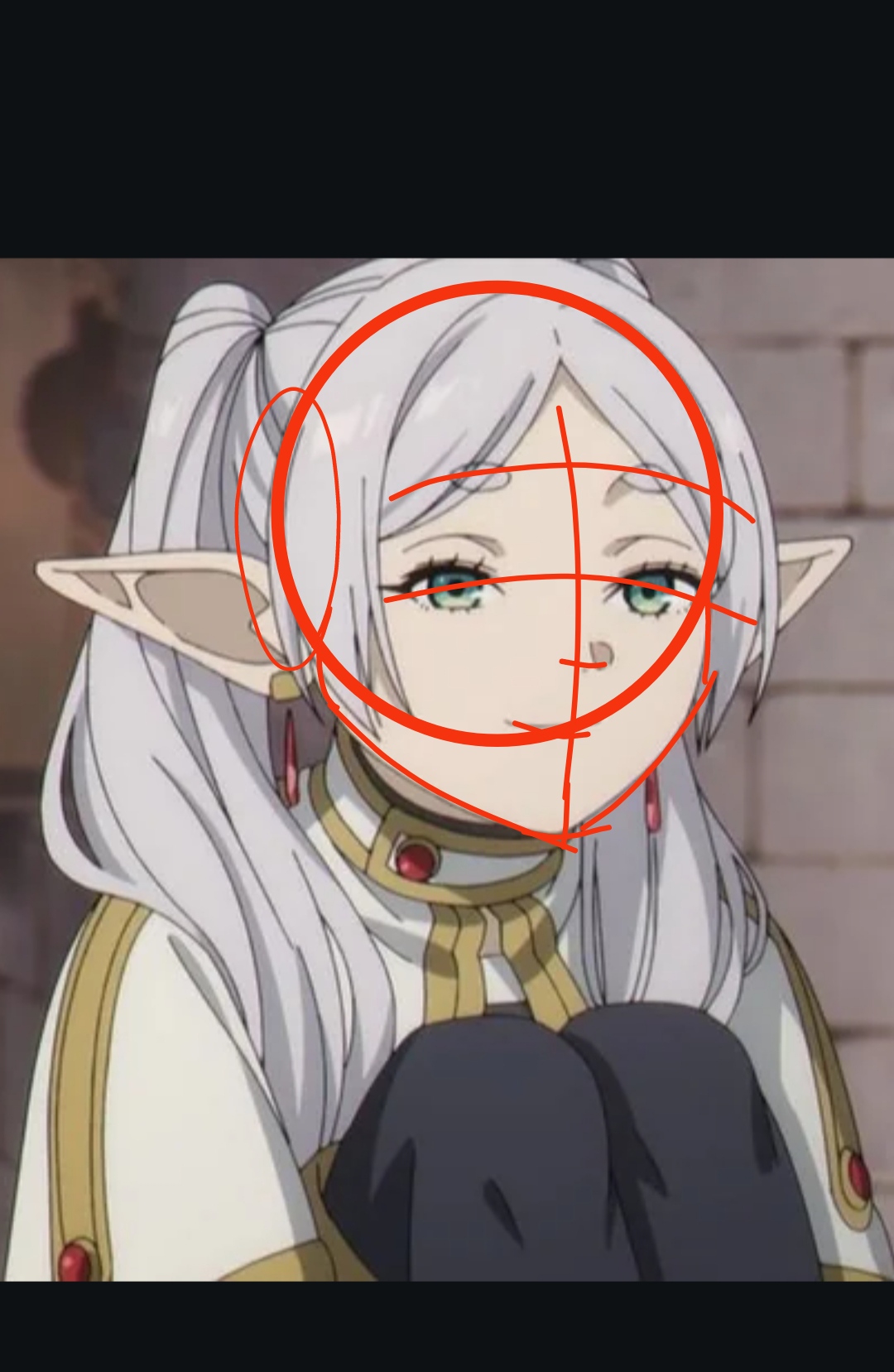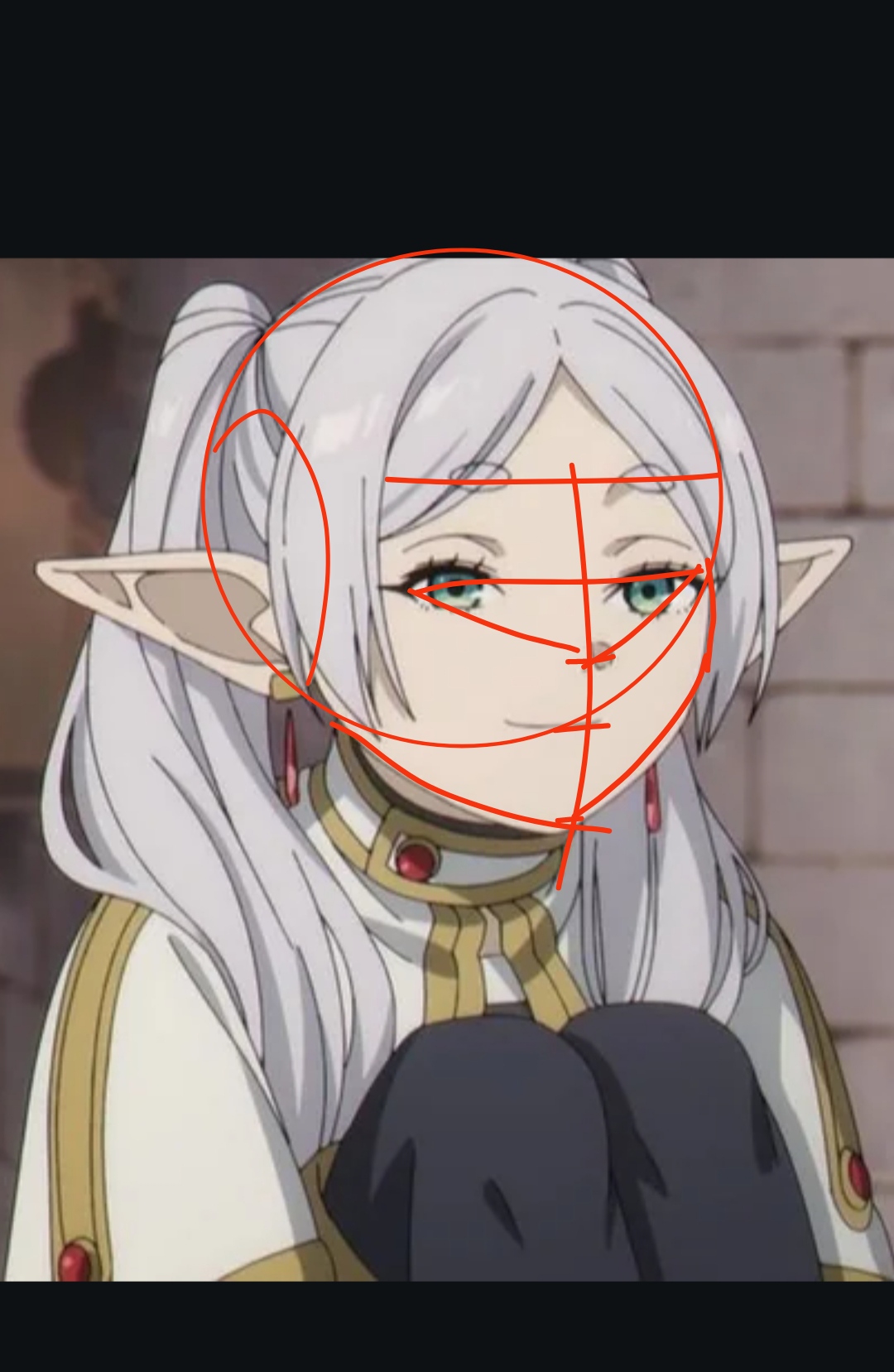 А пока по совету чиллю и срисовываю понравившиеся и простые анимешки в свой скетчбук, стараясь понять как они были нарисованы. Можете проверить правильно ли я расставил пропорции головы у этой Фрирен? Интересует еще и плоскость черепа сбоку, из-за волос прям трудновато определить.