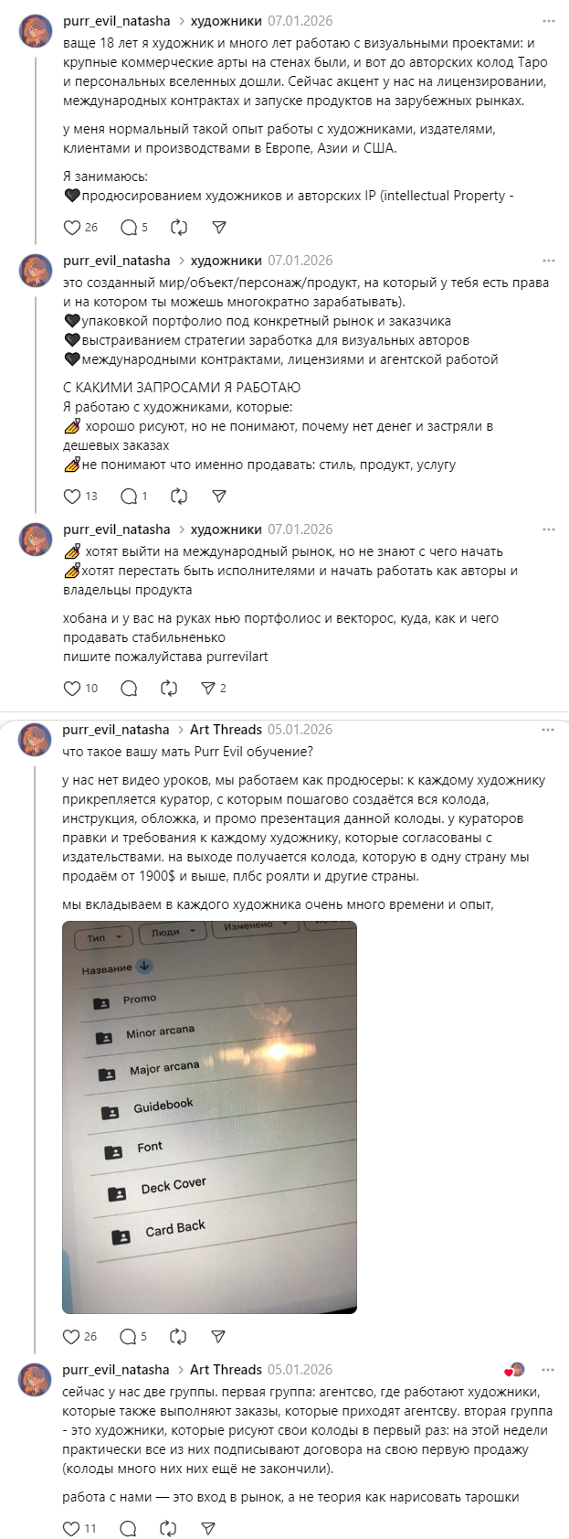 Само собой у неё есть свои курсы, тренинги по рисованию. Есть целое агенство хуёжниц, где жирухи рисуют ей таро. В своих чатах она просит деньги в долг у каждой жирухи ЛИЧНО, лол. Постила в рисовательных соцсетках фейк переписки, как её хуесосит мать за то, что та предала родину. Пиздела, что рисовала для штаба насрального, что её муж работает в иноагентских сми. Что она убегает от политического преследования и ей нужна помощь. Подсосалась к какой-то конторе, которая помогает эмигрантам с док-ами. Понаёбывала там кучу гоев лично. В 24 году, когда она уже съебнула в грузию, в рф на неё завели дело по мошенничеству.