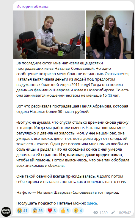 Послушал подкаст жирушный про Соловьёву. Ну и пиздеец. Кто-то слышал про неё раньше? Кратко что там: Очень талантливая тяночка-художница с очень очень трагичной жизнью. Живёт тем, что наёбывает гоев ВСЮ свою жизнь. Долги исчисляются миллионами, наёбанные гои - сотнями. Причём она наёбывала не только через инет лол. И друзей и коллег ирл. По 10 раз у неё умирали сын, муж, отец, брат, сват. По 10 раз у неё были инсульты, рак, атеросклероз. Она потеряла глаз и ей вставили имплант (эту историю она спиздила у жирушницы, которая реально потеряла глаз кек). При этом она на видосах постоянно меняет повязку местами. Её фейковую переписку, где её типо хуесосит заказчик за то, что она безглазый инвалид и отказывается от картины обсасывали блохиры типо Варламова. Её даже в новостях показывали по тв, лол. УУХ КАК АБИЖАЮТ БЕДНУЮ ХУДОЖНИЦУ, СВОЛОЧЮГИ! Какой-то юрист написал ей по поводу этой истории, заобщался и несдержался. Симпанул и скинул тяноске-писечке полляма "на лечение". >Ведь она так пыталась справиться со всем сама. Говорила такие тёплые слова, несмотря на все трудности. Она была таким вдохновляющим примером.