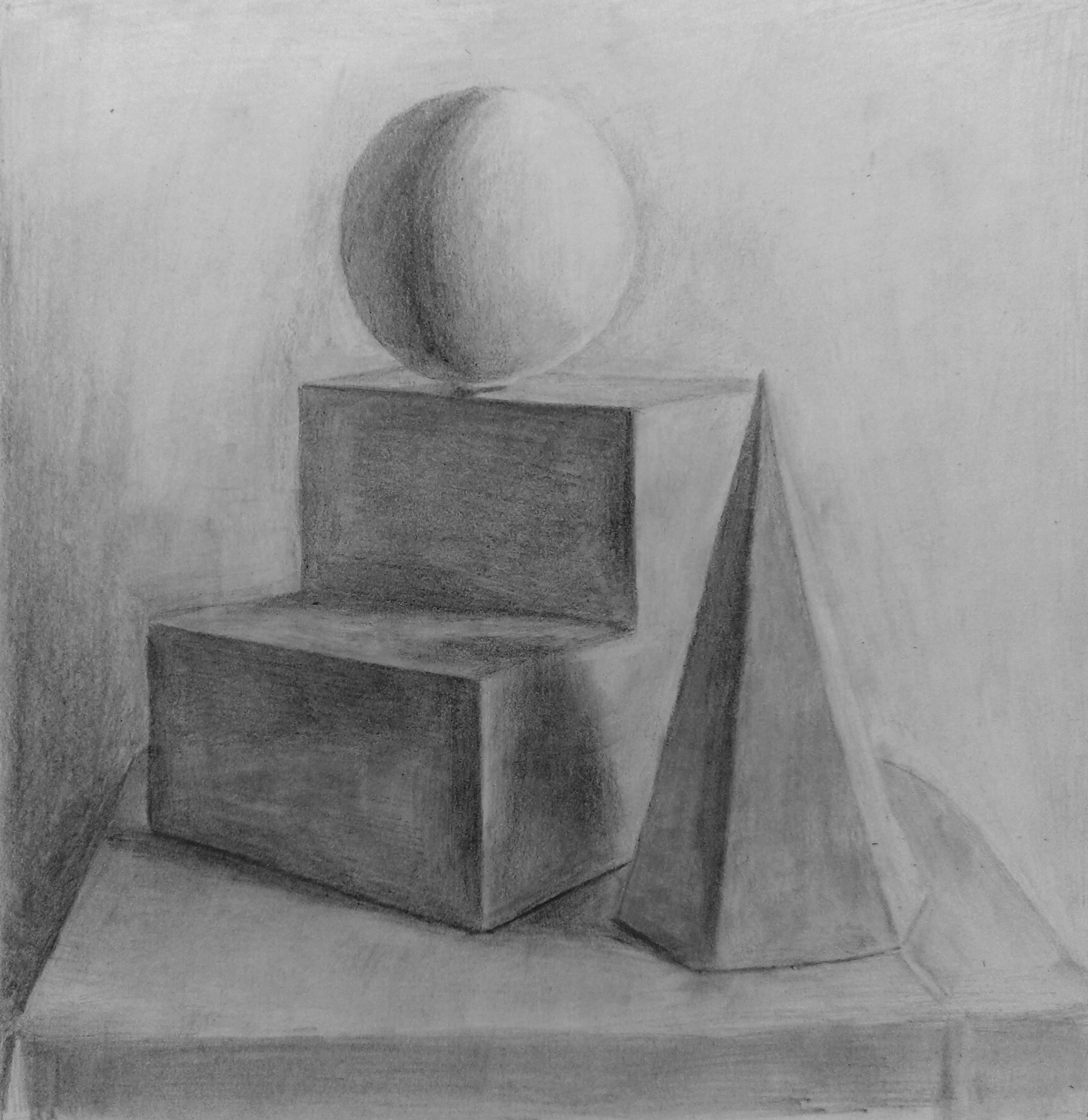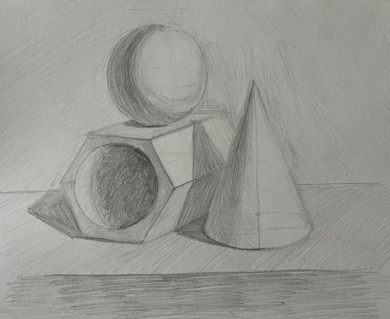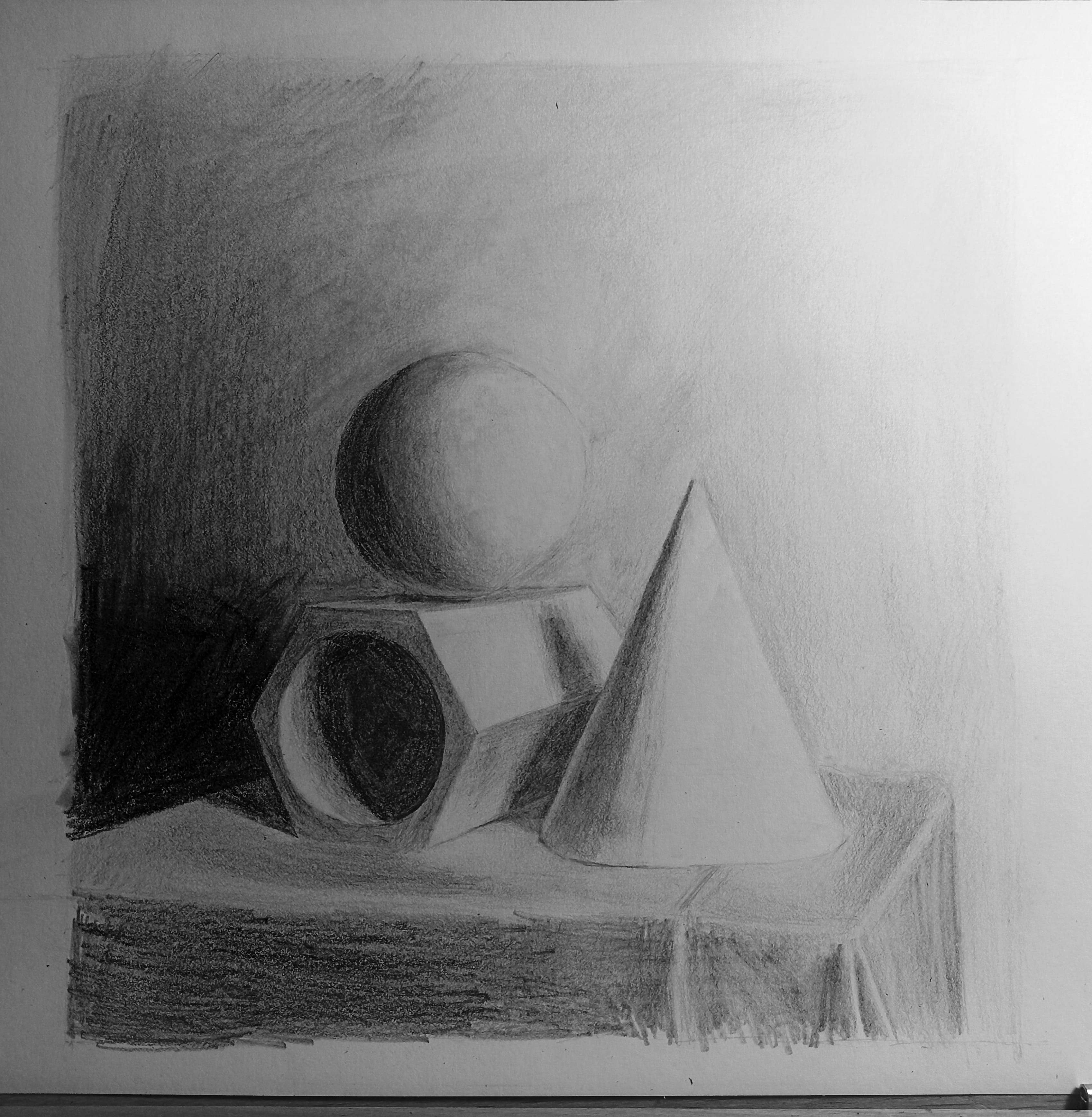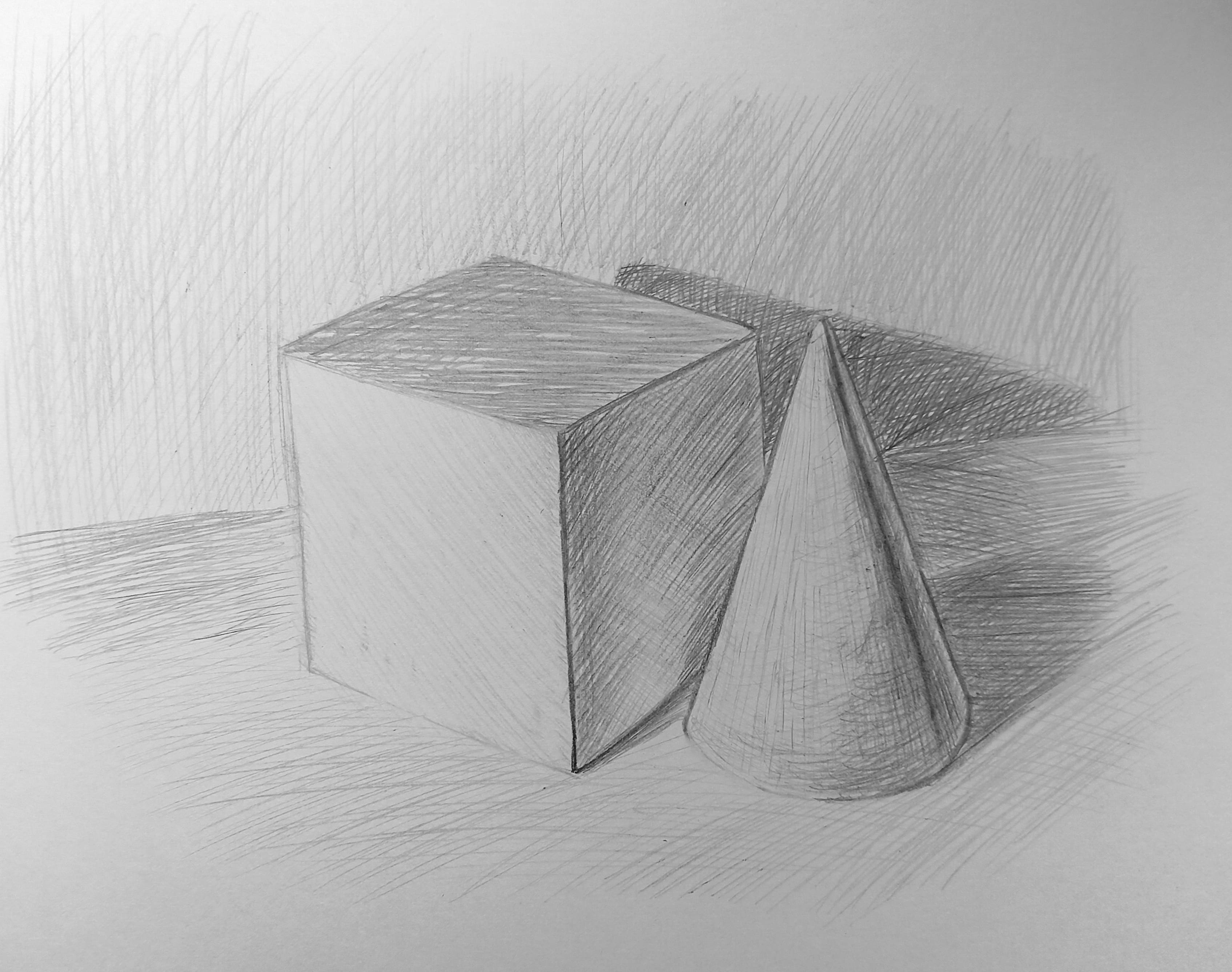 Ластиком жирную нижнюю грань куба подтер, только когда заштриховал заметил что она слишком высоко теперь...Блик высоковат... Я слишком был погружен в кривульный штрих. Криво-косо, но зато он хотя-бы осмысленно выглядит (местами).