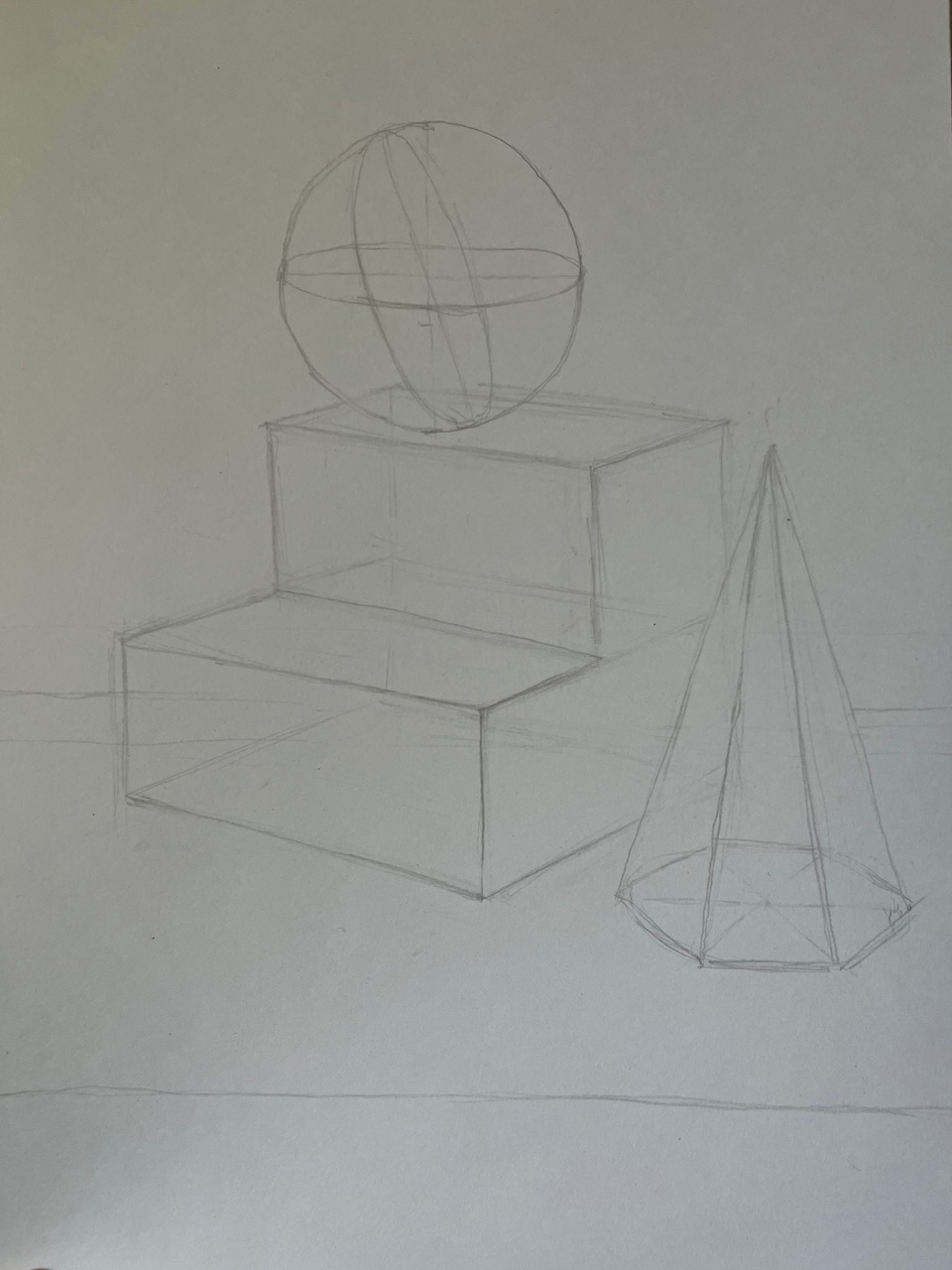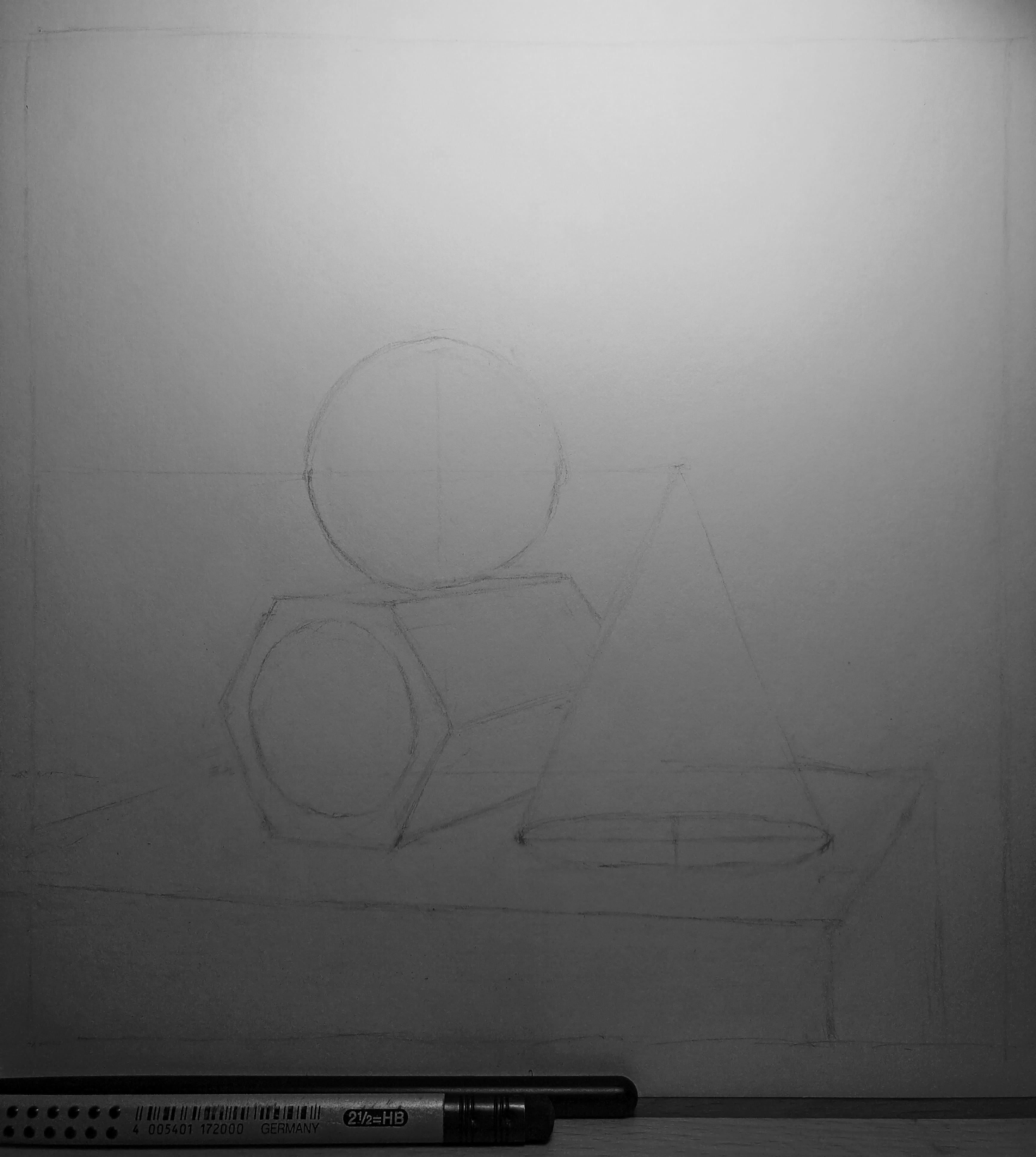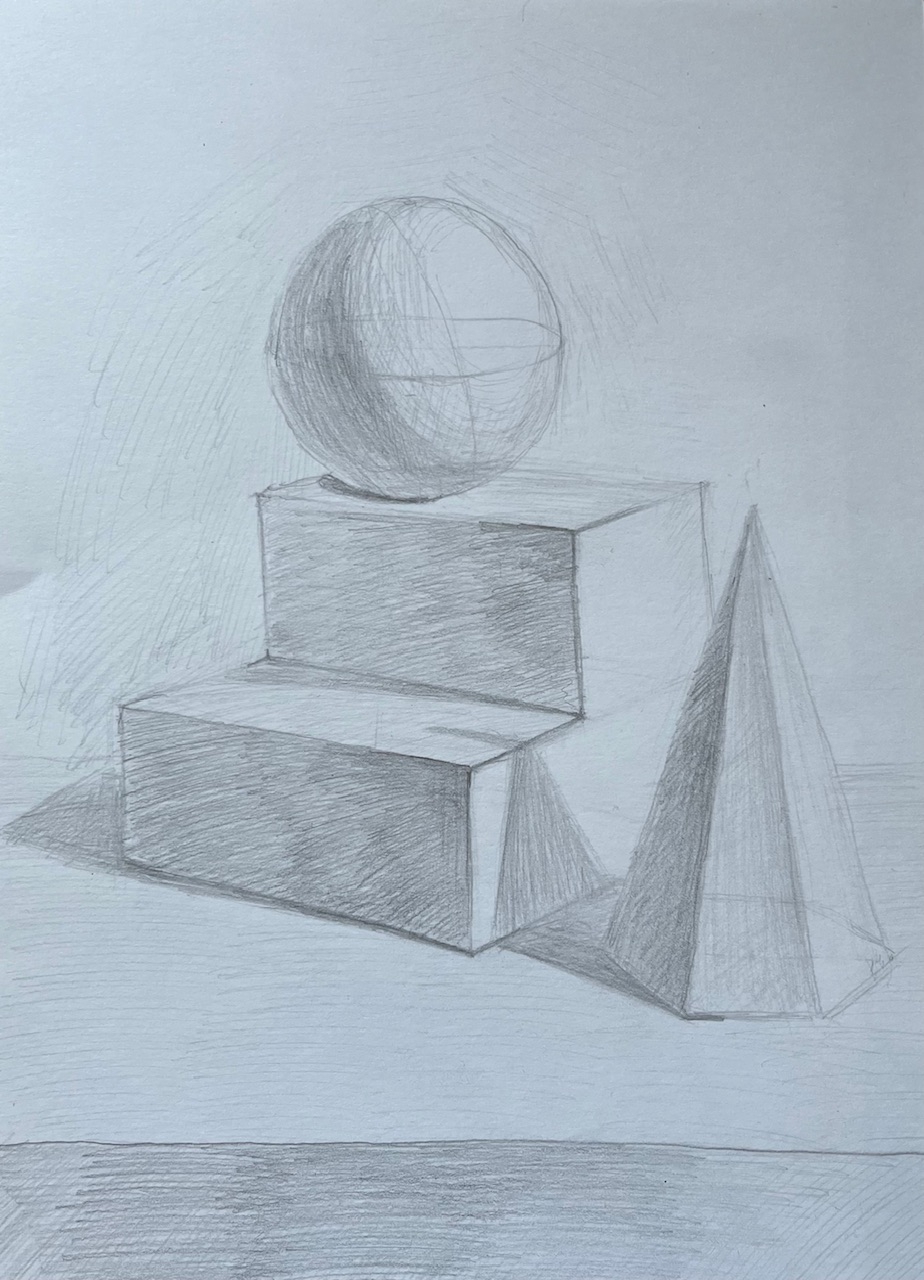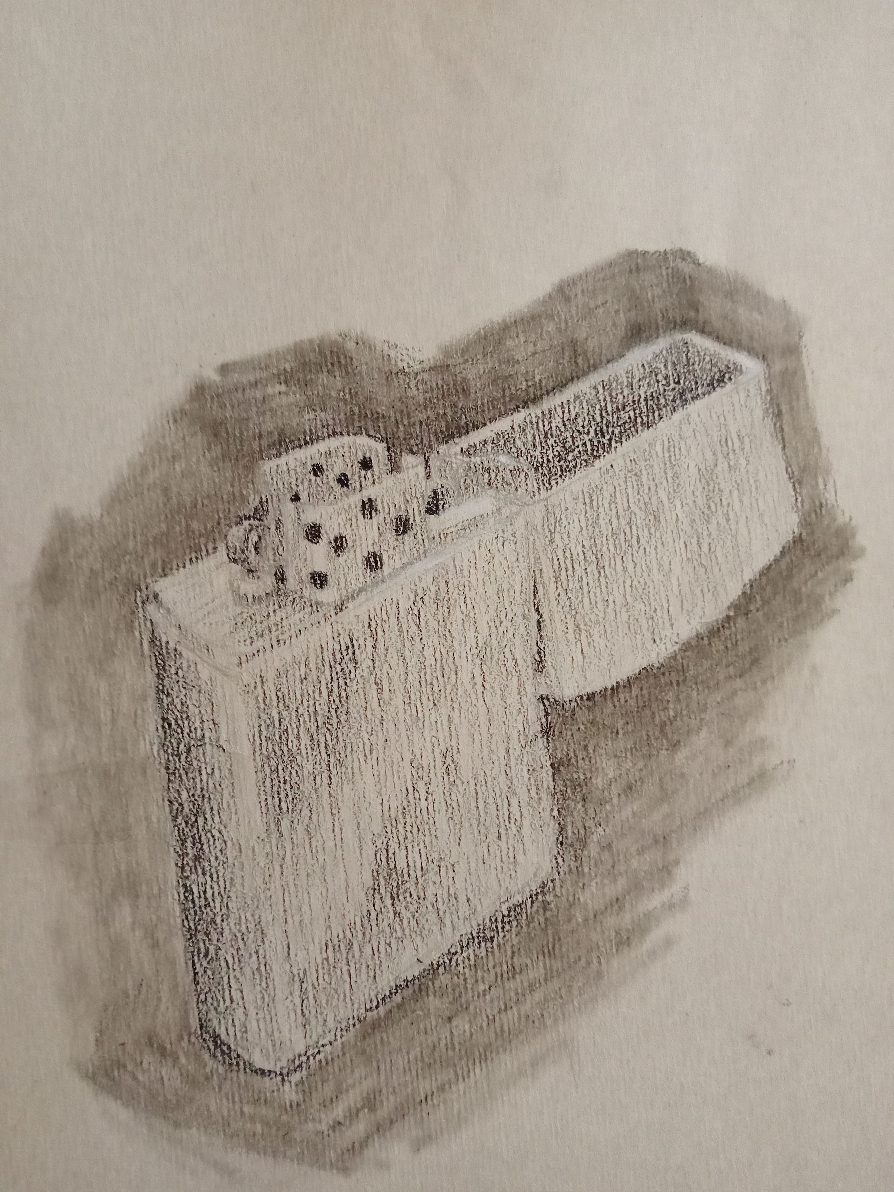 Ластиком жирную нижнюю грань куба подтер, только когда заштриховал заметил что она слишком высоко теперь...Блик высоковат... Я слишком был погружен в кривульный штрих. Криво-косо, но зато он хотя-бы осмысленно выглядит (местами).