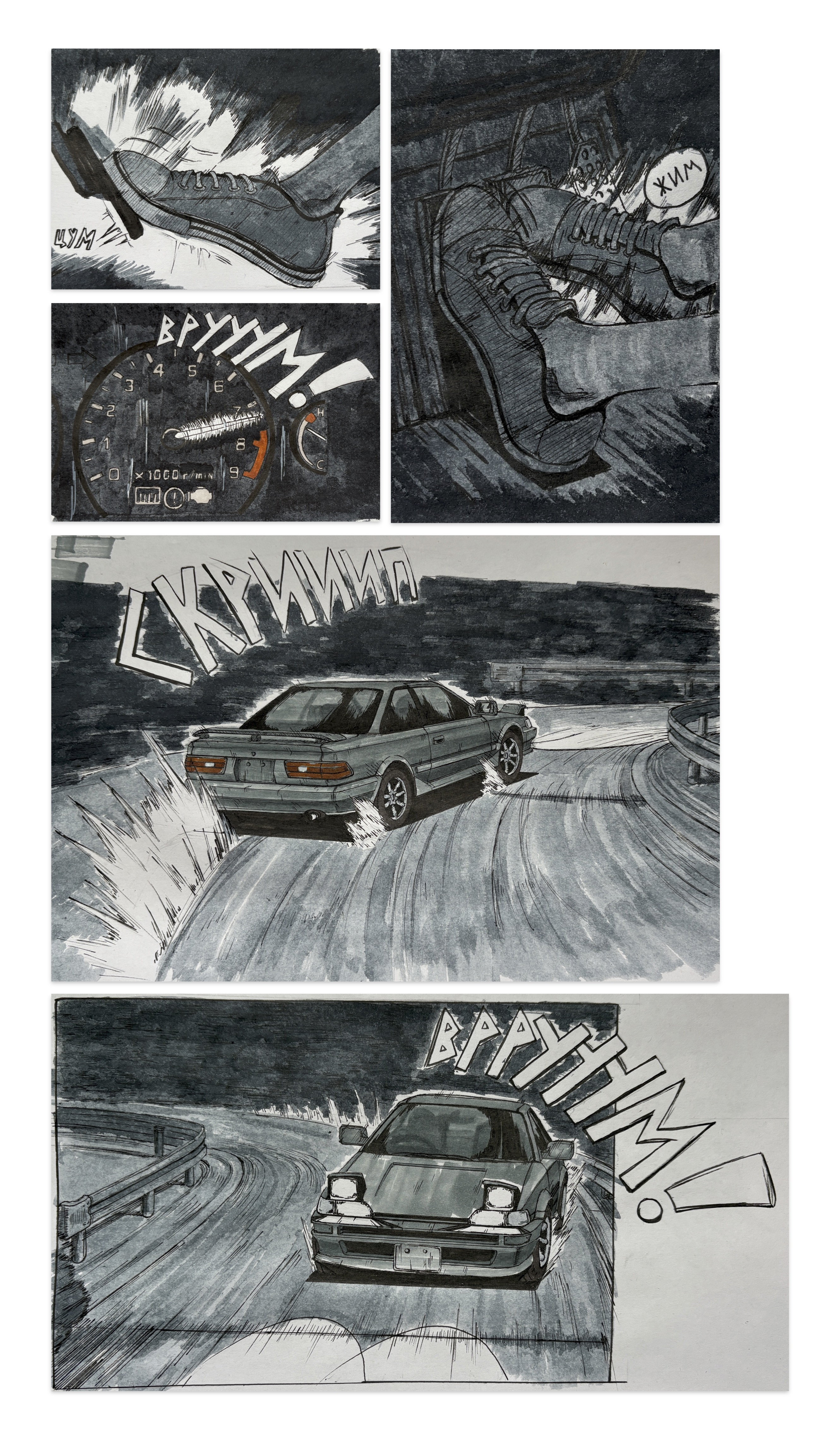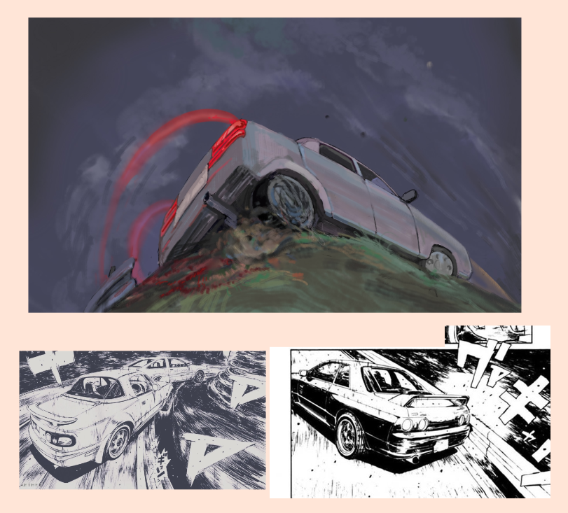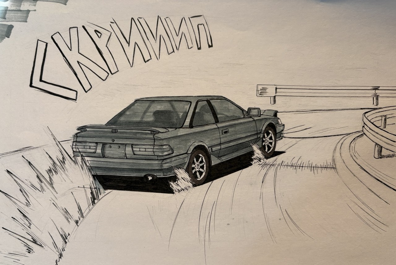 >>923504 → в глаза в первую очередь бросается что по пропорциям машина какая-то толстая и мыло под колесом. потом становится видно что композа как то плохо передает смысл происходящего на редлайне вообще хочется эту машину как угодно сдвинуть, лишь бы вот этого ракурса снизу вверх не было, но я его оставлю потому что чертить всю машину в новом ракурсе я точно не буду, плюс опять будут ныть что ракурс поменял и поэтому нещитово >пропорции если у тебя окна занимают где-то 2/5 высоты машины, то и в фишае тоже должно быть 2/5. на пикче окна очень маленькие, из-за чего машина выглядит ненатурально. машина в целом слишком квадратная и задница слишком большая как по мне, если смотреть на страницы из того же инишл ди, то там мангака, кроме железного соблюдения пропорций, всегда четко отрисовывает крылья, бамперы, изгибы и швы на корпусе >мыло на машине кисть применена вполне себе, потому что там ты в принципе понимал как форма изгибается (квадратно, но все таки), а на земле ты в принципе не понял как форму горы с травой показать и поэтому развел мыло в нормальном случае нужно мягкие переходы формы показывать мягкой кистью, а жесткие жесткой. грубо говоря бок цилиндра можно показать мягкой кистью, а торцы отделить от него жестко с травой все довольно просто, потому что у низа пучка все можно заливать мылом, потому что там расстояние маленькое, а сверху жестко очерчивать силуэт каждого куста, потому что там больше расстояние >композиция композиция это отчасти умение располагать предметы в кадре, так чтобы зритель увидел и понял все, что изображено на картинке. в этом кадре много места занимает небо и это наверное хорошо, но масса машины и масса горы во1 сливаются, а во2 похожие по размерам в кадре. что-то одно должно быть больше или вообще не должно быть в кадре. акцент должен быть на тачке, поэтому все остальное я бы верызал/уменьшил максимально. в целом если вы можете что-то из кадра вырезать за ненадобностью, это надо вырезать. еще из важного, в инишл ди, четко видно что машину в кадре заносит от того направления в которое она дрифтует. т.е. если машина едет направо, то она в левой половине кадра и наоборот. у тебя она дрифтует направо/к центру кадра, и находится справа/в центре кадра. еще там постоянно показывают противника в гонке, который немного впереди, это тоже стоит добавить >идея при таком вылете машина или встречает лбом гору, либо вываливается за барьер, не очень понятно какой исход должен быть. я это максимально обрежу потому что иногда надо все таки уменьшать себе количество жопочасов за счет упрощения картинки