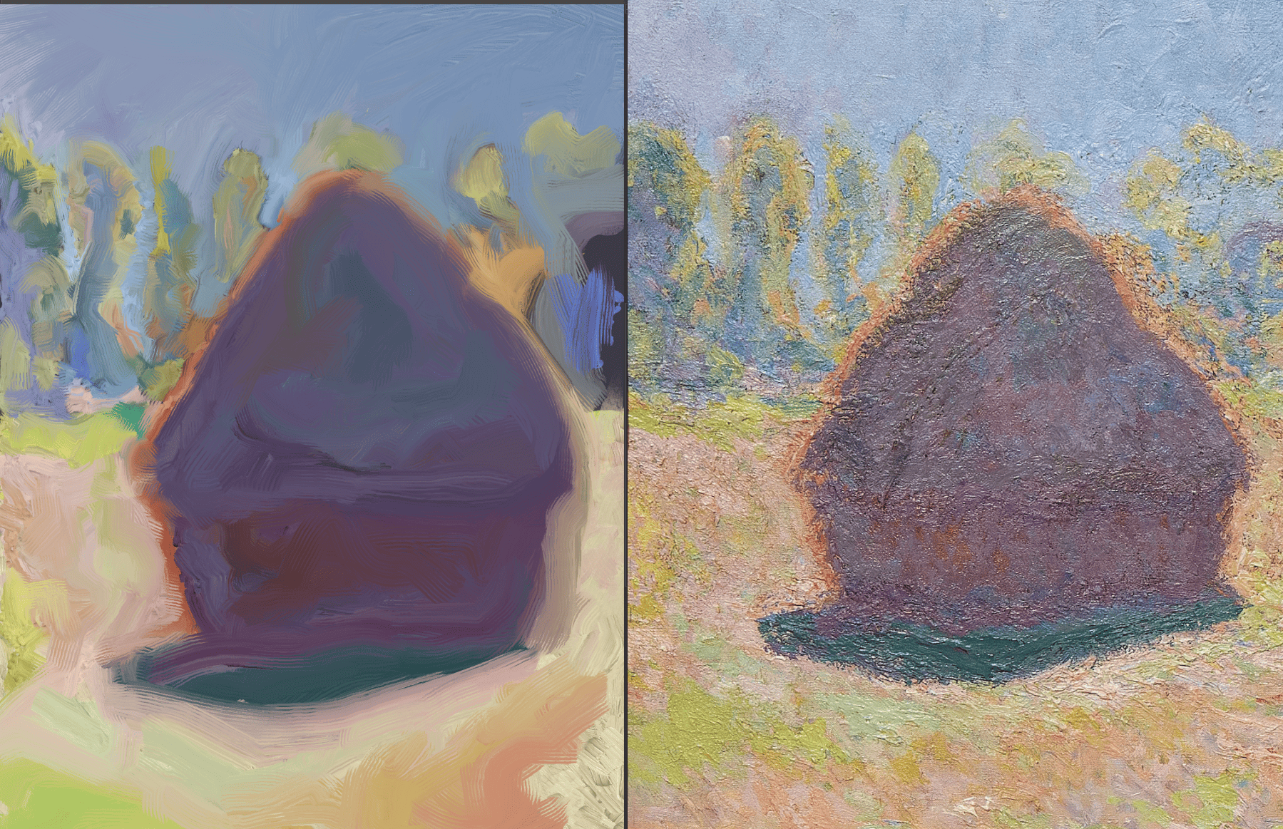 >>925761 Выразительность это буквально КПД на мазок\штрих в рамках композиции. Смотри на первый прикл в посте >>925759 . Посмотри на лес слева и справа моста. Детализация леса с права минимально выше детализации леса слева, что-бы можно было несколькими мазками прописать людей на берегу и они не сливались с лесом. При этом внутри картины при разной детализации того и другого леса, они занимают один план, сохраняют цельность. Это очень хрупкий баланс, который нужно искать и над которым нужно думать. Это ведь на самом деле гораздо более сложная структура чем акцент в виде четкой черной трубы у паровоза что служит центром композиции, но при этом это неотъемлемая часть картины. Вот о чем думал дед рисуя картину, а не ОООО МНЕ НУЖНО НАРИСОВАТЬ ВЙБОВЫЙ ЦВЕТИК!!! ВАЙБОВЫЙ ЦВЕТИК УИИИ!!!