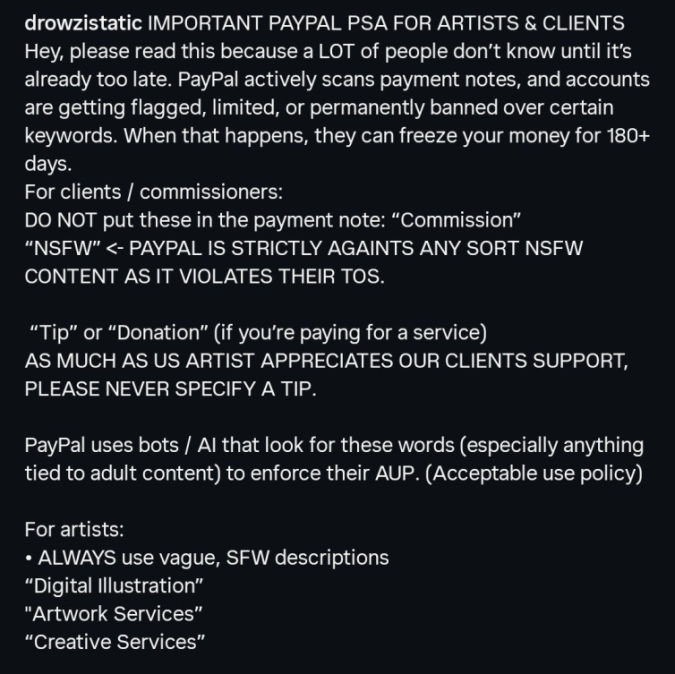 Но тендеция дерьма все равно. Хотя, нам может и к лучшему. Запинают всё nsfw в край, придётся всем от худов до игроделов юзать крипту для получения оплат — проще настроить приём зелёных, чем трястись на последних платформах с Палкой.