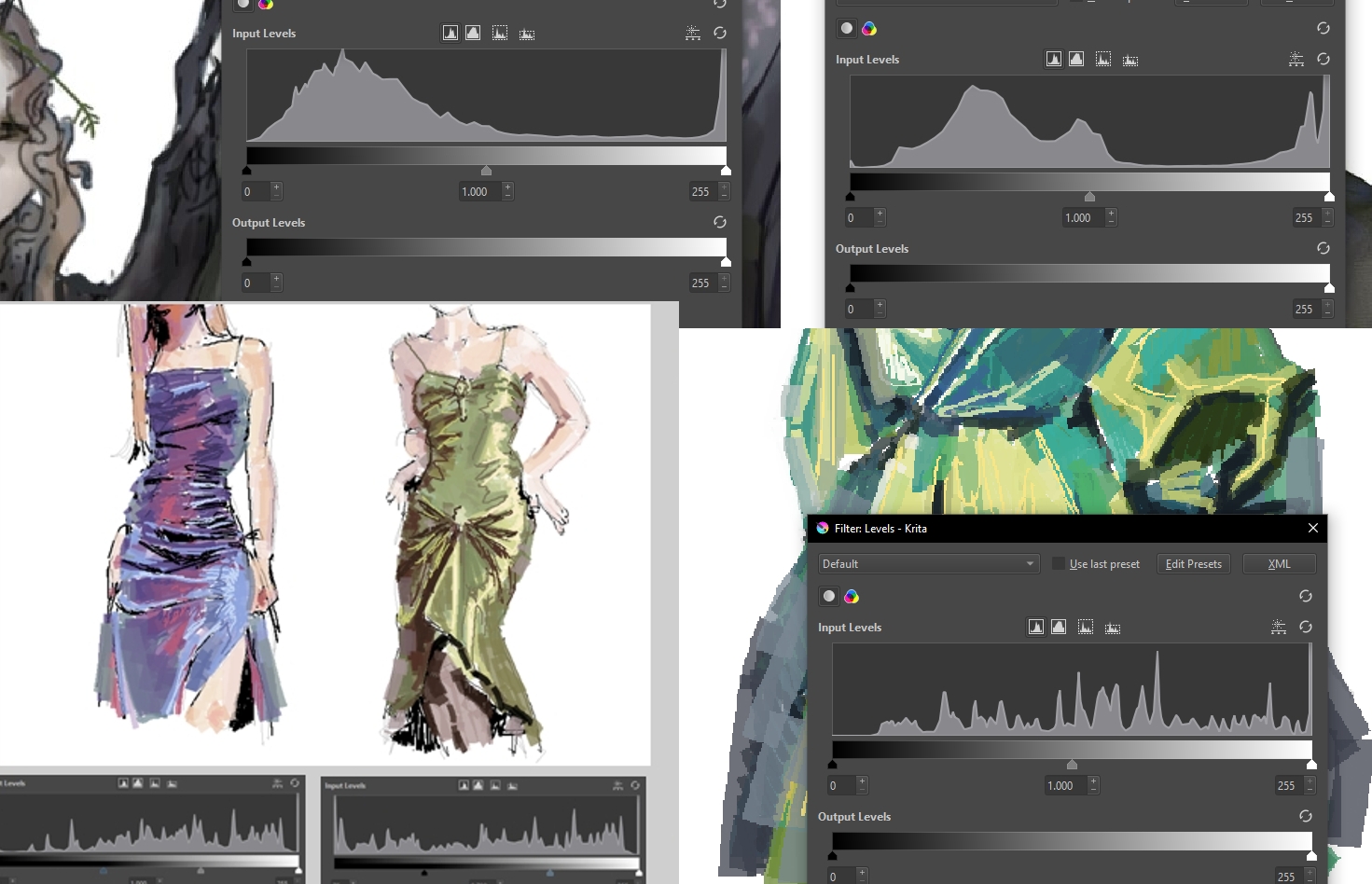 На одном твоём примере он даже тени вытнял, только чтобы не было сильно темного Если посмотреть на гистограмму, то находится ответ почему тебе кажется блёкло. Твои платья использую весь тоновой спектр, а на примерах - исключительно темную половину и лишь немного светлых. От этого создаётся ощущени большего контраста. Там еще обрати внимание что на свету у тебя в серые уходит, а на примере в чистый насыщенный цвет